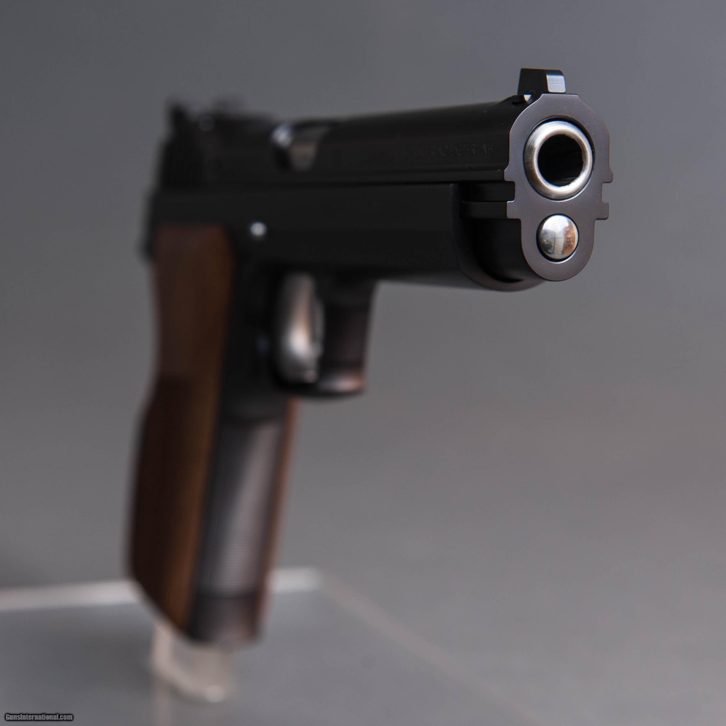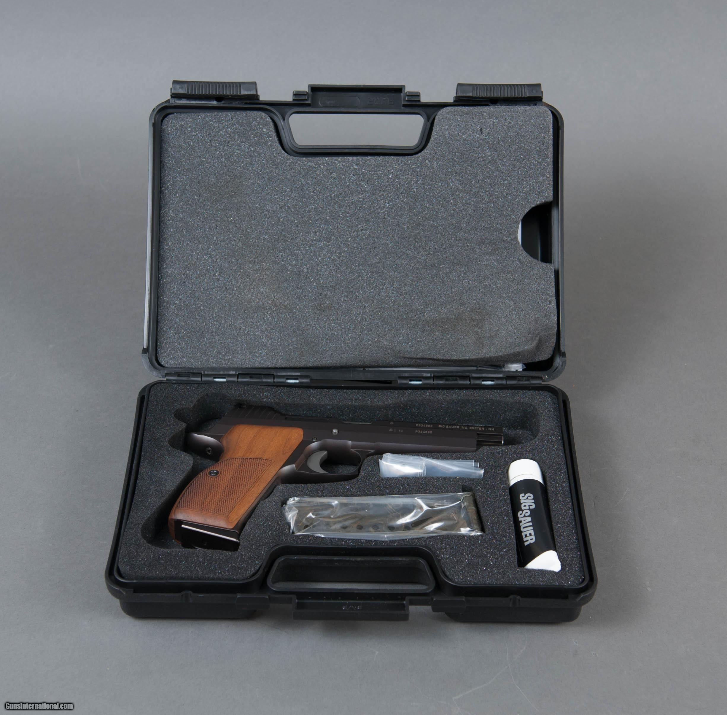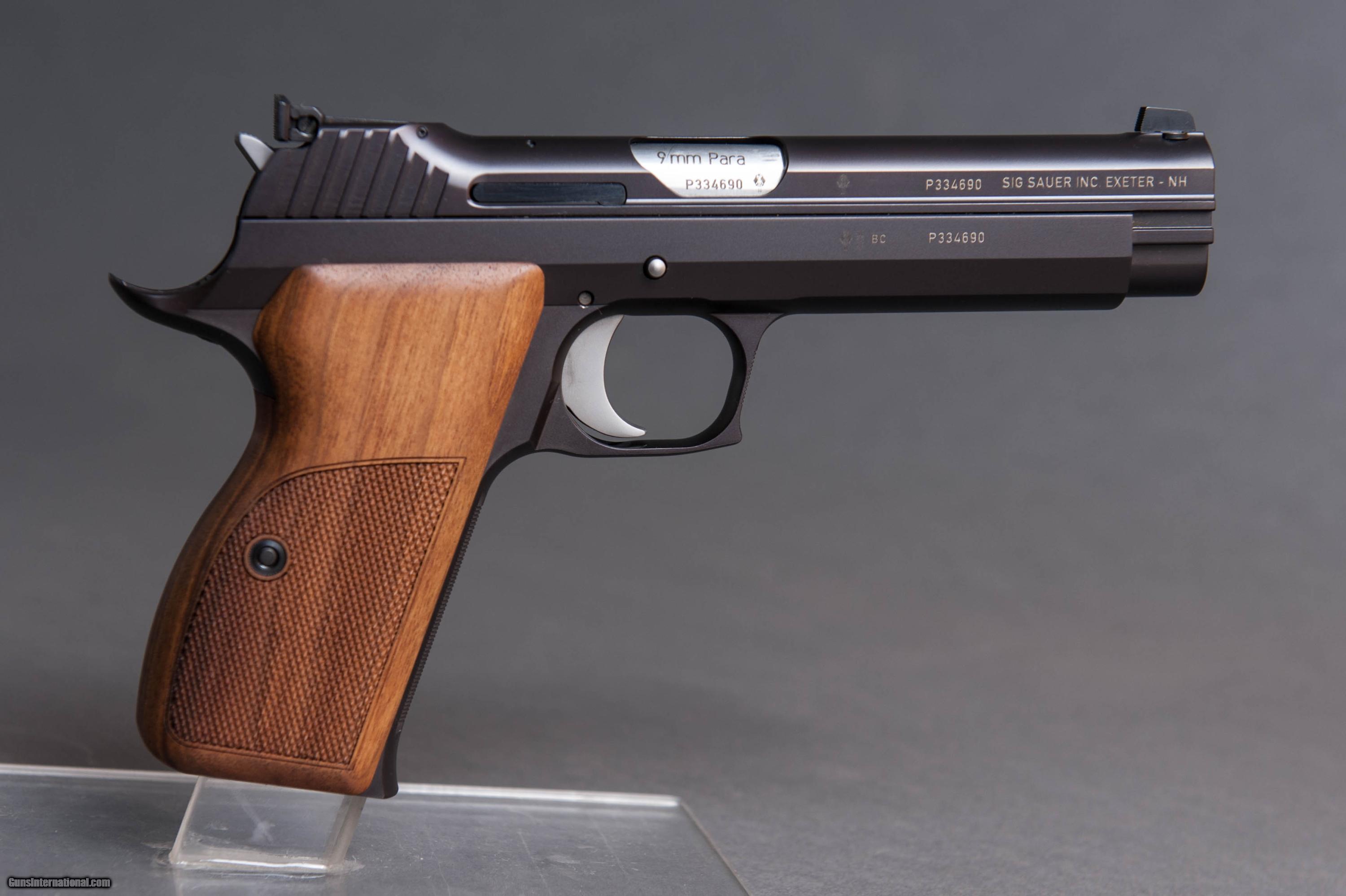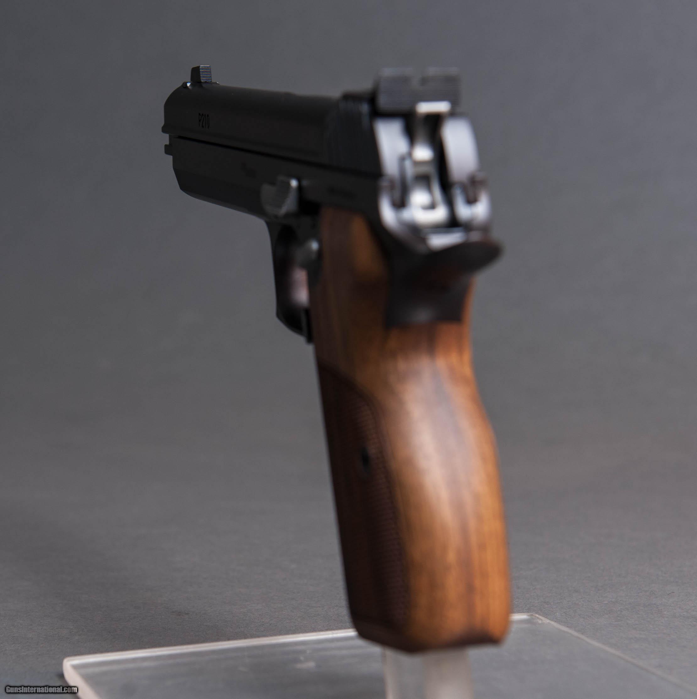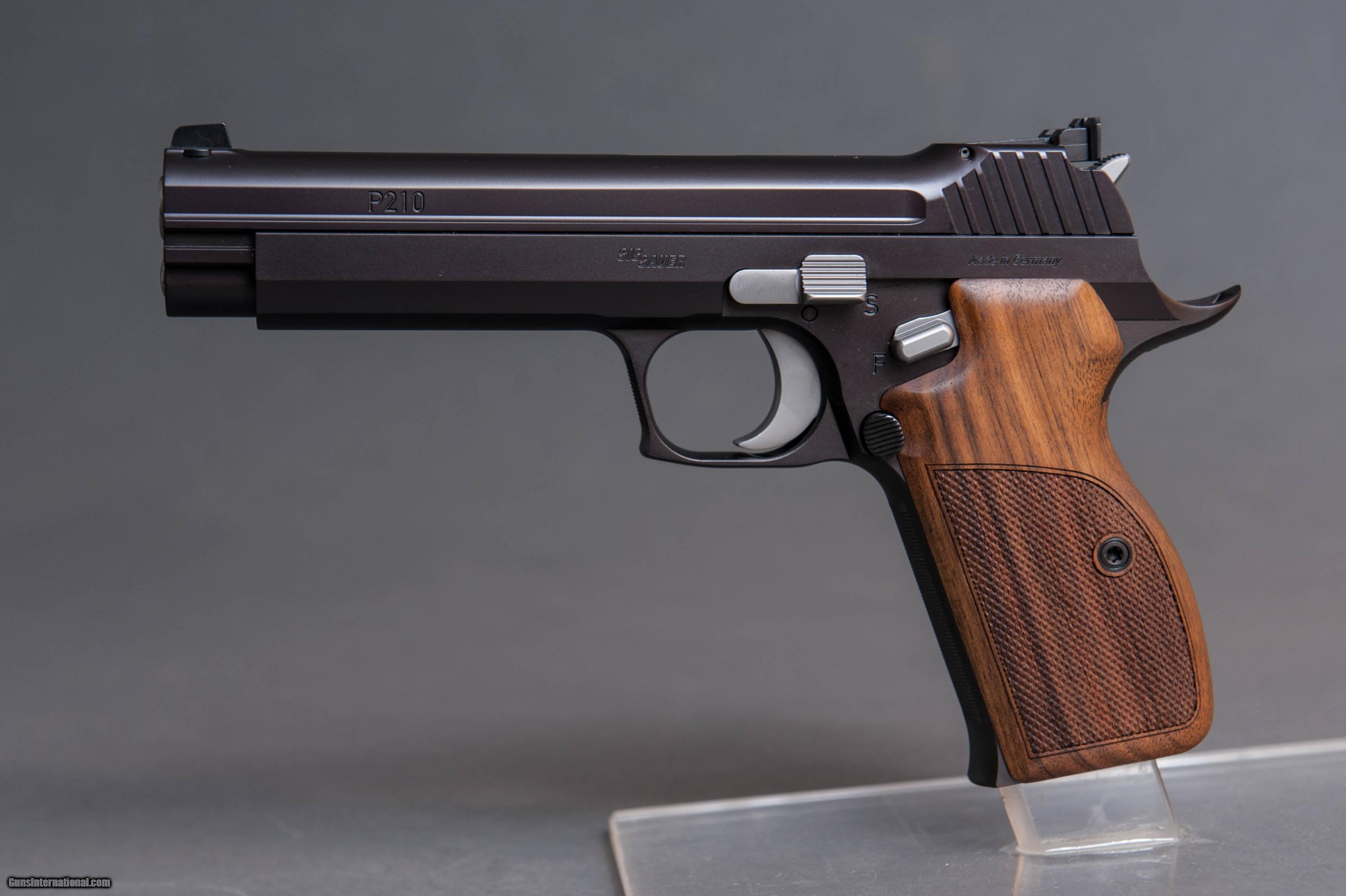 Description: Sig Sauer P210 9MM PARA Used **ACTUAL FIREARM PICTURED** Serial # P334690 ~USED FIREARM~ The slide machined from solid billet stainless steel is Nitron coated with a beavertail. Has an improved manual safety, internal drop safety, side magazine release, and custom wood grips. This firearm has NO VISIBLE markings and is in excellent condition. Comes with the Sig Sauer factory case and (2) magazines. Specifications