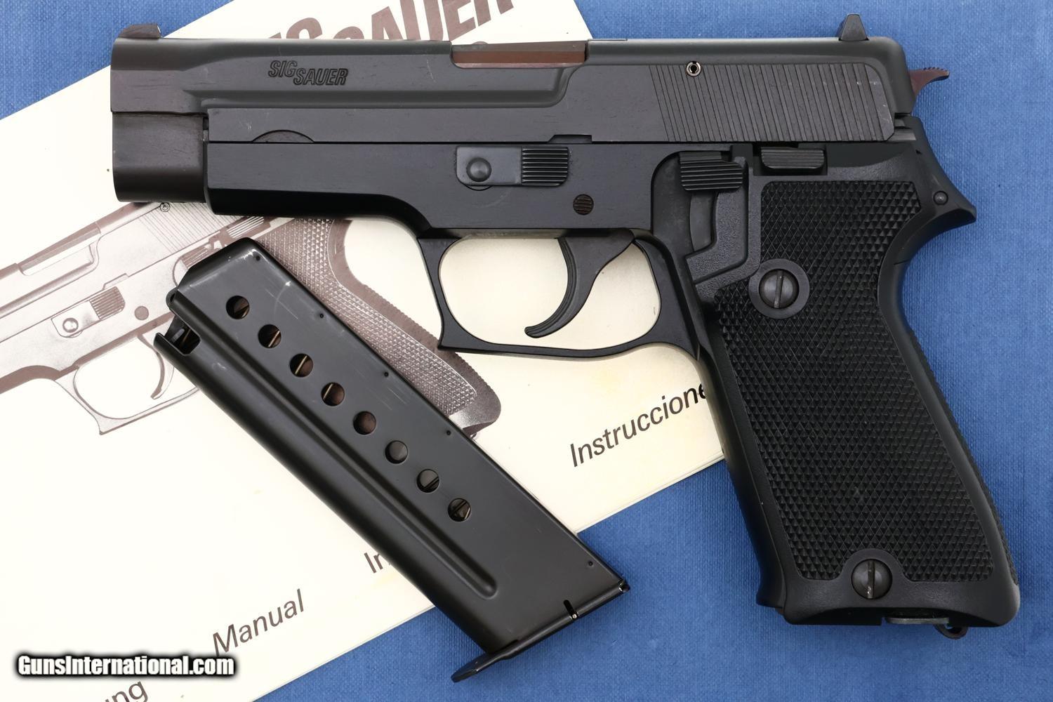 Virtually New SIG Sauer P220, earliest variation 9mmP with folded slide and bottom magazine release, in matching blue box with multi-language instruction booklet. If you collect SIG Sauer pistols, it doesn't get much better!