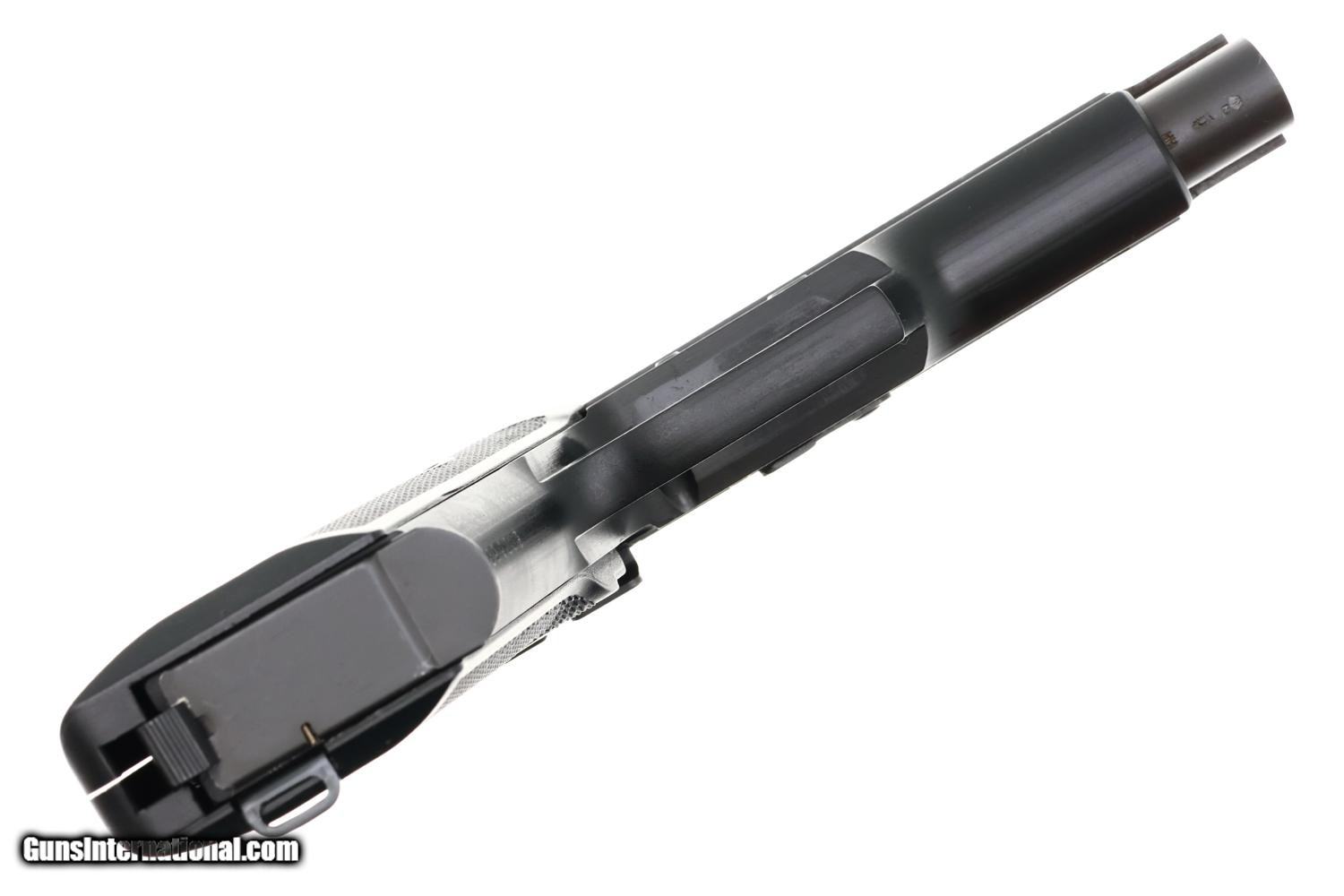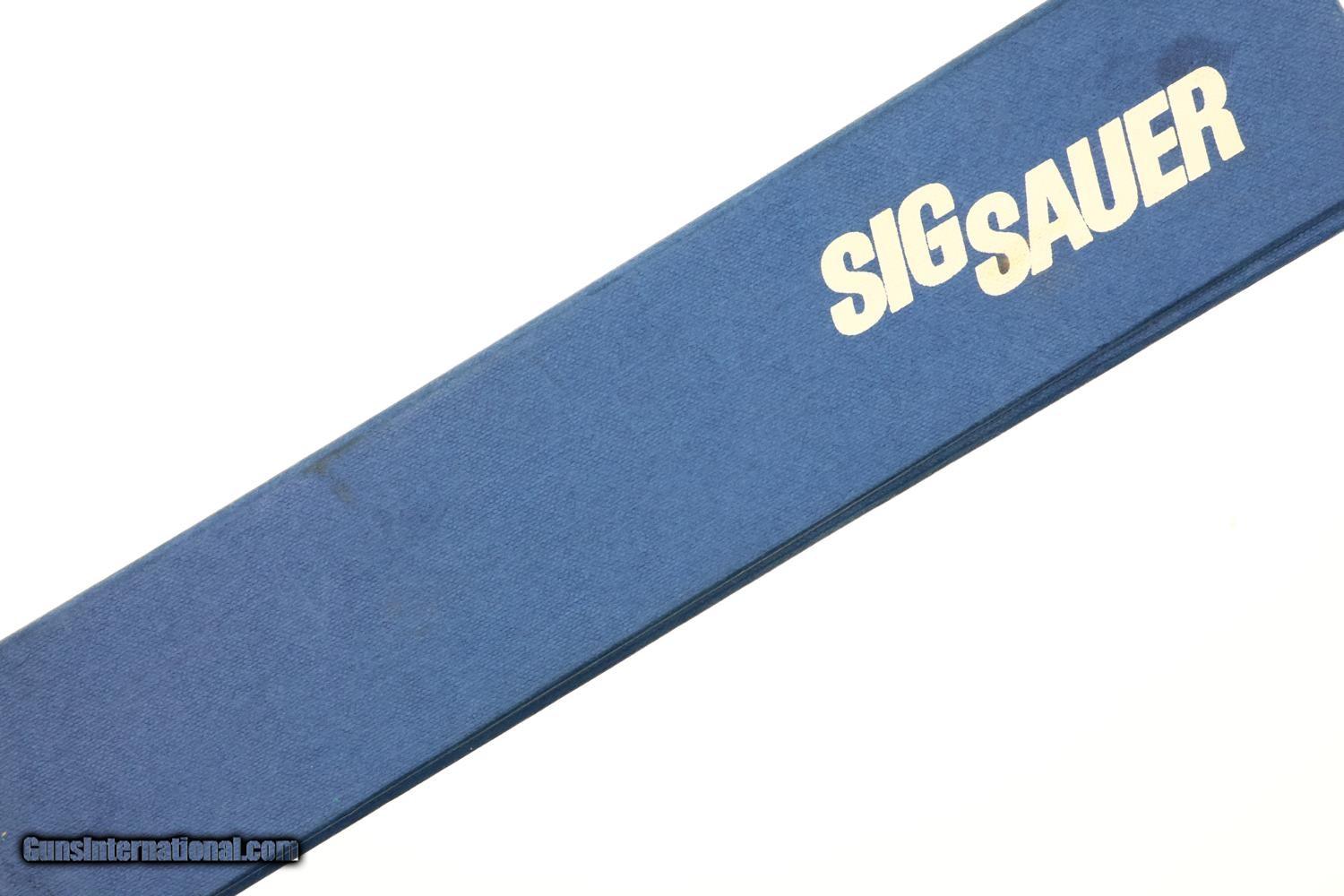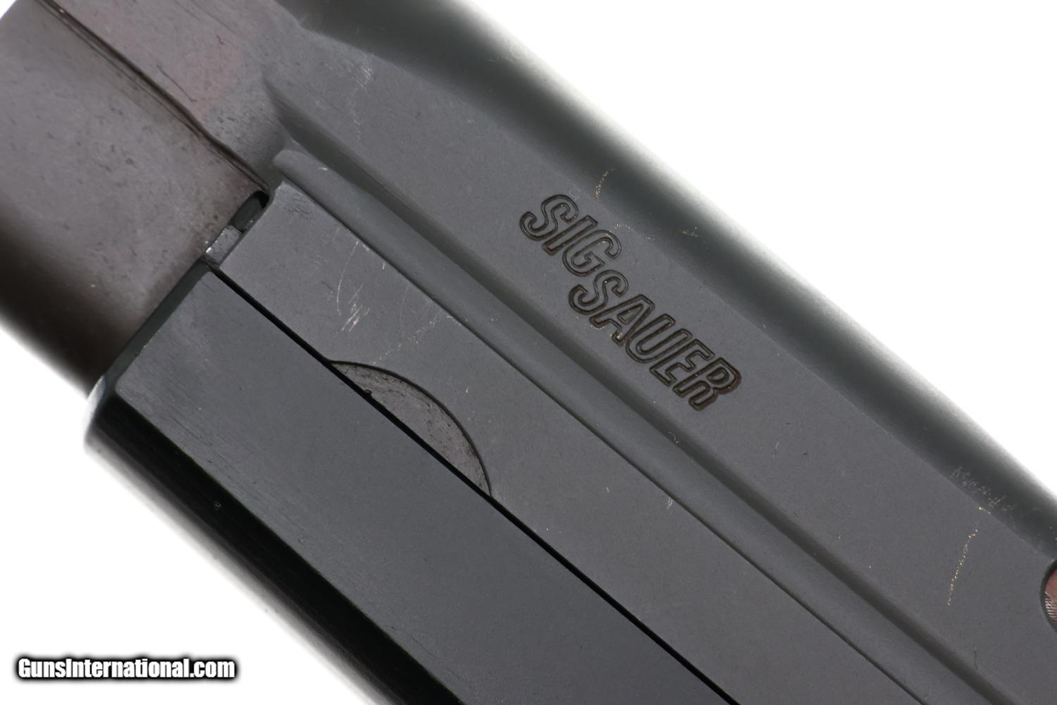The pistol presents as virtually new. There is no sharp edge wear or areas of thinning. The few marks on the barrel hood reflect normal safety checks. Comparable condition grips, screws, magazine, and instruction booklet. Mirror bore. Correct manual mechanics. The box shell is near excellent, the gray foam liner, crumbling/disintegrating after so many years, has been removed. If you are a serious Sig Sauer pistol collector, this early example would be nearly impossible to upgrade!