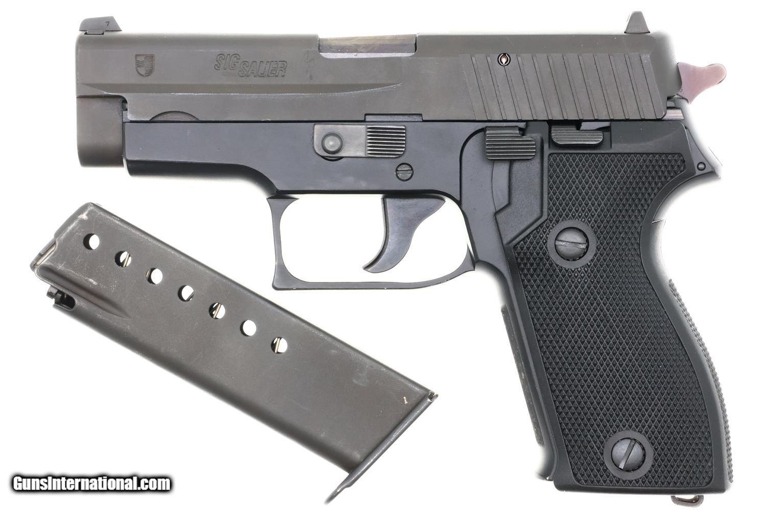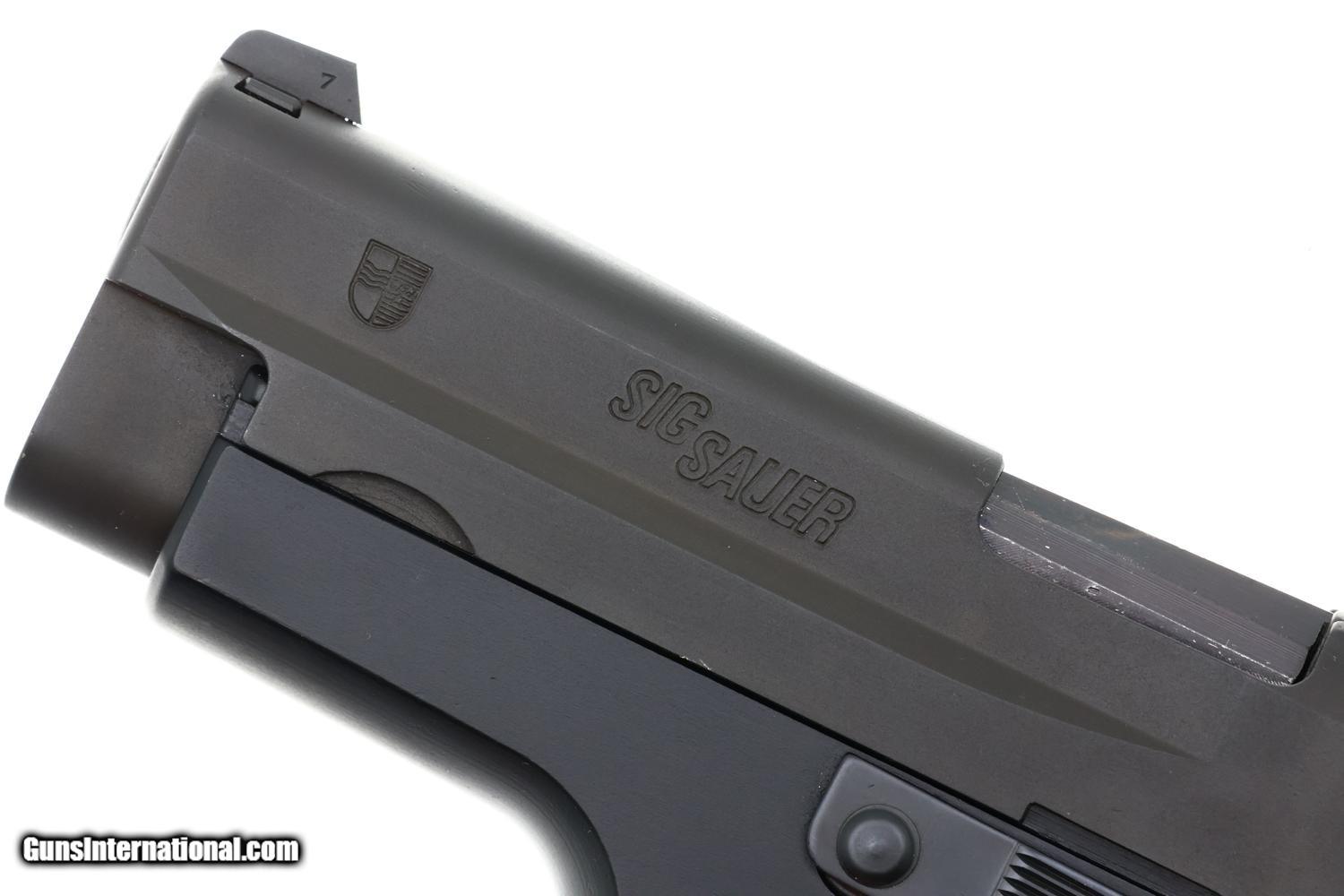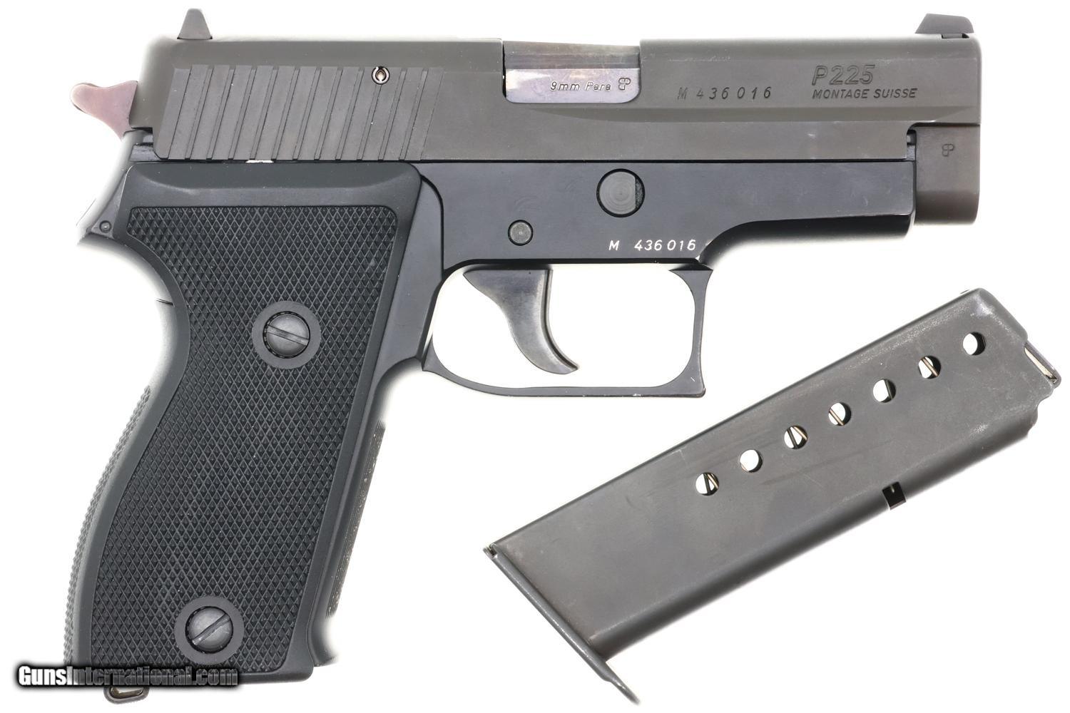 Gorgeous SIG Sauer P225, cal. 9mmP, made for Aargau police, with fixed front and drift adjustable rear sight. Aargau canton shield and SIG Sauer marking on left side of slide. Right side marked with the model followed by "Montage Suisse" (assembled in Switzerland). Full serial number repeated on the right side of the slide, barrel hood (inner surface) and the right side of the frame. Standard black plastic checkered grips and bottom magazine release. Complete with white SIG logo ceremonial/parade P225 holster.