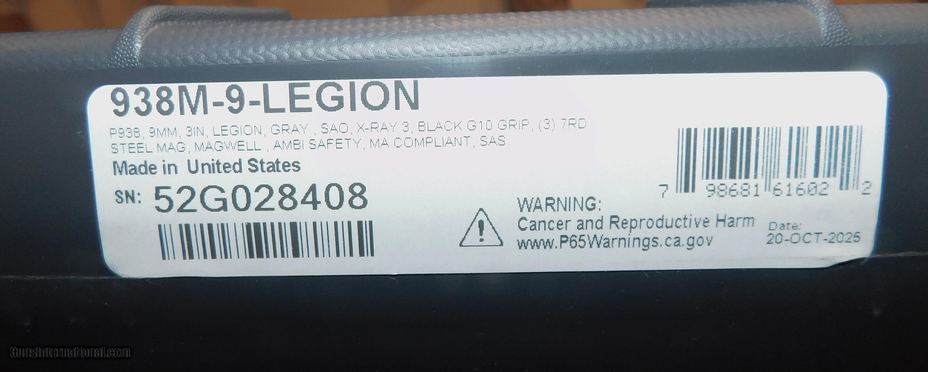 Description: SIG SAUER P938 LEGION IN 9MM CAL., WITH 3" BARREL. COLOR GRAY. CONDITION NEW IN BOX. SERIAL NUMBER 52G028408. SIG SAUER MODEL P938 LEGION IN 9MM CALIBER, COMES WITH THREE FACTORY MAGAZINES, HARD CASE WITH PAPERS, NEW IN BOX OVERALL CONDITION, OUR STOCK # D8233 Price: $795.00 Contact Seller |