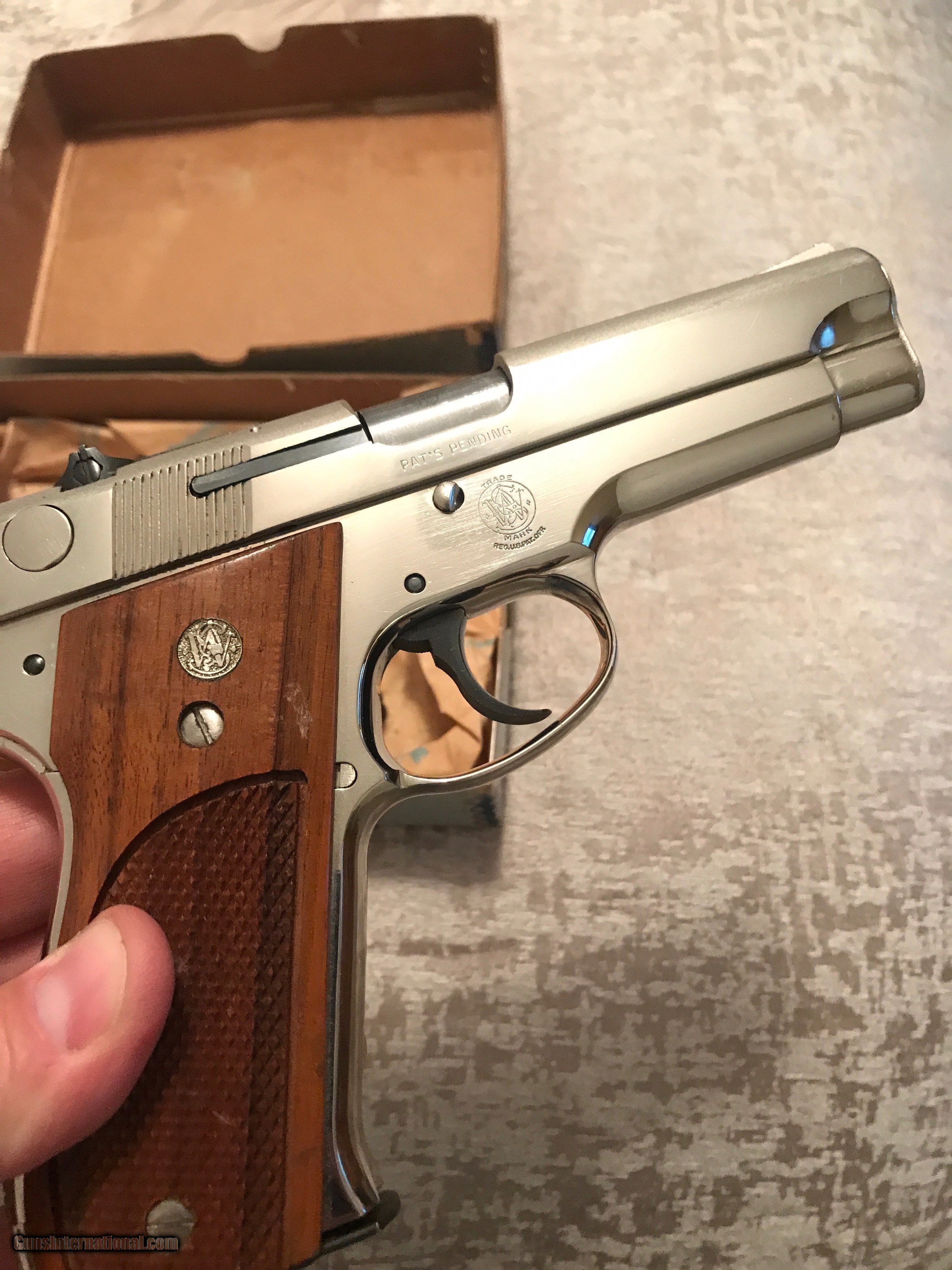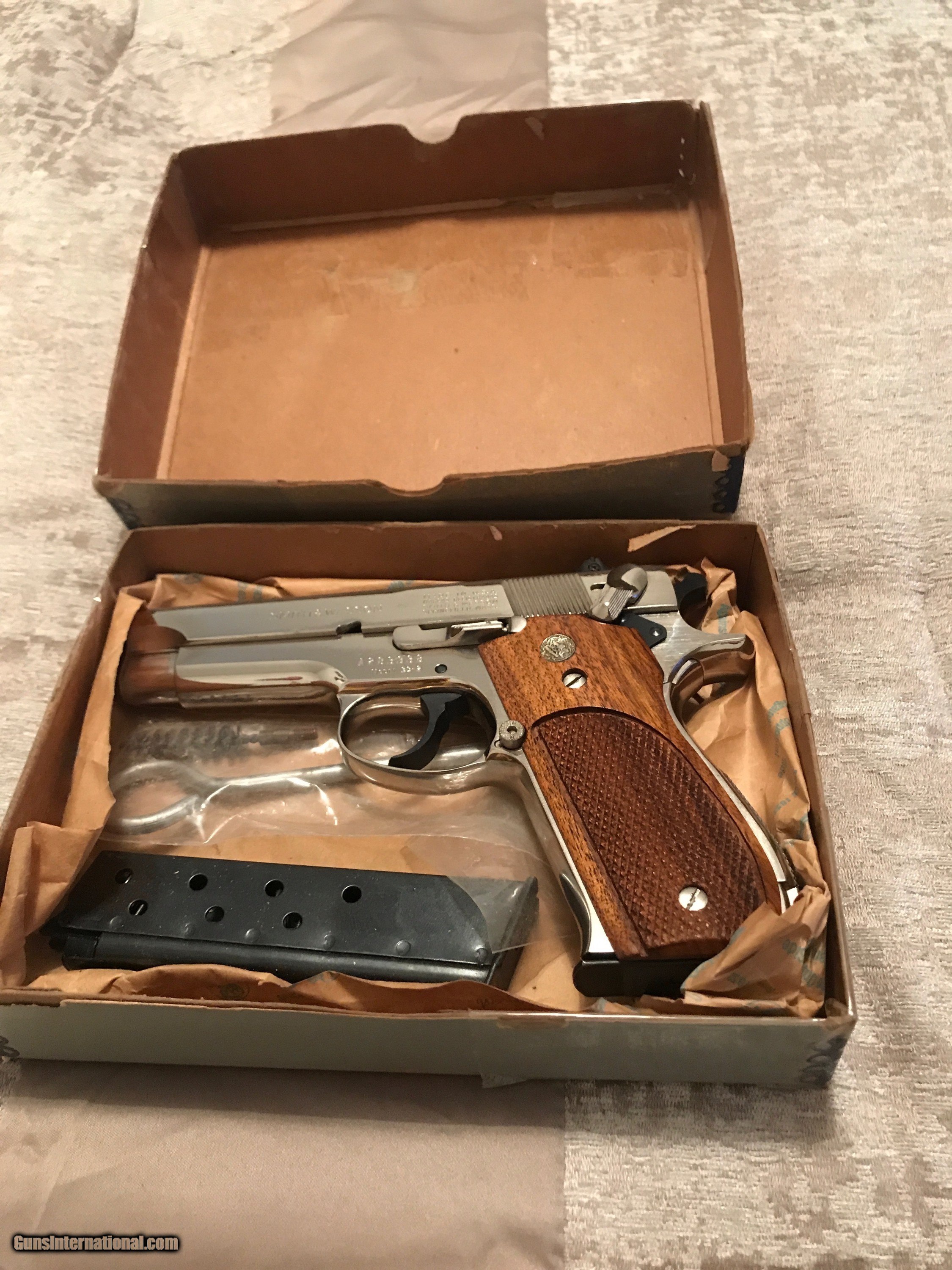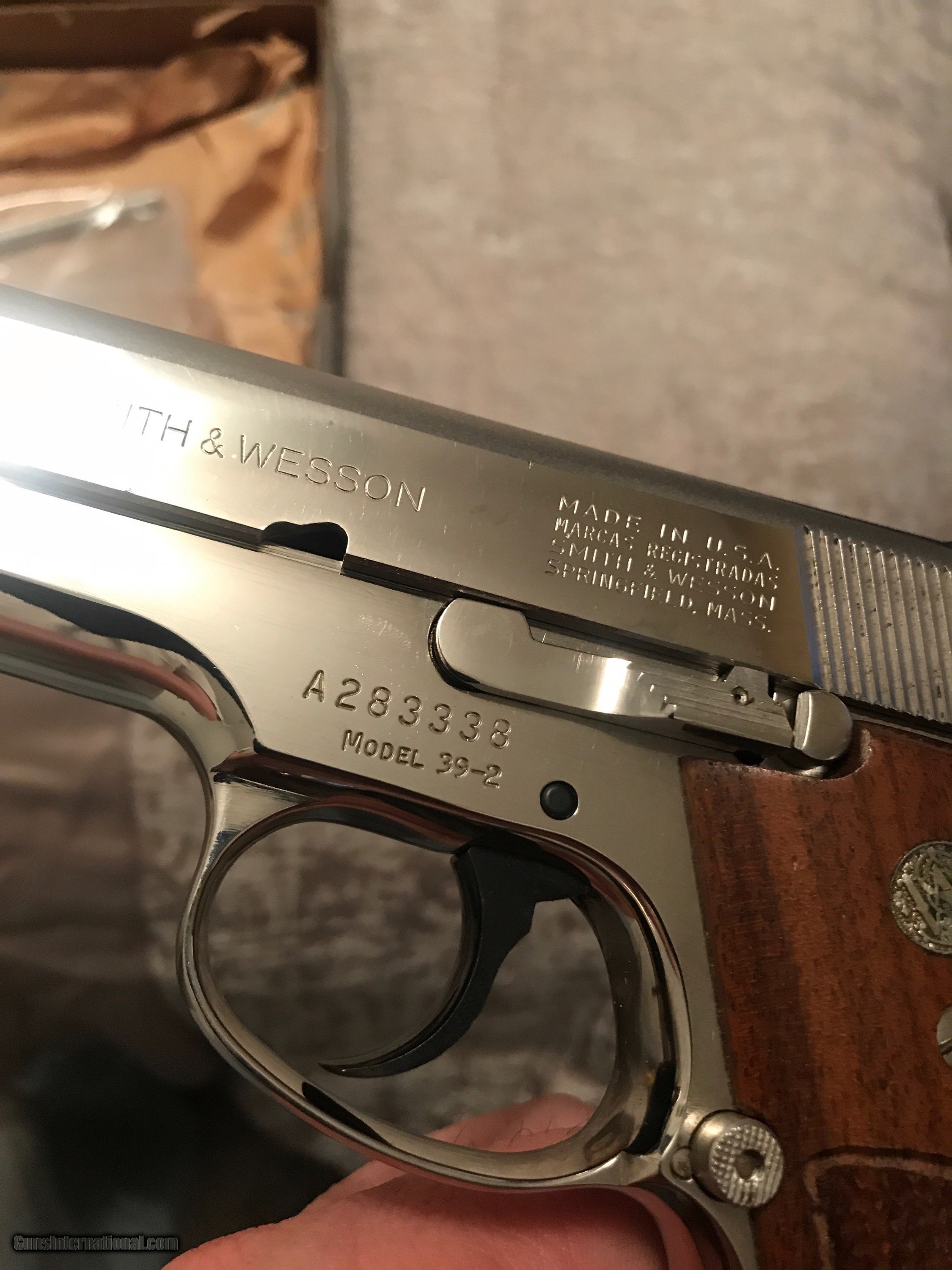 Description: Another gorgeous 39-2. Gorgeous nickel and wood grips. 9mm, 2 magazines, tools, and original box. The box is very fragile, but it's original. These are getting harder and harder to find, especially in this condition with the box and tools. Please email with questions. Price includes shipping SOLD Manufacturer: Smith and Wesson Model: 39-2 Caliber Info: 9mm Condition: used Metal Condition: excellent Wood Condition: excellent Bore Condition: excellent Action: double Finish: nickel Sights: target |
