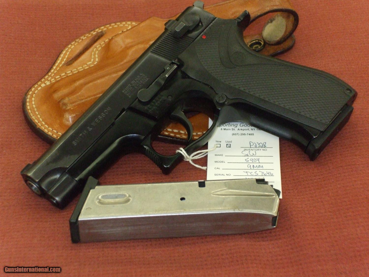 Description: Smith & Wesson 5904 9mm, 97% blue, fixed sight, very clean, 2 15rd magazines & a Bianchi holster. SOLD Manufacturer: Smith & Wesson Model: 5904 Serial Number: P2328 Caliber Info: 9mm |