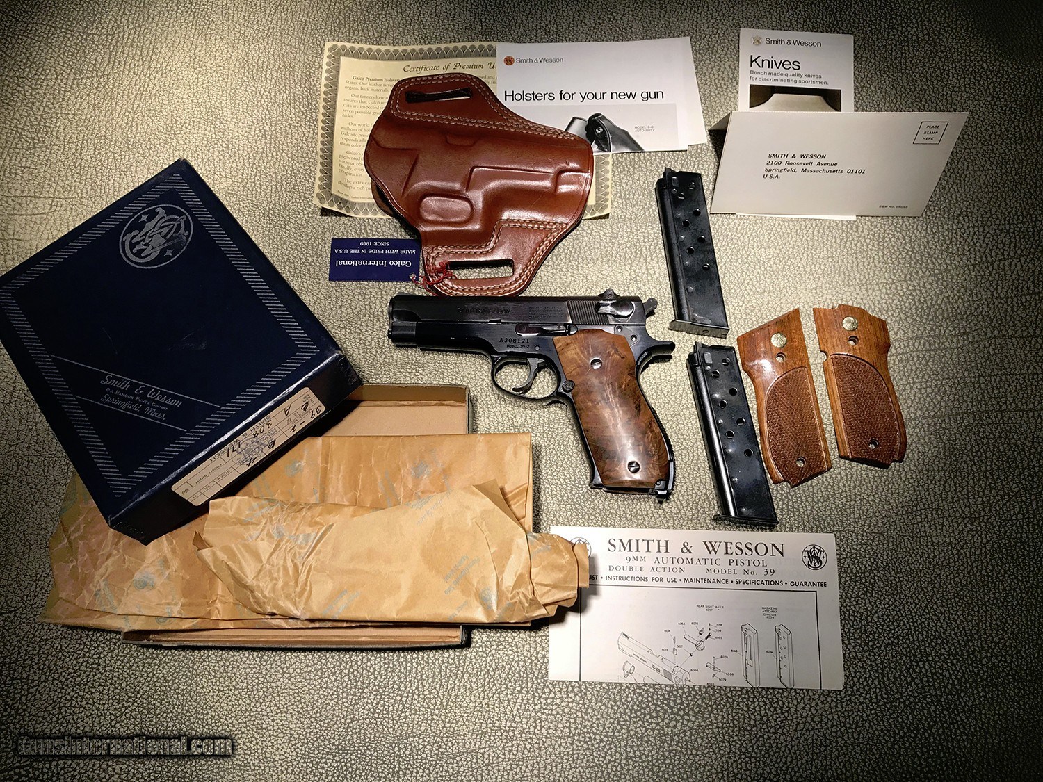 Description: A wonderful collectible in pristine condition in the original box and accessories after 45 years.Serial number: A308171 was listed in 1976. The last serial number was A 747148. The model 39-2 semi-automatic I a double-action pistol. It is 7.44 inches long and weighed just 26.5 ounces empty with a four-inch barrel. Original box and papers.Original checkered walnut grip, with additional unique and rare Deluxe grip from the same piece of burl of walnut book matching mirrored left and right grip. The Smith & Wesson Model 39 semi-automatic handgun served U.S. Navy SEALs during the Vietnam War and then went on to become one of the American nine-millimeter high capacity pistols. An updated version of Smith & Wesson's first double-action (DA/SA) pistol, the Model 39. The same features as the original first-generation model, but is distinguished by a shorter coil-spring-actuated extractor. Note that some S&W Model 39-2 hammers have a hole drilled in them and some do not. SOLD Handgun Caliber: 9x23mm Winchester Manufacturer: Smith & Wesson Model: Model 39-2 Serial Number: A74148 Barrel Length: 7.44 Bore: 9mm Condition: Mint Metal Condition: Mint Wood Condition: Mint Bore Condition: Mint Manufacture Date: 1976 Engraving: None Proof:Nitro: N/A |