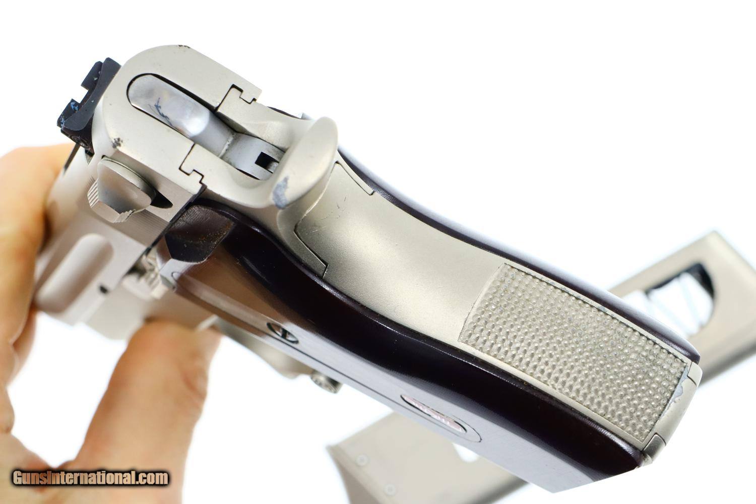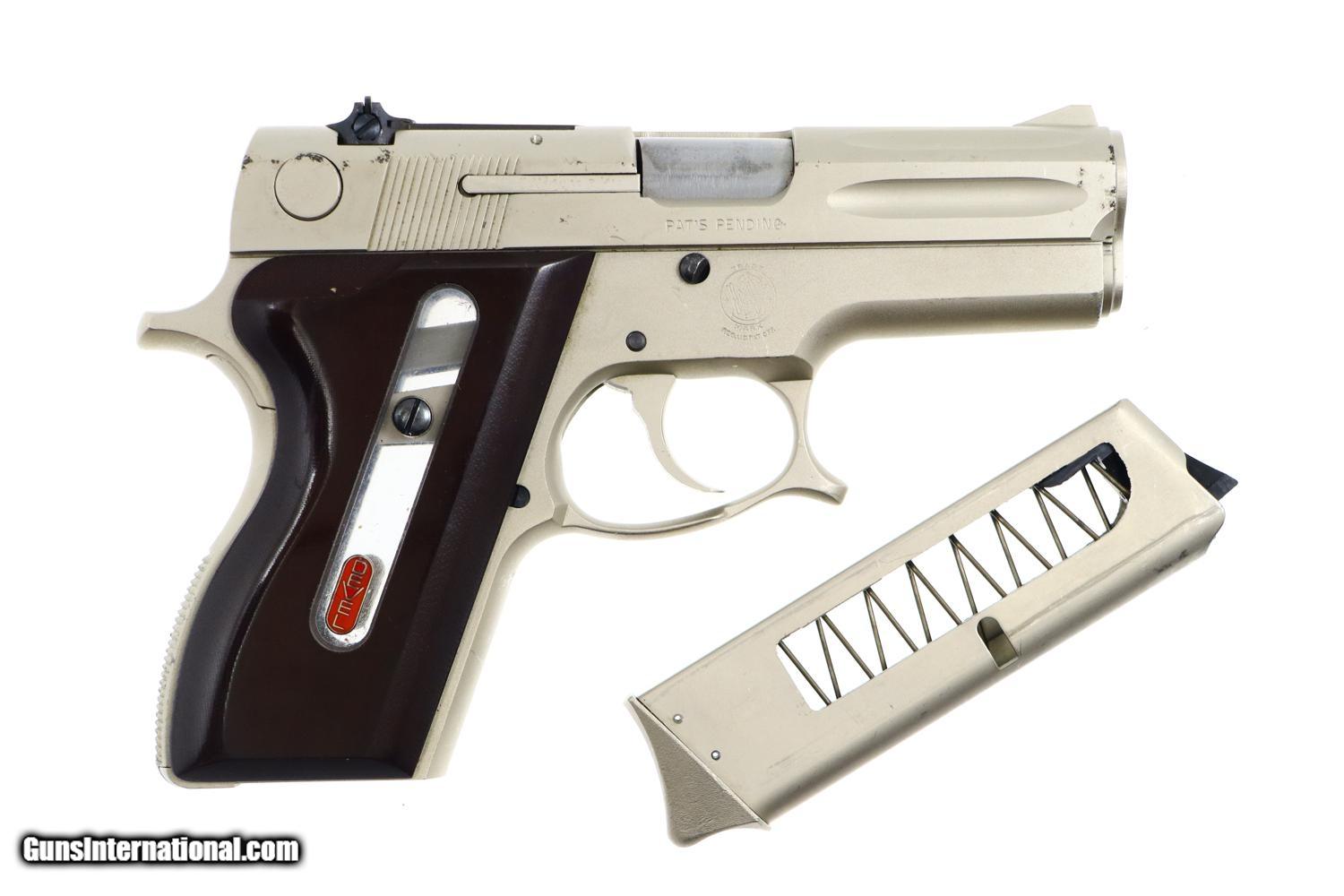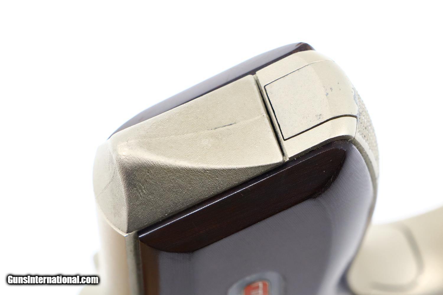 Description: Synopsis: Smith & Wesson, Full House Devel, Model 39-2, A534418, FB00848 Description: Scarce and immediately recognizable Devel customization of S&W M39-2 in satin nickel finish. Modified by Charles Kelsey of Devel, these pistols laid the foundation of many features that we now take for granted in today’s compact carry guns. Popularized by author Rex Applegate, these Devels have nearly a cult following. This example, #216 as reflected by the stamped digits following the serial number, has shortened slide and frame with each smooth panel with clear central window having a red enameled Devel emblem. Hard chromed bobbed hammer and reduced frame spur. For better reliability, Devel use Wolfe springs. Standard S&W rear sight, front sight smoothed with recess for paint, this one red. Polished barrel feed ramp, lowered ejection port, and fined tune for reliability. Devel customize magazine with dual pinned finger extension base. Complete with a blue plastic S&W box for a later model pistol. Condition: VG+ original condition with holster wear/handling marks/light scuffs. The left grip screw is burred with a hairline crack extending across the transparent panel. Comparable condition magazine. Excellent bore. Perfect manual mechanics. G condition box. A very nice example of a S&W 39-2 Devel Full House conversion. ~~Insured shipping fee of $75; most packages shipped using FedEx 2nd Day.~~ SOLD Manufacturer: Smith & Wessen Serial Number: A534418 Caliber Info: 9mm |