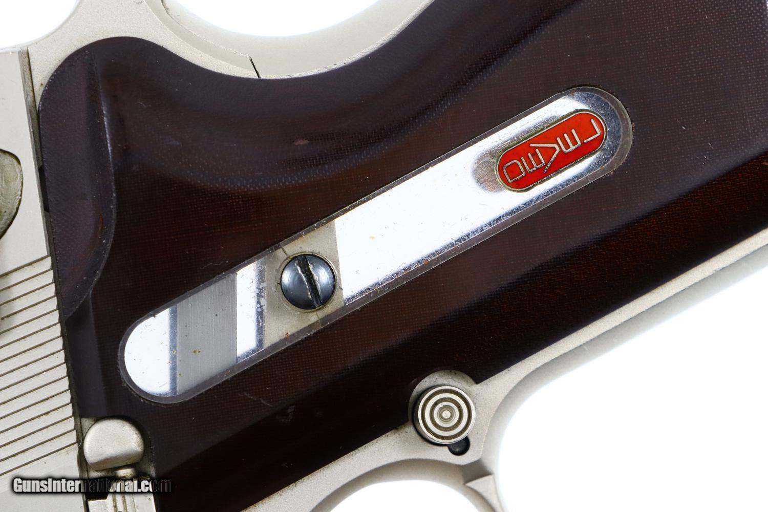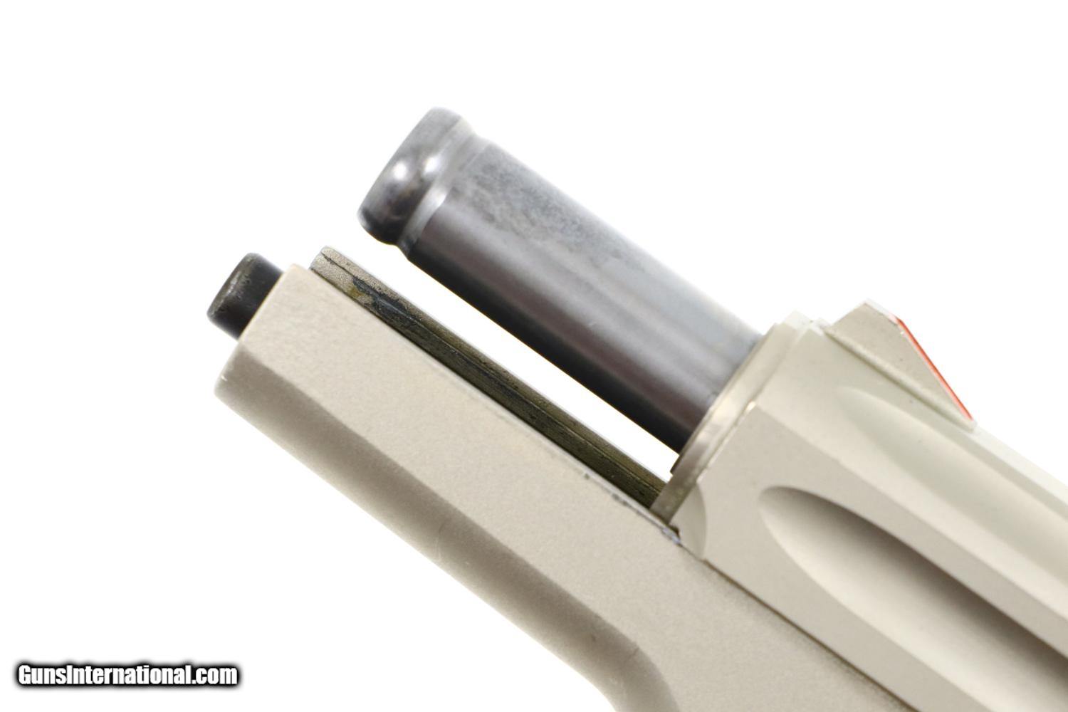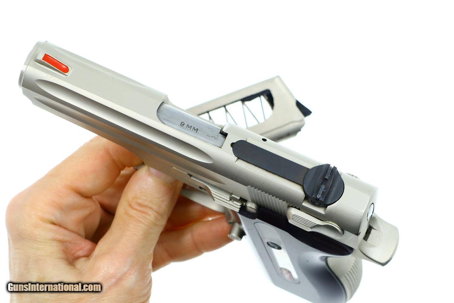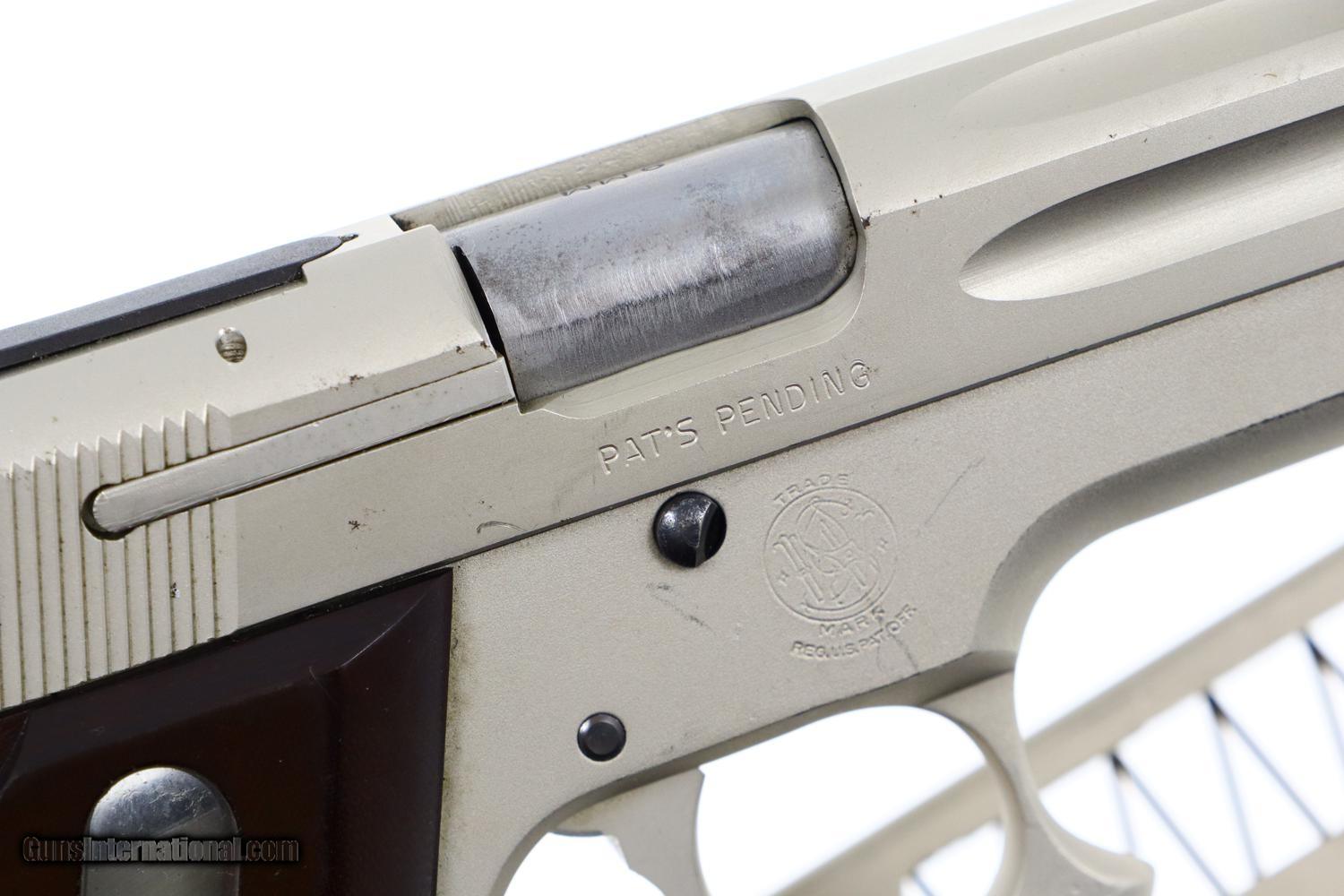 Description: Synopsis: Smith & Wesson, Full House Devel, Model 39-2, A534418, FB00848 Description: Scarce and immediately recognizable Devel customization of S&W M39-2 in satin nickel finish. Modified by Charles Kelsey of Devel, these pistols laid the foundation of many features that we now take for granted in today’s compact carry guns. Popularized by author Rex Applegate, these Devels have nearly a cult following. This example, #216 as reflected by the stamped digits following the serial number, has shortened slide and frame with each smooth panel with clear central window having a red enameled Devel emblem. Hard chromed bobbed hammer and reduced frame spur. For better reliability, Devel use Wolfe springs. Standard S&W rear sight, front sight smoothed with recess for paint, this one red. Polished barrel feed ramp, lowered ejection port, and fined tune for reliability. Devel customize magazine with dual pinned finger extension base. Complete with a blue plastic S&W box for a later model pistol. Condition: VG+ original condition with holster wear/handling marks/light scuffs. The left grip screw is burred with a hairline crack extending across the transparent panel. Comparable condition magazine. Excellent bore. Perfect manual mechanics. G condition box. A very nice example of a S&W 39-2 Devel Full House conversion. ~~Insured shipping fee of $75; most packages shipped using FedEx 2nd Day.~~ SOLD Manufacturer: Smith & Wessen Serial Number: A534418 Caliber Info: 9mm |
