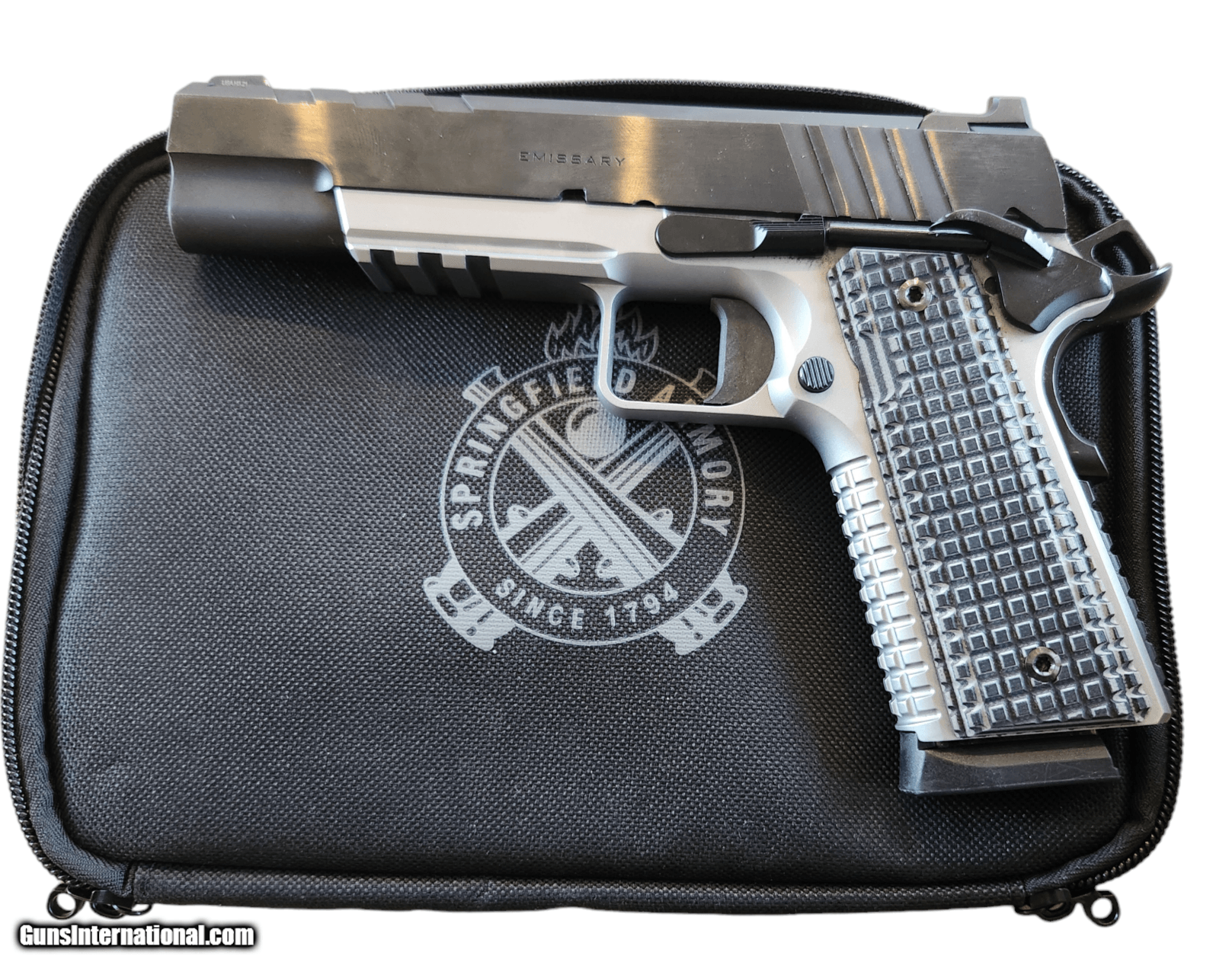 Description: Springfield Armory Emissary in 9MM. Tasked with a special mission, the Emissary bridges defensive and custom pistols delivering a bold and capable addition to the Springfield Armory family of 1911's. Built on a durable foundation of forged steel in its barrel, slide and frame, the Emissary offers a defensive pistol with an air of custom refinement. The pistol has a beautiful two-tone finish, with a blued carbon steel slide and a stainless-steel frame with squared trigger guard. A "Tri-Top" cut to the slide gives the pistol custom-grade styling, while a heavy-profile bull barrel delivers maximum accuracy and reduces felt recoil. The Emissary blends form and function seamlessly in a defensive-minded firearm loaded with custom-grade features. 9mm Luger ***** Gun Pictured Is The Gun For Sale ***** Not Stock Images Price - $999 Or Best Offer Free Insured Shipping To Your FFL SOLD Handgun Caliber: 9x19mm Parabellum (9mm Luger, 9x19mm NATO) Manufacturer: Springfield Model: Emissary Serial Number: NM802785 Condition: Excellent Metal Condition: Excellent Bore Condition: excellent Action: Semi Auto Weight: 48 oz |
