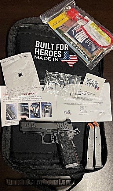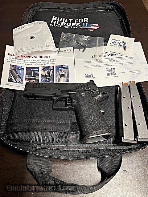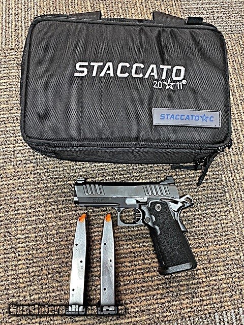 Description: The Staccato C is the latest introduction to the Staccato family of 2011® handguns. It features a 4" barrel, aluminum frame and all the innovations introduced with its smaller, 3.5" sibling, the Staccato CS. The Staccato C is available in a full-size grip, holding a 17-round magazine. With this design, the Staccato C is small enough for concealed carry and big enough for duty and defense. It's All Purpose, Staccato. The Staccato C comes optic ready with standard front sight and compatible to co-witness with most optics. Made in USA Specifications Model: Staccato C Full Size Grip Flat Trigger DLC Barrel Trigger: 4-4.5 lb / Crisp & clean single action pull Type: Semi-Auto Pistol Barrel: 4.0" Bull Barrel / Stainless Steel & DLC Action: Single Action Weight: 26 oz - Without optic & no magazine Finish: Black DLC Frame: 7075 Aluminum - Billet Precision Machined Stock/Frame: Aluminum Polymer Recoil System: 4.0" Tool less Grip: Tac Tecture Dimensions: 7.6" x 1.45" x 5.4" or 5.8" (Full-size) / Width at grip is 1.2" Caliber: 9x19 mm: Magazine: Comes with 2 x 17 Round Magazines What's in the box?