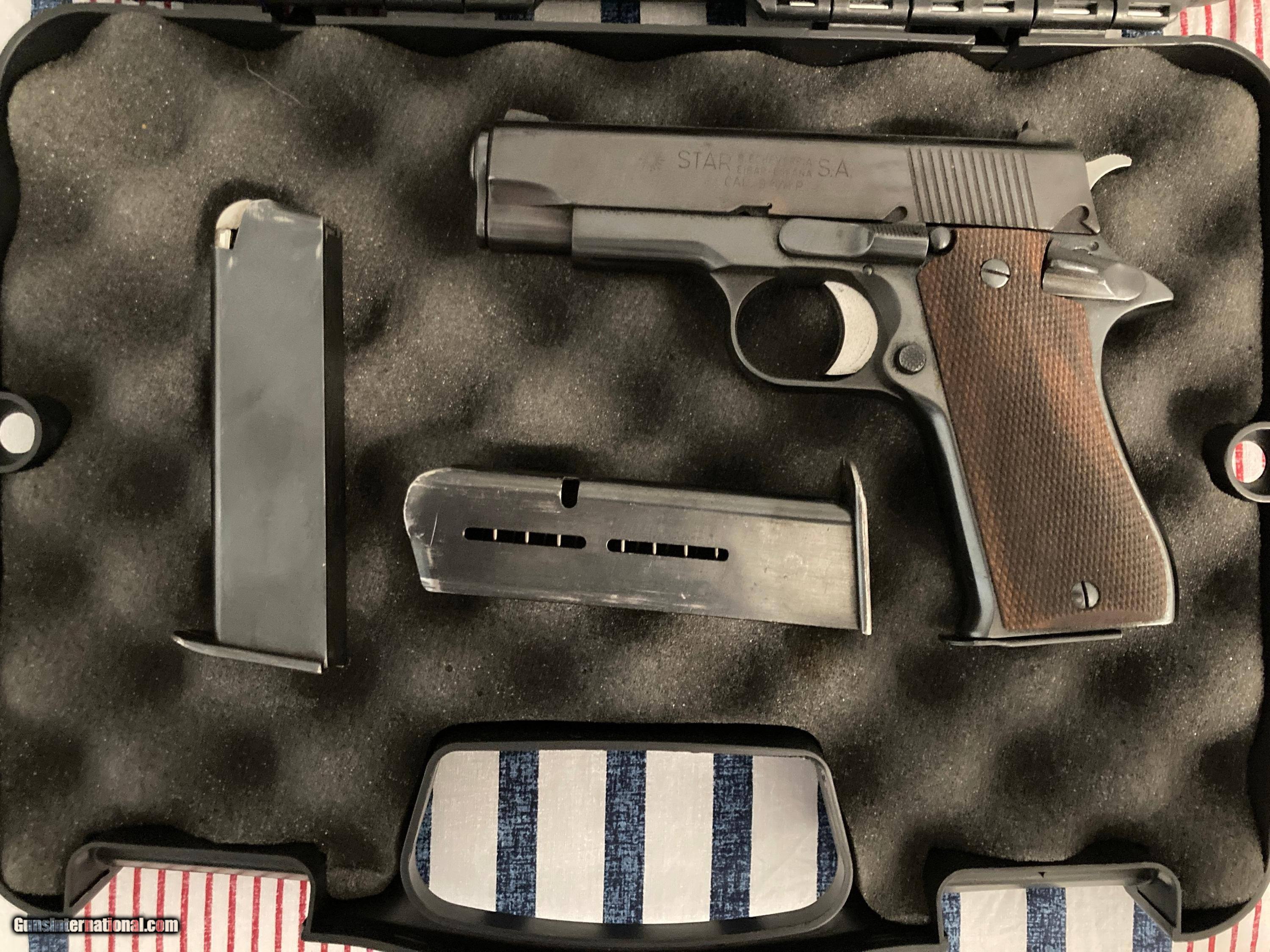 Description: Star BM 9mm Pistol in excellent condition. The gun is in excellent condition. The bluing looks almost new and it has very nice walnut grips. Includes 3 magazines. The Star BM is an all steel 9mm. Overall length is 7.25 inches, and . barrel length is 3.77 inches. Magazine capacity is 8 rounds. SOLD Handgun Caliber: 9x19mm Parabellum (9mm Luger, 9x19mm NATO) Manufacturer: Star Bonifacio Echeverria Model: Star BM Condition: Excellent Metal Condition: Excellent Wood Condition: Excellent Bore Condition: Good Action: Semi Auto Finish: Blue Extras: 2 Extra Magazines |
