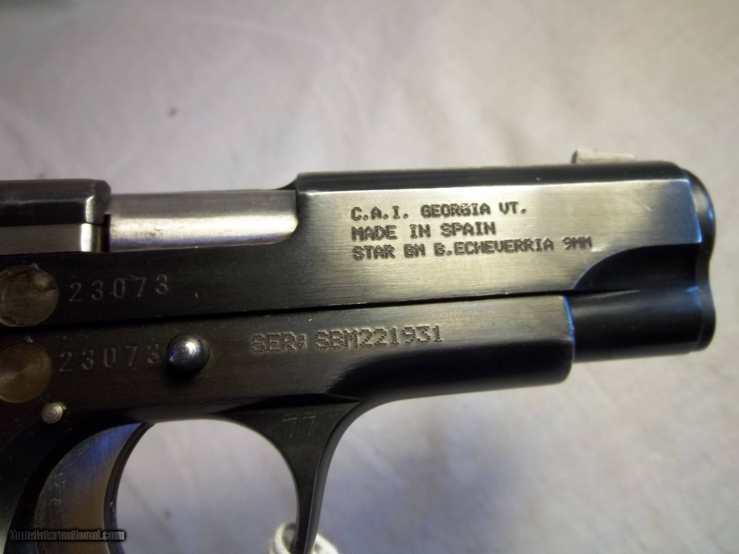 Description: Star BM,9mm,box no papers,CIA import,Payment with postal money order, shipping 40.00,We are a full time gun store and reserve the right to end an early if it sells in the store SOLD Handgun Caliber: 9mm Federal Manufacturer: Star Model: S.A. |