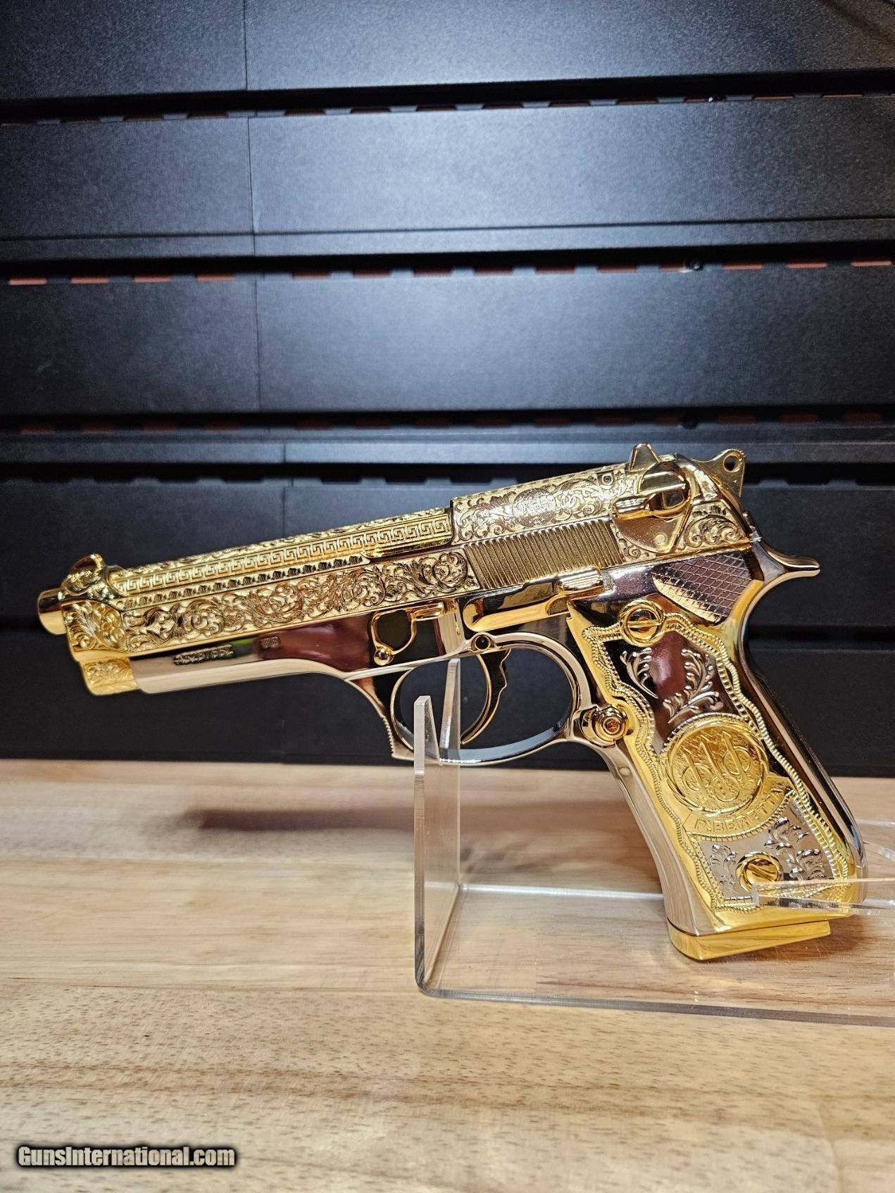Description: Be the collector everyone wants to be but never gets there. This Berretta doesnt dissapoint with its deep engraving and style only Versace can Bring. 24K Gold barrel and case follows the performance of 9 MM deadly accurate round. There have been attempts on this design but all have fallen short because they werent done by Distinct Engrsved Arms. Wow is a common theme when it comes to our designs and our extreme perfection to detail. Be the one who is talked about after people leave your home as the guy with the coolest guns they have ever seen. SOLD Handgun Caliber: 9x19mm Parabellum (9mm Luger, 9x19mm NATO) Manufacturer: Berretta Model: 92fs Condition: NIB Metal Condition: Superb Engraving: 75% Extras: 24k Extreme Case: original Item Location: MN |