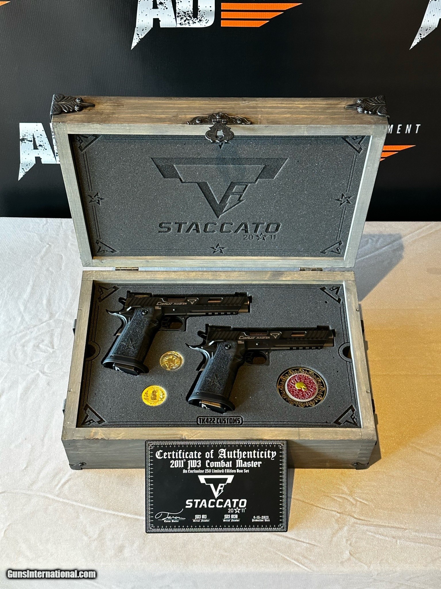 Description: ALL NEW 2023 JOHN WICK 3 COMBAT MASTER BOX SET (LIMITED EDITION) A COLLABORATION BETWEEN TARAN TACTICAL INNOVATIONS (TTI) AND STACCATO (STI) 2011. Box Set Details Developed in partnership, Staccato and Taran Tactical Innovations are proud to introduce the ultimate collector’s item for gun enthusiasts and action movie lovers alike – the JW3 Combat Master Box Set. The limited-edition set includes two iconic handguns featured in a blockbuster film series, the Island Barrel Combat Master and the Bull Barrel Combat Master. The Island Barrel Combat Master was used in the training and preparation for the movie’s production, while the Bull Barrel Combat Master was prominently featured. The Island Barrel version of the pistol is the rarest Combat Master ever made. To date less than 10 of these pistols exist, with most being used by Taran and the main actor training for the movie. This box set will be the only opportunity to acquire matched serial number pistols, produced by Staccato which include the very rare JW3 2011® Island Barrel Combat Master. THESE HIGHLY COLLECTABLE LIMITED-EDITION JOHN WICK 3 COMBAT MASTER BOX SETS WILL SELL FAST, PURCHASE YOURS TODAY BEFORE THEY DISAPPEAR. In an Ultimate Tribute to the Franchise Each Combat Master Box Set Includes: