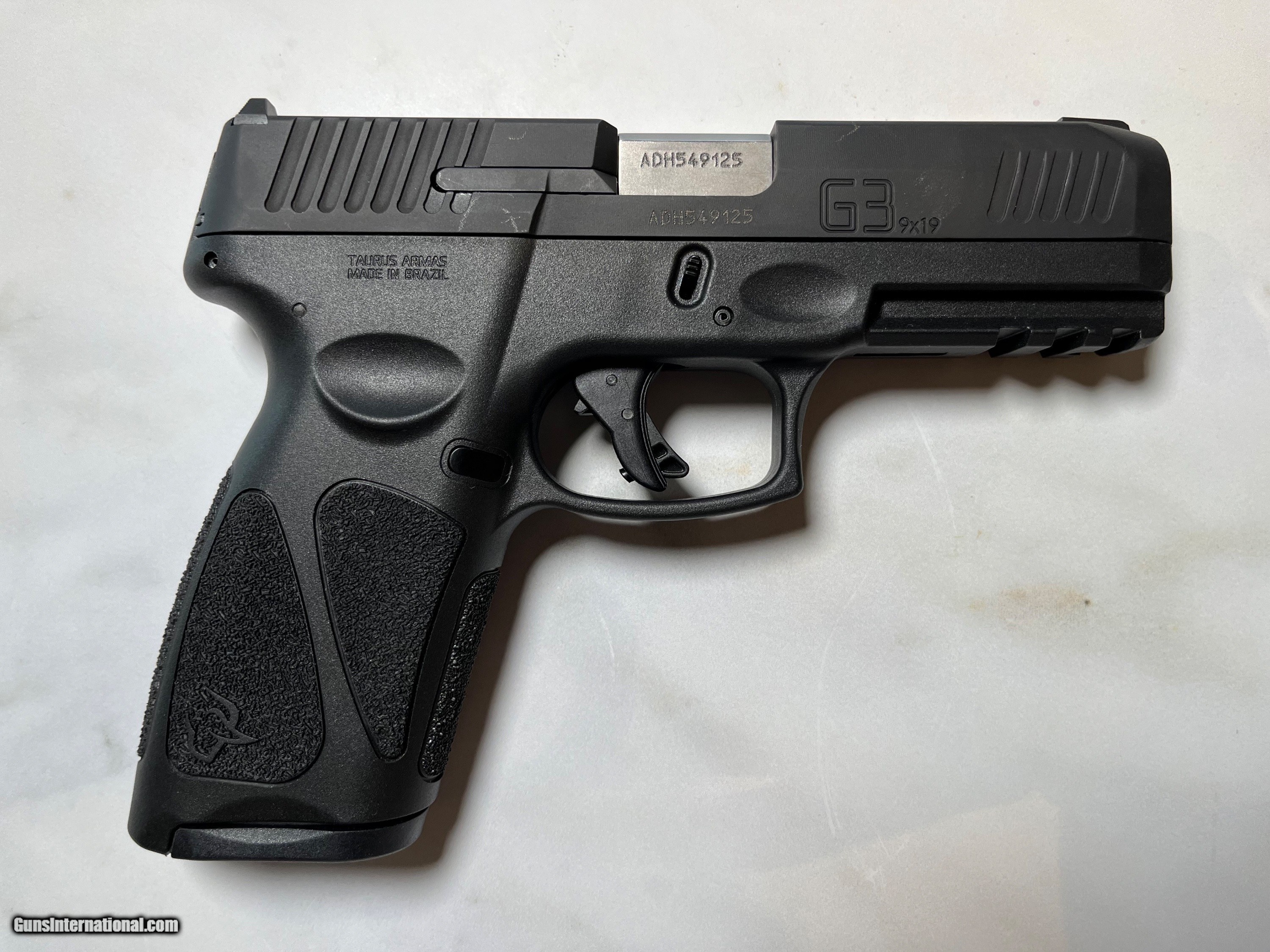 Description: The G3 features a polymer-frame profile with stippling patches across the grip for maximum control and retention in any shooting condition, an ergonomic palm swell and side-frame Memory Pads that provide quick, positive hand positioning. The frame has an integrated Picatinny rail. A manual/trigger safety. A refined element of the G3 is the 6-lb. trigger, designed with a smooth take-up and a surprisingly crisp, clean break exceeding that of typical striker-fired pistol trigger performance. A short reset promotes quick, controlled follow-up shots. Package includes: 1) Firearm 2) 3x 15-Round Magazines 3) 1x 17-Round Magazine 4) Ameriglo Tritium Front Sight Firearm has never been fired since original purchase. SOLD Handgun Caliber: 9x19mm Parabellum (9mm Luger, 9x19mm NATO) Manufacturer: Taurus Model: G3 Serial Number: ADH549125 Condition: New In Box Metal Condition: New In Box Bore Condition: New In Box Sights: Ameriglo Tritium Front Sight - Blacked Out Rear Item Location: Pittsburgh PA |