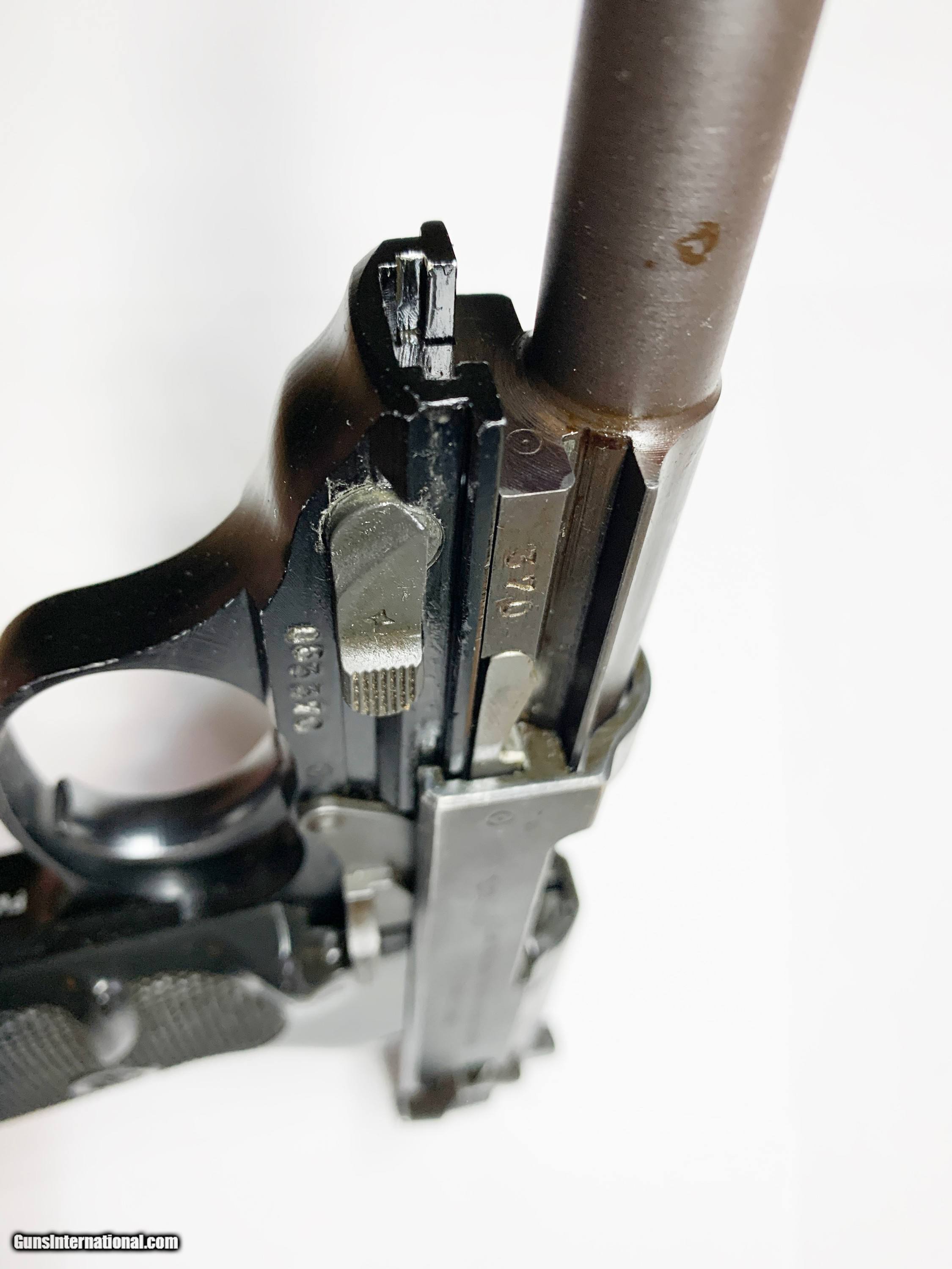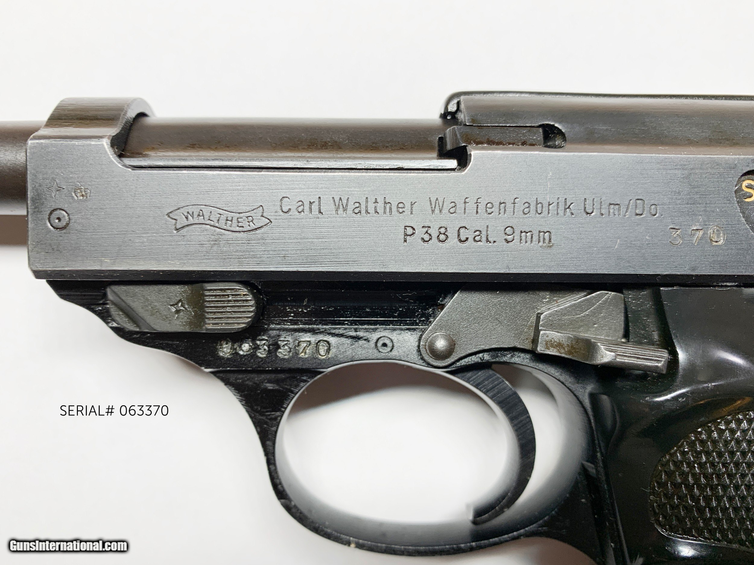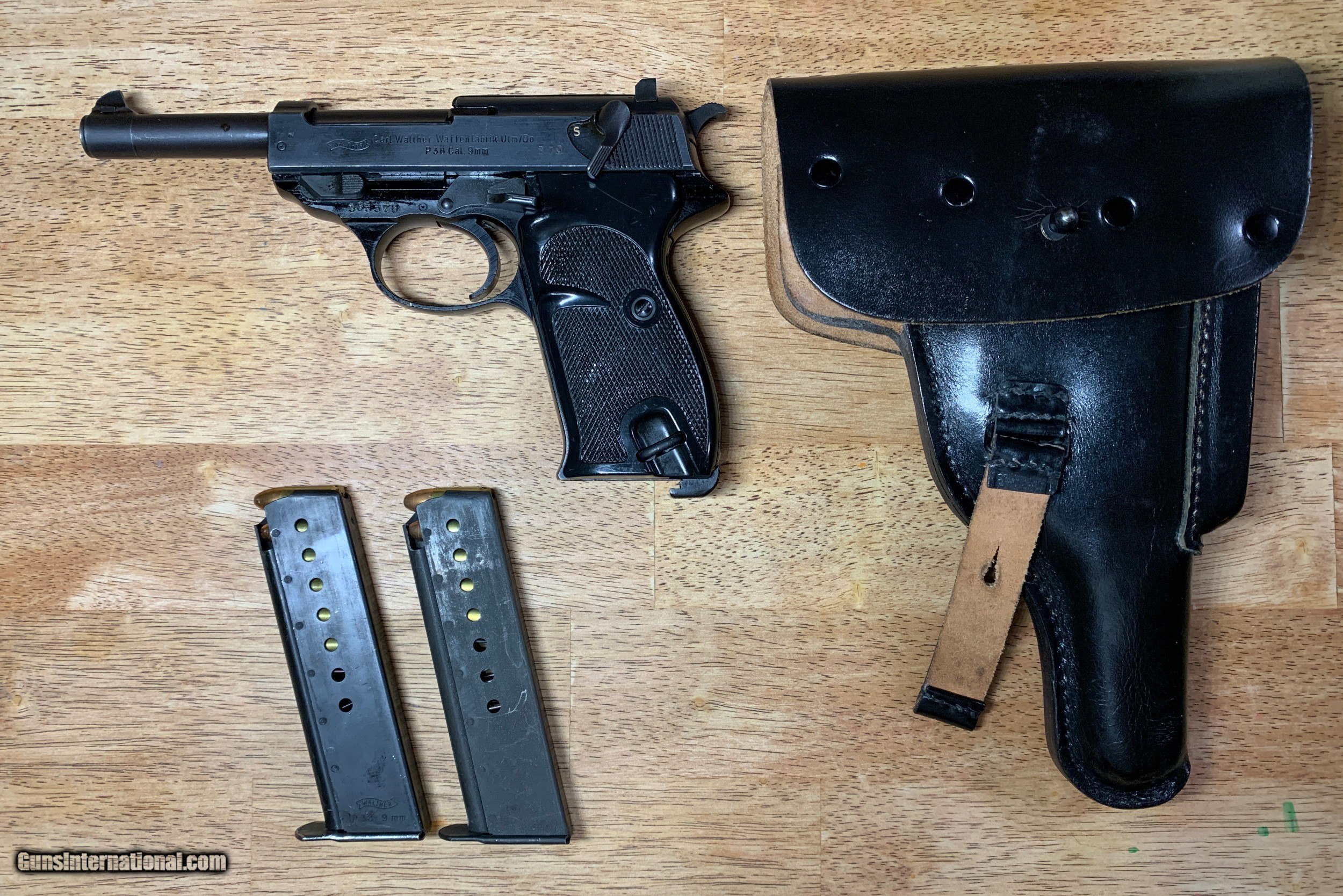 Description: This post war Walther P-38 9mm is in great shape! Breech face is clean and bore is a little dusty but will clean up to be great. Slide is marked "7/59" on its right side, and the front strap of the frame is import marked "PW Arms, Redmond WA." Includes one factory "P38" marked Walther magazine and one extra magazine (not original). Also includes a leather holster with extra magazine slot. A great example of a post war P-38! Gently used and fired occasionally. SOLD Curio/Relic: Yes Handgun Caliber: 9x19mm Parabellum (9mm Luger, 9x19mm NATO) Manufacturer: Walther Model: P38 Serial Number: 063370 Barrel Length: 4.9 in Condition: Excellent Metal Condition: Excellent Bore Condition: Excellent Action: Short Recoil, Locked Breech Manufacture Date: July 1959 Extras: Leather Holster, two magazines Item Location: Florida |