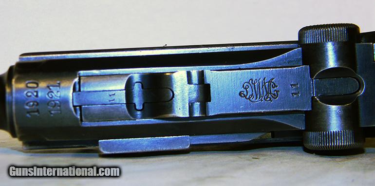 Description: Double date 1920/1921 on chamber breech. "DWM" manufacturer marked on toggle. All matching but magazine (aluminum blank bottom, no number). Very good+ original finish, with a little holster wear. WWI unit markings on front grip strap (7./J.R. 3.24.). Very nice grips, no dents, dings, etc. Serial number 121xa. SOLD Curio/Relic: Yes |
