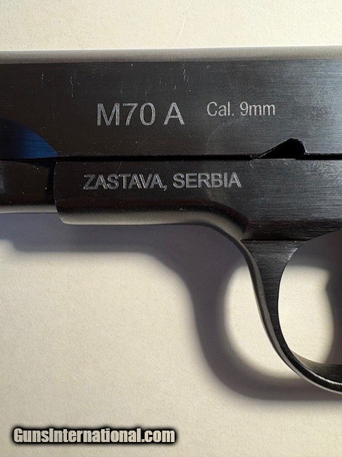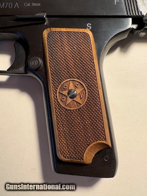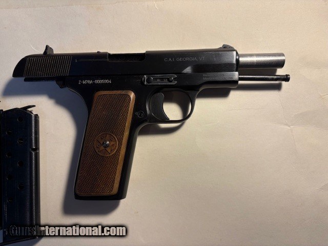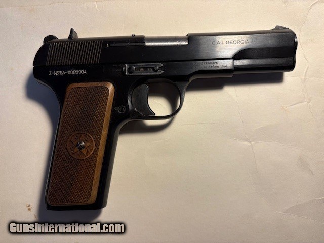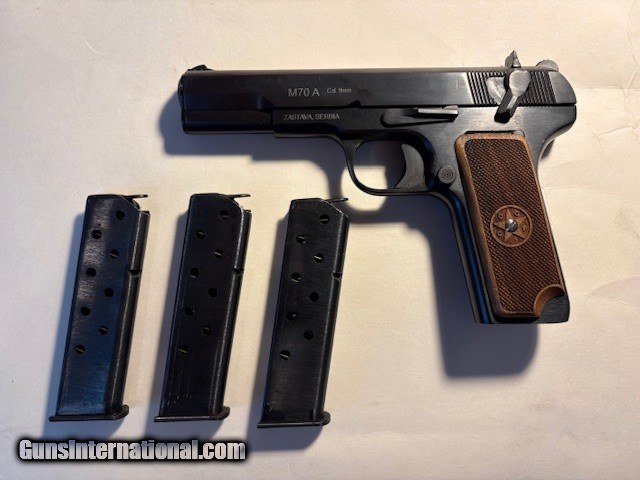 Description: Almost new (less than 500 rounds), very clean 9mm Zastava Arms Tokarev M70A. All steel with wood (aftermarket) grips. Very easy to aim and shoot. Based on the Soviet era M57 pistol, which was based on the Browning 1903 pistol. Includes 3 magazines. Specs: Caliber: 9mm Luger Barrel: 4.5 inches Overall: 7.9 inches Weight: 30.3 oz Trigger: single stage Capacity: 9+1 SOLD Handgun Caliber: 9x19mm Parabellum (9mm Luger, 9x19mm NATO) Model: M70A Bore: Clean and Sharp Condition: Excellent Metal Condition: Blued |
