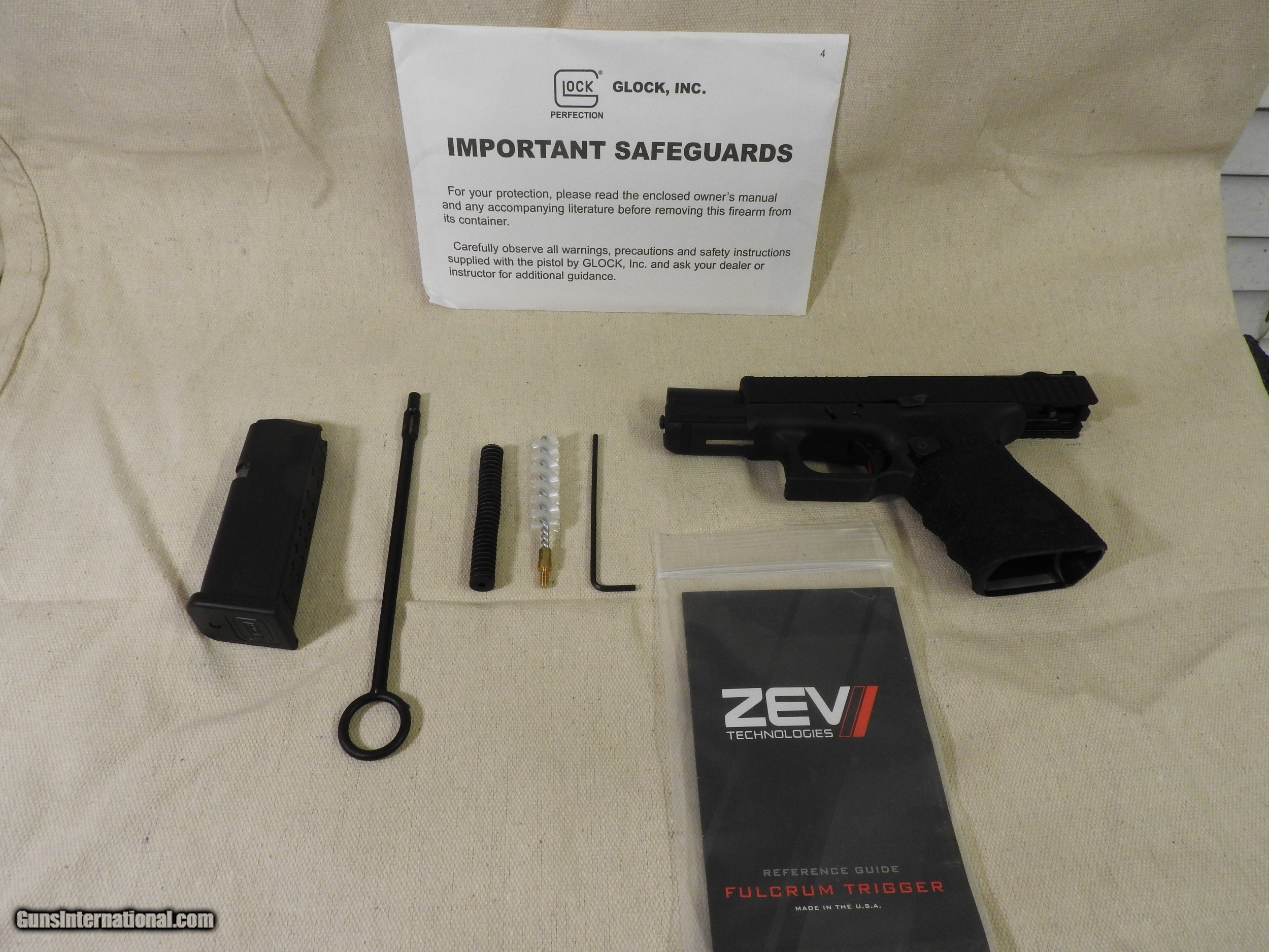 Description: CYBER MONDAY ZEV GLK19 DEFENDER 9MM Built for speed, precision and aesthetic appeal. Features ZEV Duty drop-in trigger. ZEV Fiber Optic sights. ZEV Extended magazine release, extended slide release lever. ZEV Stipple grip job with single undercut. Black DLC (Diamond Like Carbon 90 rockwell) ultra hard, ultra thin non reflective slide coating.
