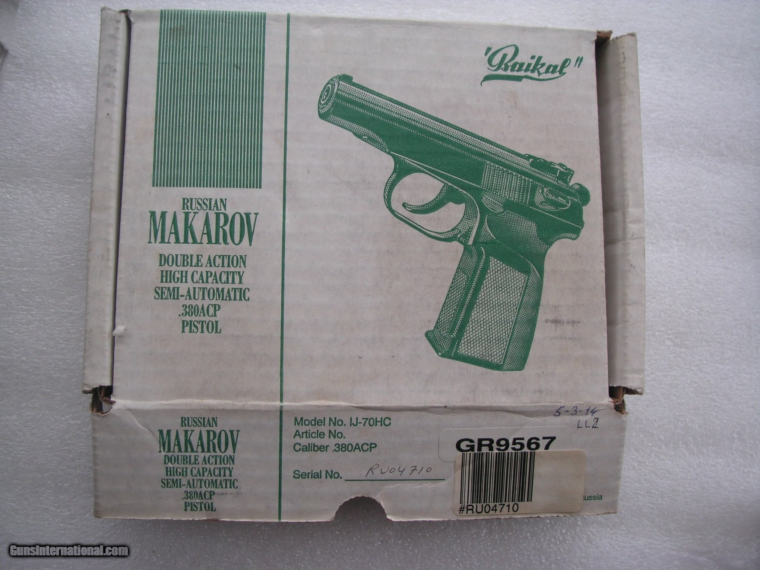 Description: SEE THE PICTURES OF THIS BEAUTIFUL RUSSIAN MAKAROV DOUBLE ACTION HIGH CAPACITY SEMI-AUTOMATIC CALIBER .380ACP PISTOL IN LIKE NEW ORIGINAL FACTORY CONDITION TEST FIRED ONLY. THIS IS HIGHLY COLLECTIBLE AND IN THE SAME TIME IT IS VERY GOOD FOR HOME AND PERSONAL PROTECTION. We offer three days inspection. Only not fired changed parts or condition guns would be accepted. Return shipping cost is the buyer expense. We accept bank & postal money orders or personal & business checks, but those take time to clear. We also offer 90 days layaway with 25% down & three more payments of 25% per month. The layaway plan does not have 3 days inspection privileges; therefore there is “NO RETURNS” policy. If you have offered to buy my guns, and the payment has not made soon after (from 3 to 5 days), I will not guarantee you will be the buyer of it. I can secure your purchase only when you have paid for it. If your payment comes too late, I will return it back to you. Please check our other nice listings. SAFETY NOTICE: Buyer solely responsible for following all safety requirements in handling guns. By , the buyer agrees to hold seller harmless against damages, injury or death caused by defective merchandise or ammo. If you like, we can negotiate terms of shipping. The offered shipping price includes insurance cost & priority mail cost only. SOLD Manufacturer: RUSSIA Model: IJ-70HC Serial Number: RU04710 Caliber Info: .380 acp Bore: BRIGHT AND SHINY Condition: LIKE NEW Metal Condition: LIKE NEW |