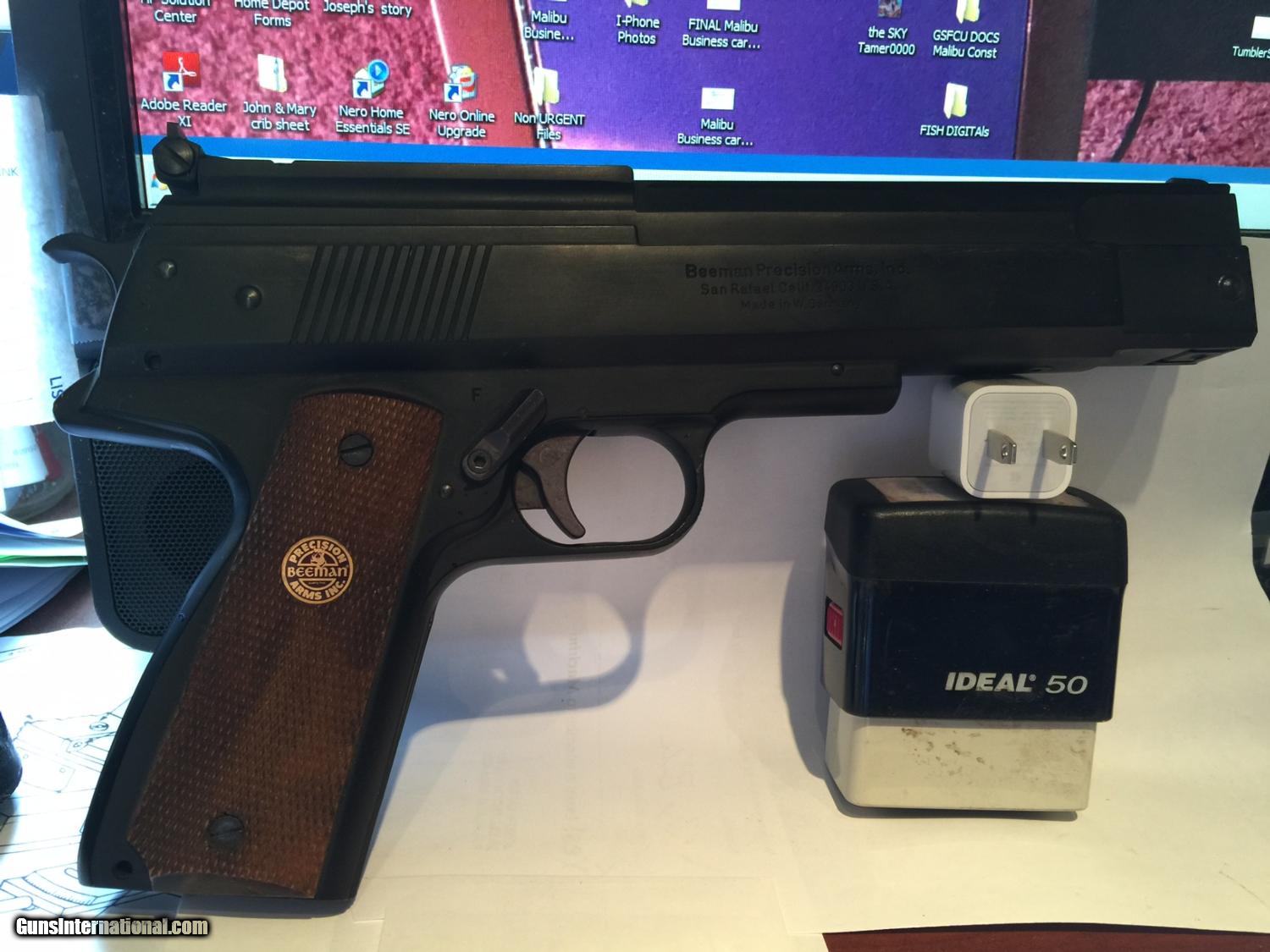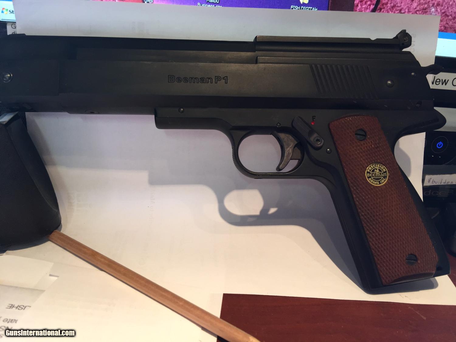 Description: REDUCED & INCLUDES SHIPPING ! Looks like a .45 1911 firearm...and just as accurate! Made in Germany by the legendary Weihrauch company‚ the Beeman P1 is considered by many to be the Holy Grail of air pistols. This is an heirloom airgun that you'll pass along to your grandchildren and beyond. The gun's heft and balance convey quality and substance. It fills your hand without feeling bulky or oversized. The unusual overlever cocking mechanism compresses the powerful mainspring‚ and the hammer is actually the catch for it. Highly adjustable two-stage trigger‚ which has a serrated surface for more control‚ will help you extract maximum accuracy from the P1. In fact‚ the adjustable trigger is so crisp‚ you'll wish it was on your firearms. The dovetail grooves are extra wide‚ and our accessory list has several 11mm to 14mm mounts that are known to fit. Unlike many modern air pistols‚ the P1 isn't made of molded synthetics. It's a solid metal gun with finely checkered walnut grips. And‚ it's ambidextrous. The 11mm dovetails make it easy to mount a pistol scope or a red dot sight. The P1 has two power levels. The different power levels are created by cocking the gun to different lock points. See the detail shots to see how to cock the gun for high power and low power. REDUCED The distance you shoot‚ the weight of the pellet and the type of target will let you determine which power level is best. The P1 is an excellent indoor trainer for those who shoot the M1911A1. Accurate‚ 2 power levels‚ easy to cock and a blast to shoot! Low=380 fps‚ high=600 fps