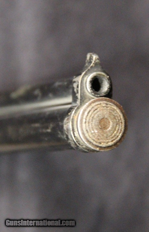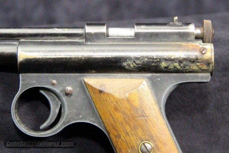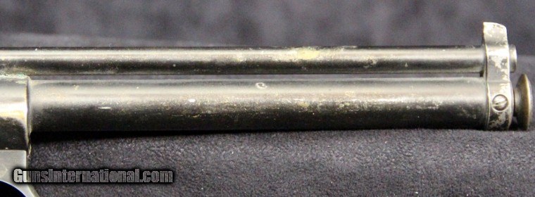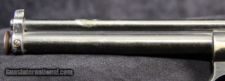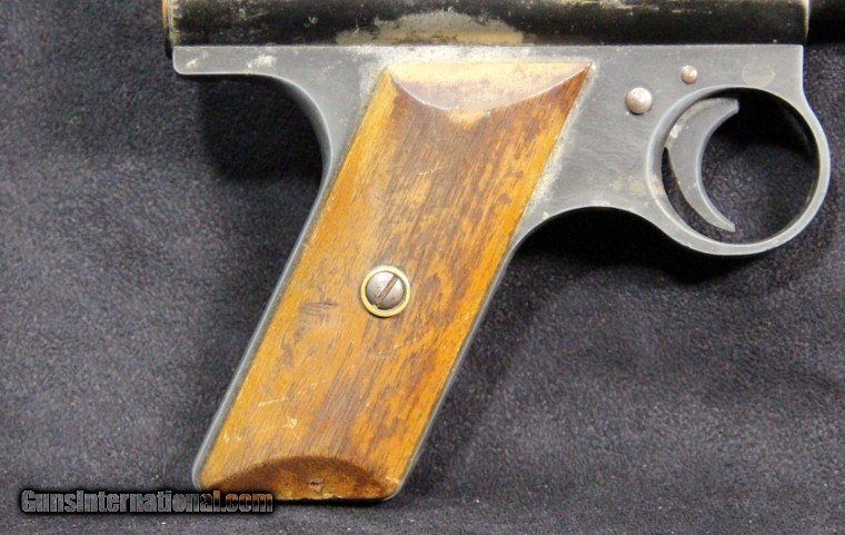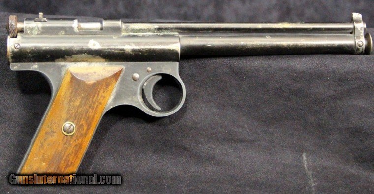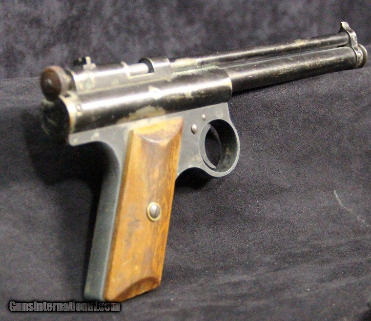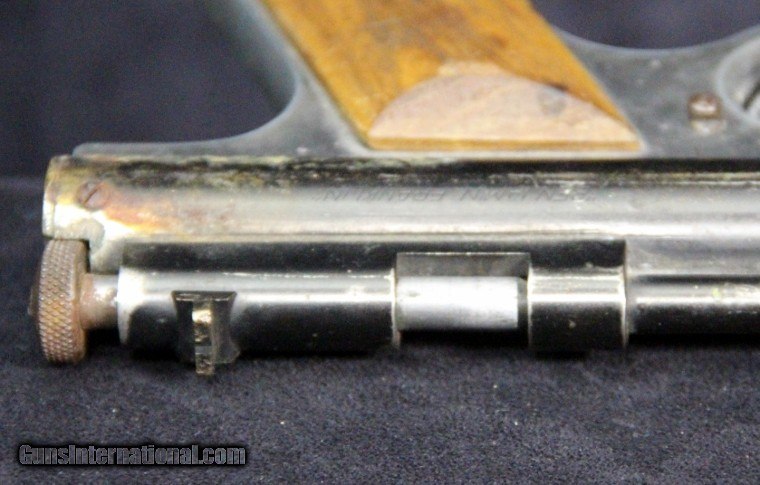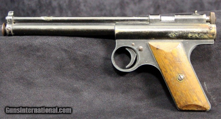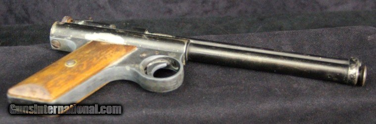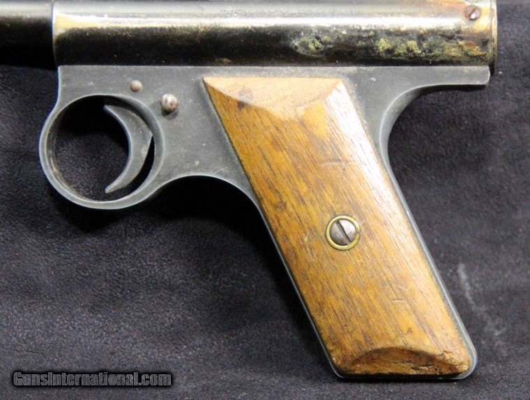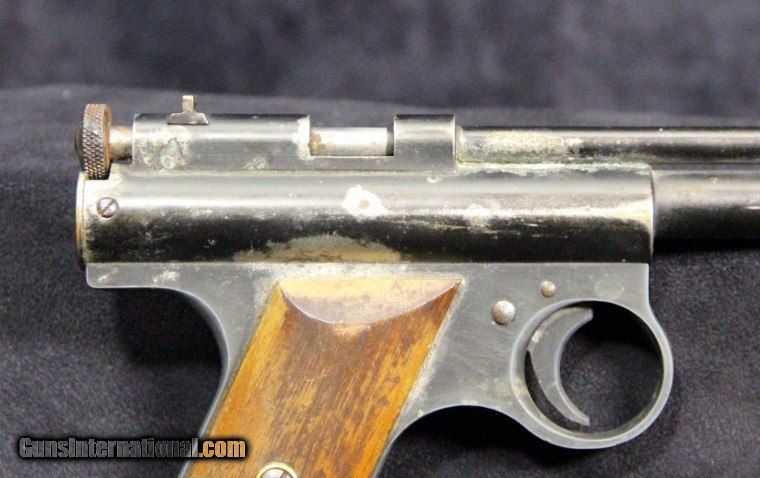 Description: .177 cal, rod-at-the-muzzle pump up pneumatic system, single shot, rifled bore, 80% finish overall, 7 inch barrel, black finish, 2 piece wood grips, manufactured 1935-1941. Condition: 80% finish overall, very good grips, functions well, very good marks. SOLD |