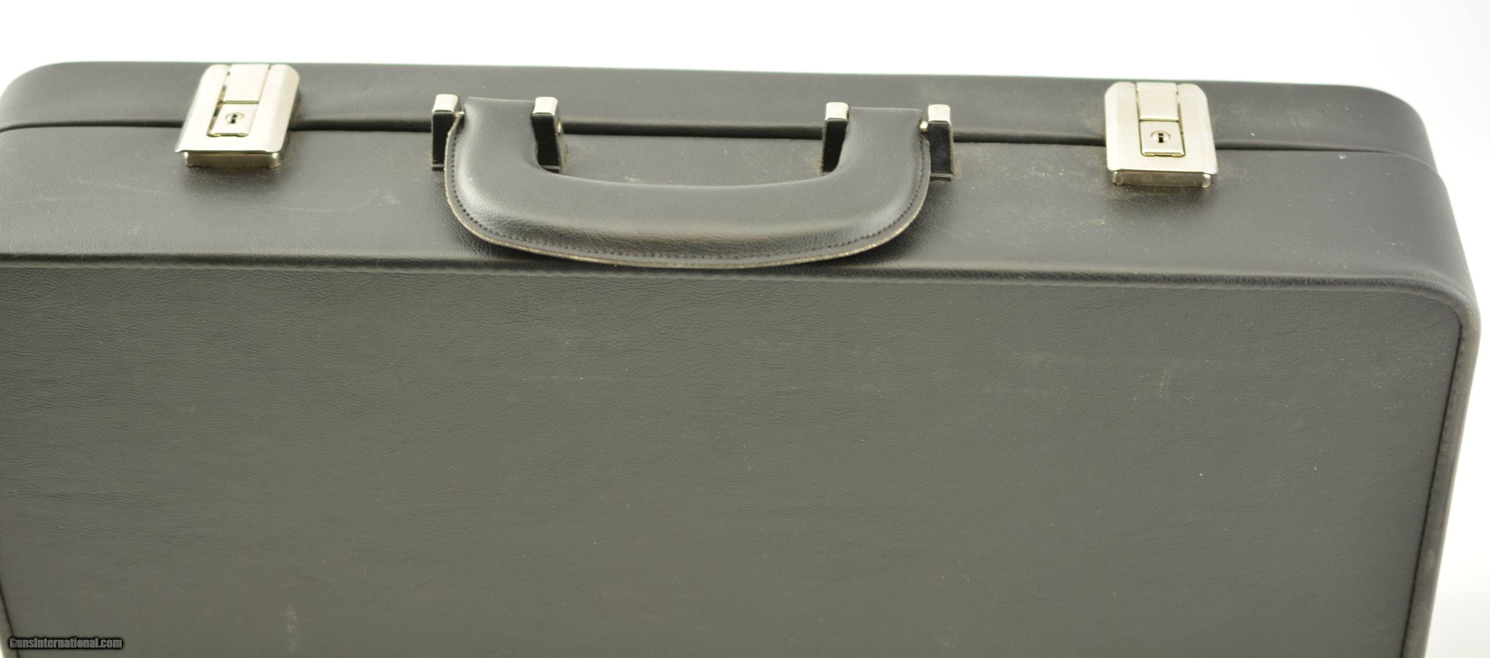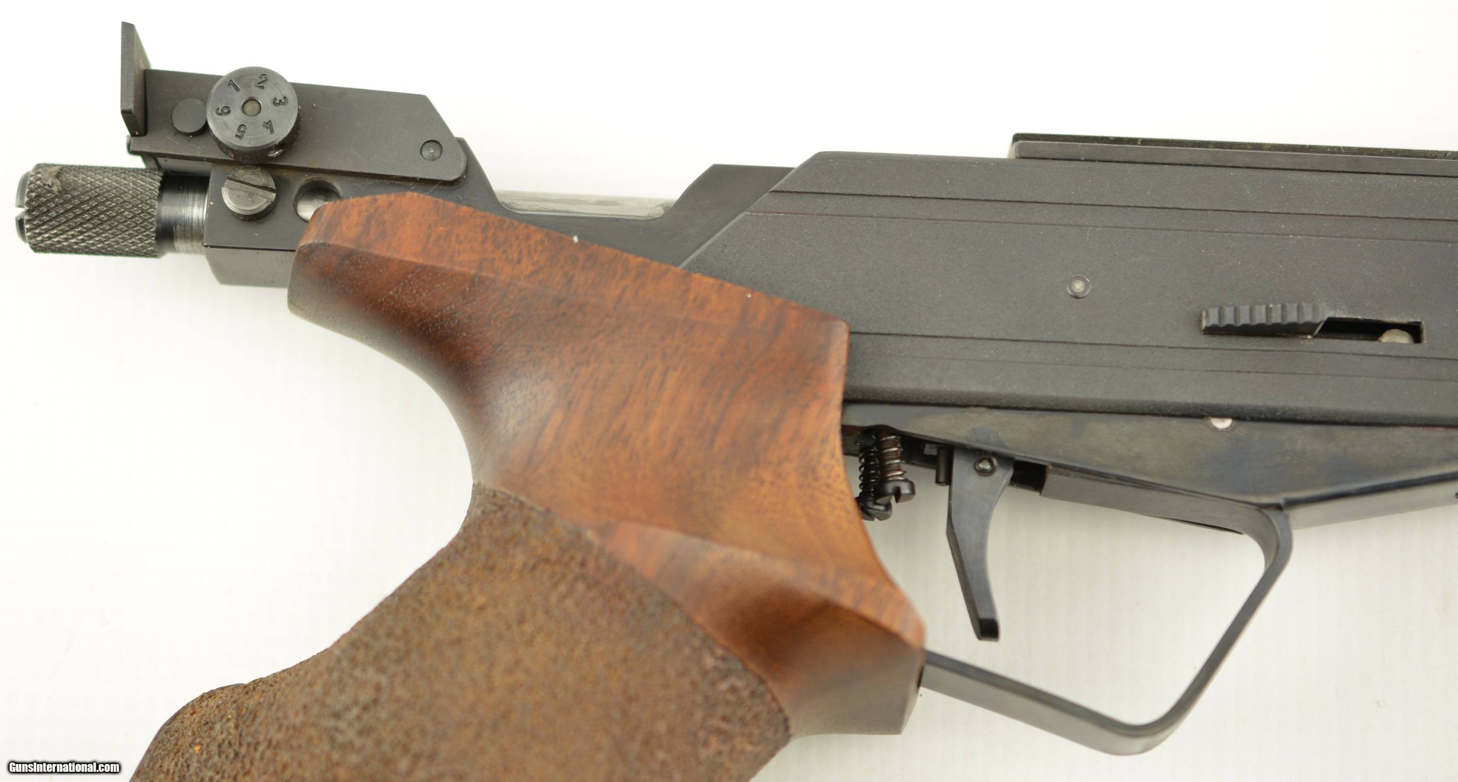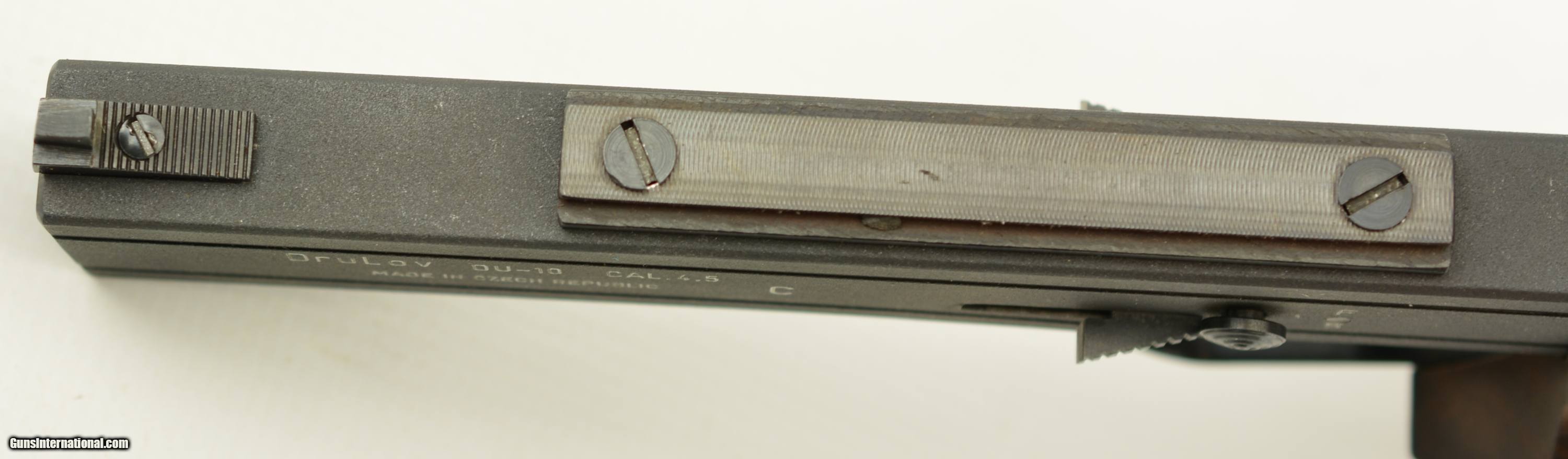 Description: Serial #6189, .177 Caliber, 7" barrel with an excellent, bright bore. This is a CO2 powered pistol that has a rotary locking breech, adjustable target sights, and integrated optics rail on the top. The metal retains 97-98% of the original matte black finish with some faint traces of silvering along the high edges, and the textured walnut target grips are in fine shape with only minor handling marks. The pistol is housed in the original carry case with a full set of tools and accessories, including a CO2 cylinder, instruction book, and tin of pellets. This is a precision, European-made gas powered pistol, and rates excellent condition overall. SOLD Manufacturer: Drulov Model: DU-10 Serial Number: 6189 Caliber Info: .177 Gauge Info: .177 |