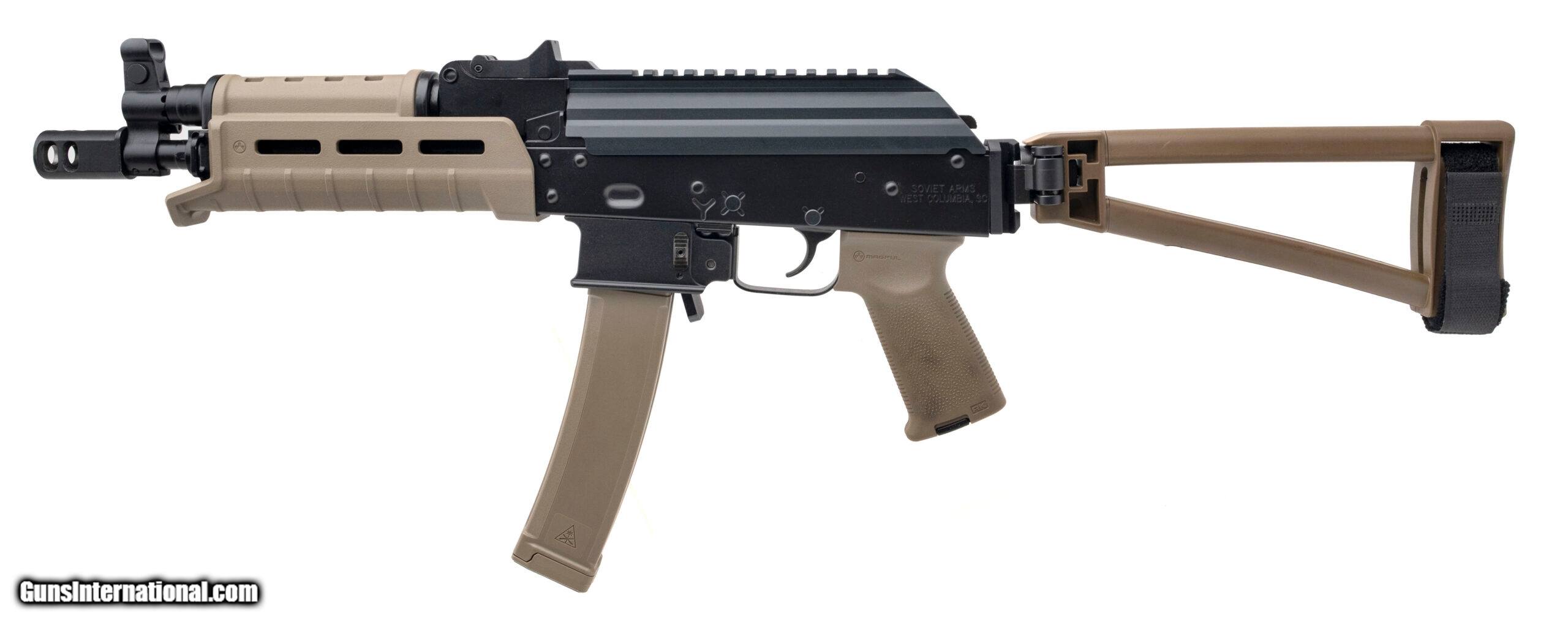Description: "SN: V002951. Modern production, 9m with a 10.5"" barrel w/2-port muzzle brake. Bore is bright with strong rifling. Semi-auto tactical AK pistol with FDE Magpul furniture, picatinny rail dust cover, and an FDE SB Tactical side-folding brace. Near excellent condition overall. Price: $850.00 Contact Seller |