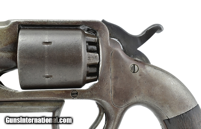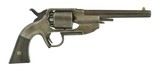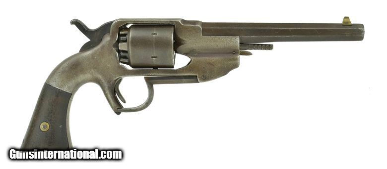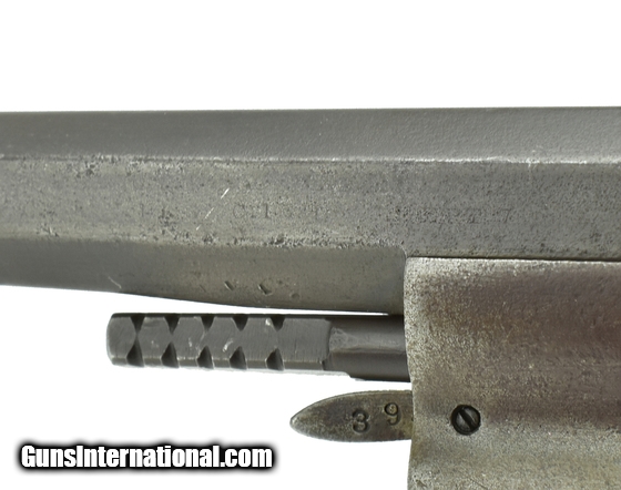 Description: Allen & Wheelock Center Hammer Navy Revolver. 6” Barrel length. .36 Caliber. Estimated production at 500. Action works perfectly. Gun has a gray and brown patina. Grips are good plus. Scarce revolver. Note: Allen & Wheelock name and address on left vertical barrel flat is almost gone due to wear, and is barely visible. The rest of the revolver is good plus. SOLD |