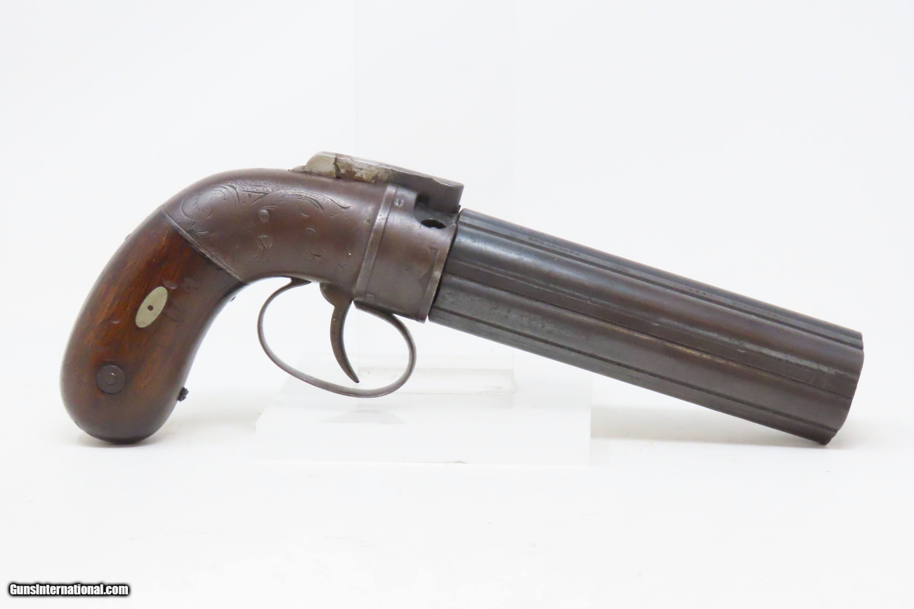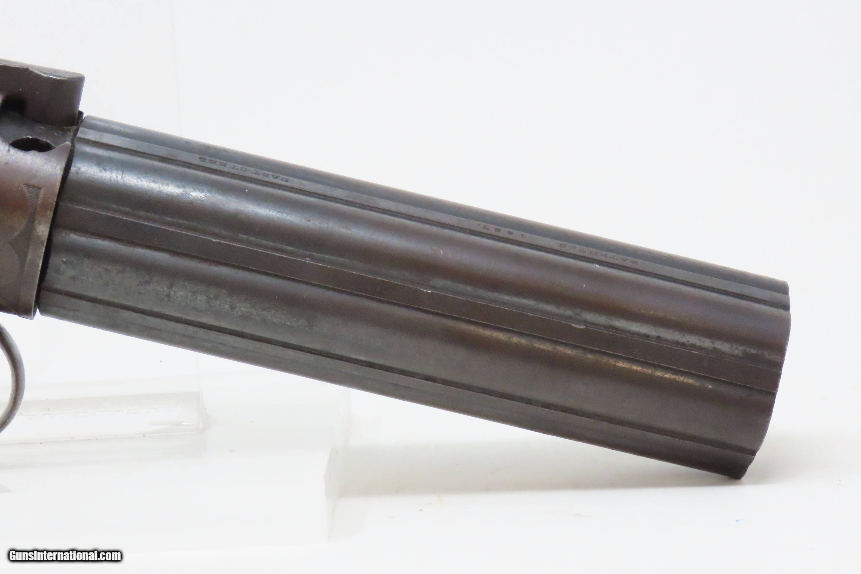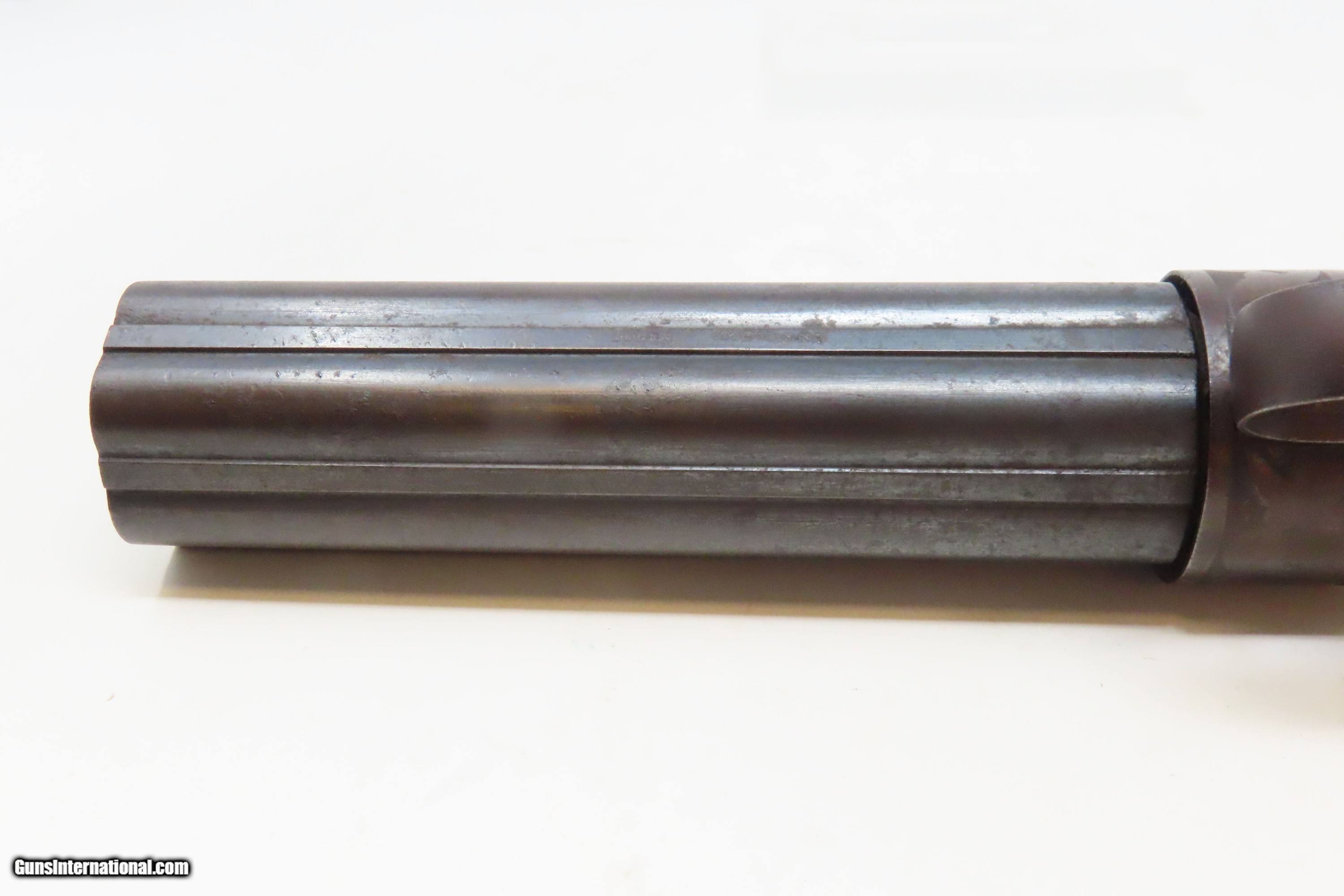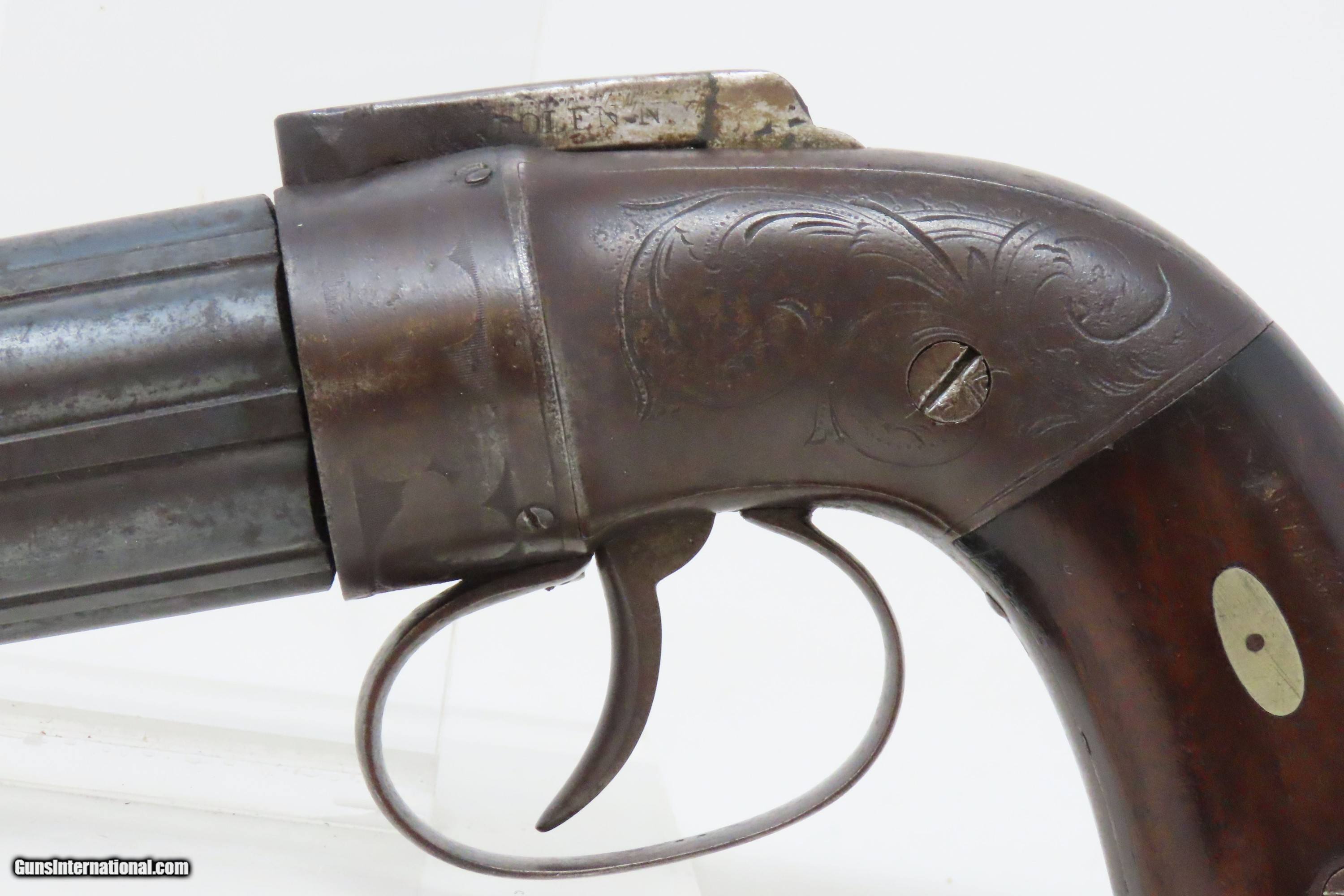 Description: 1840s mfr. BROADWAY NYC ALLEN & THURBER .36 Cal. PEPPERBOX Revolver Antique J.G. Bolen NEW YORK RETAILER Marked Here we present an antique Allen & Thurber Bar Hammer 6-shot Percussion “Dragoon” Pepperbox pistol made circa the 1840s in Massachusetts and sold by J.G. Bolen in his shop at 104 Broadway in New York City. John George Bolen (1809-1888) was the son of a hardware entrepreneur who also had a shop on Broadway. John was an engraver, inventor, and gun shop owner. His shop was located across the street from Trinity Church and he lived on State Street in Brooklyn. His advertisements for this particular type of gun by Ethan Allen are excellent: “LIFE AND PROPERTY PRESERVERS, FOR HOUSEKEEPERS, TRAVELLERS, CAPTAINS, AND OTHERS, PATENT SELF-COCKING & SELF-REVOLVING POCKET PISTOLS!! The Greatest Modern Improvement in Fire-Arms!!! This Pistol can be discharged at times with almost the rapidity of thought. The Pistol cocks; the barrel revolves and discharges, merely by pulling the trigger; not requiring to be cocked as the common Pistol, they can be fired the moment they are taken from the pocket with one hand only. They are no larger than an ordinary Pocket Pistol, and, weighting but 13 ounces, can be carried in the pocket without the least inconvenience. The locks and the whole Pistol are not so liable to get out of order as the common Pistol. Gentlemen are invited to call at the store of the Advertiser and examine the same, as their simplicity, perfect safety, and non-liability to get out of order, will certainly recommend them over all others. For Travellers, Housekeepers, Captains, and Planters, they are an Indispensable article, as persons, both male and female, can with this Pistol protect their lives and properties attacked by several persons.” Ethan Allen was already a prolific inventor and successful businessman in the 1830s when he came up with this design. This percussion, six-shot, double-action pocket revolver was a very popular pistol that was produced in Worcester, Massachusetts. It’s a 31-caliber pepperbox with a revolving screw off fluted barrel and has factory engravings in a floral motif executed on both sides of the frame. These pistols enjoyed even greater popularity than Sam Colt’s first pistol. The history that these pistols enjoyed over the years is astounding: the Seminole Wars, Gold Rush, Mexican War and American Civil War. Brigham Young himself carried one very similar to this example. These guns are true relics of American history. This early example of a double-action pistol must have been quite a selling point. As these were considered “point and shoot” short range defensive weapons or “belly guns”, the market did not seem to object to the limitation of not having sights. The overall condition is good. Robust action. Bores are in good shape. The frame is lightly engraved. Solid grips. Two nipples are missing. The finish has matured into a dark patina. Markings are legible. Own the original! This is a legitimate antique and not a reproduction. Barrel is 5-1/8 inches. Caliber: .36 Percussion Overall condition as seen in photos. Very Fast. Very Safe. FREE SHIPPING WORLDWIDE. Delivered directly to your door by express mail! Guaranteed AUTHENTIC & Includes CERTIFICATE OF AUTHENTICITY. ancestryguns $1800 #234052 SOLD Antique: Yes |