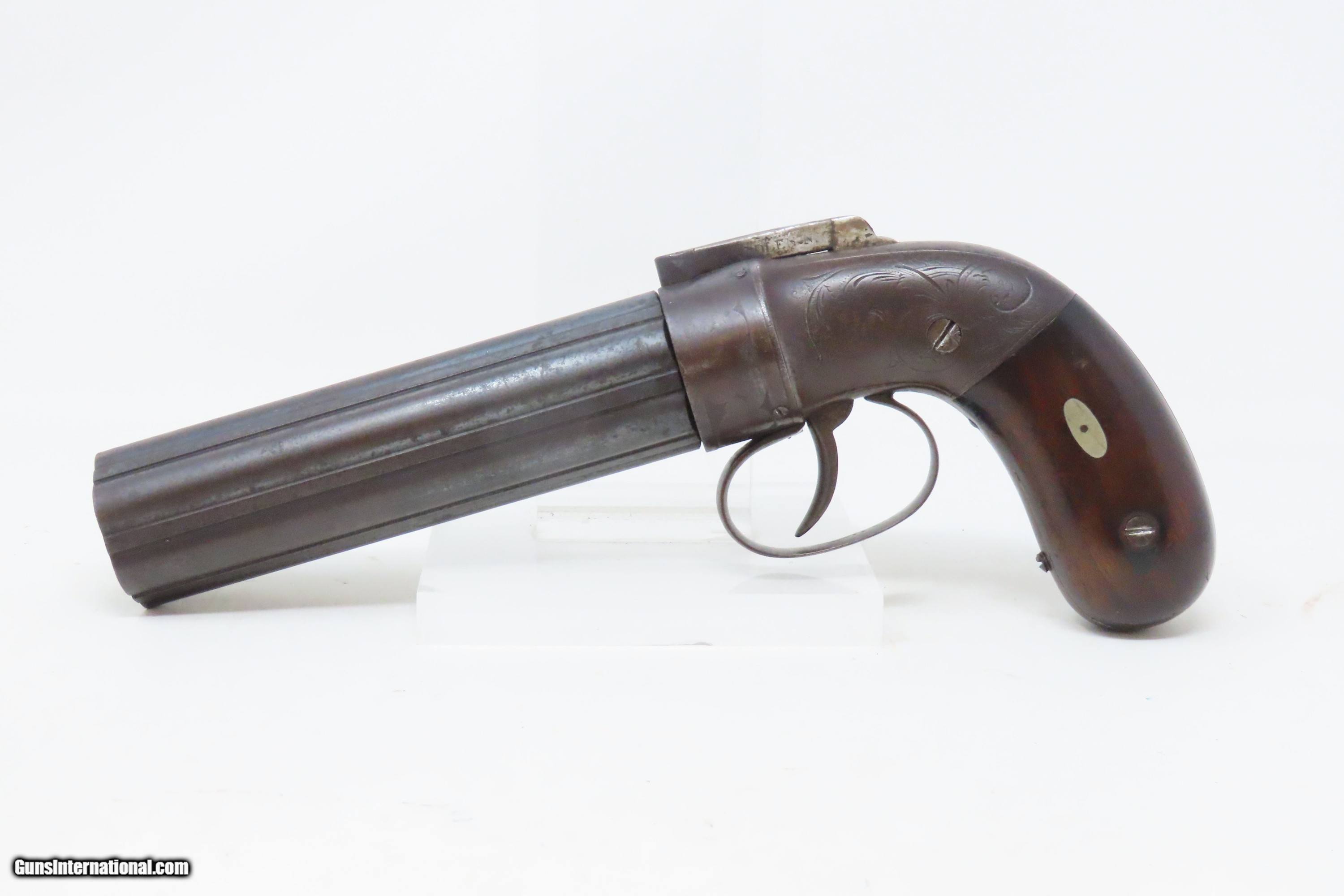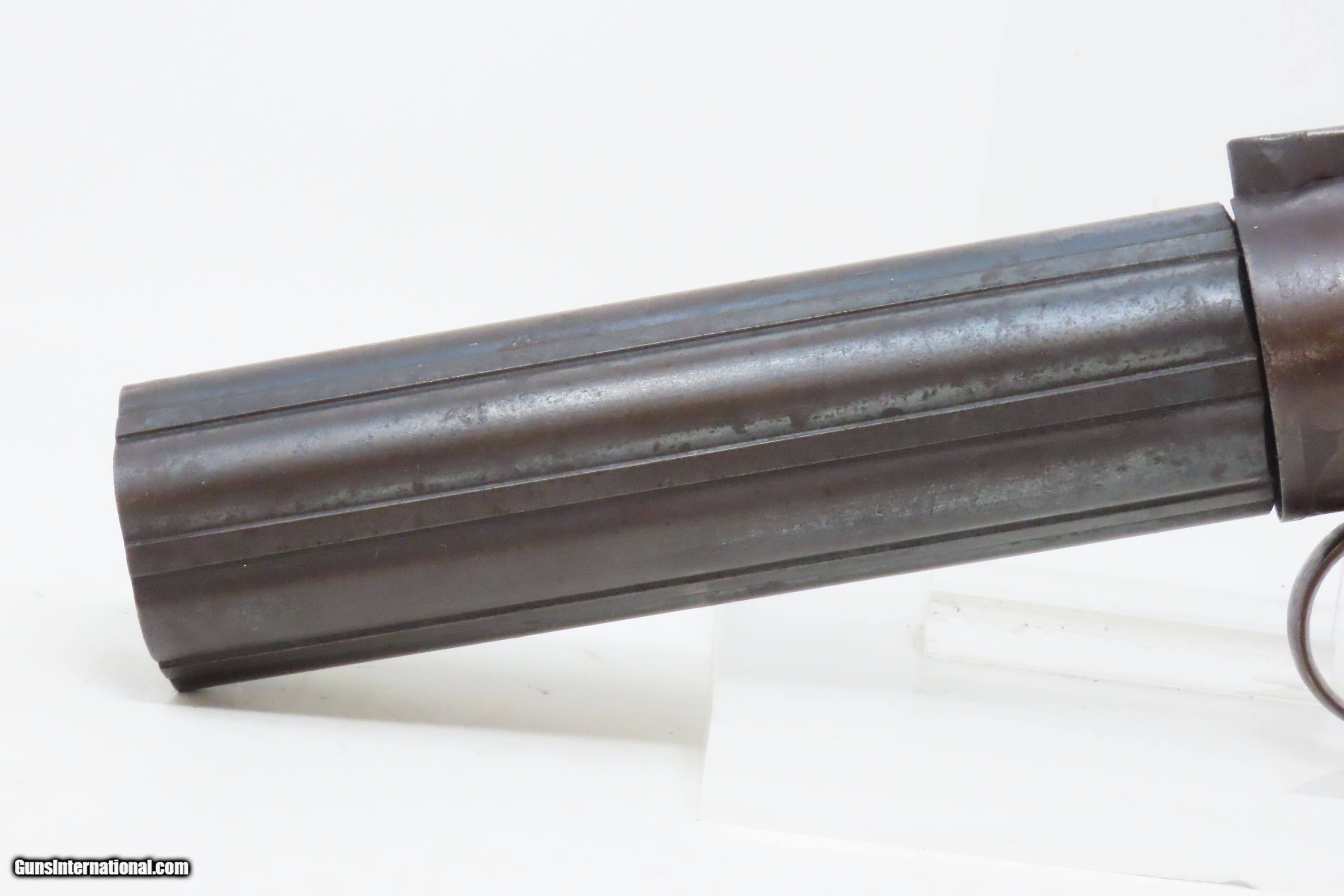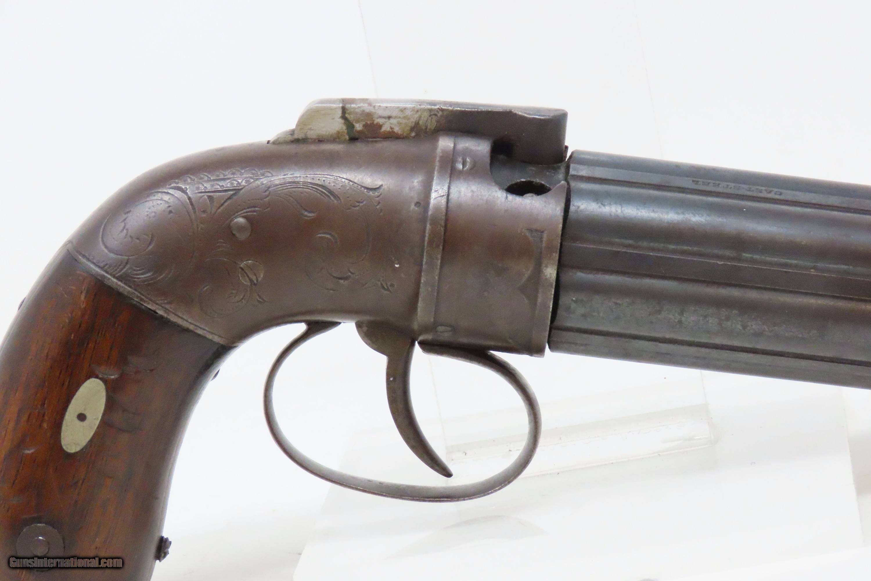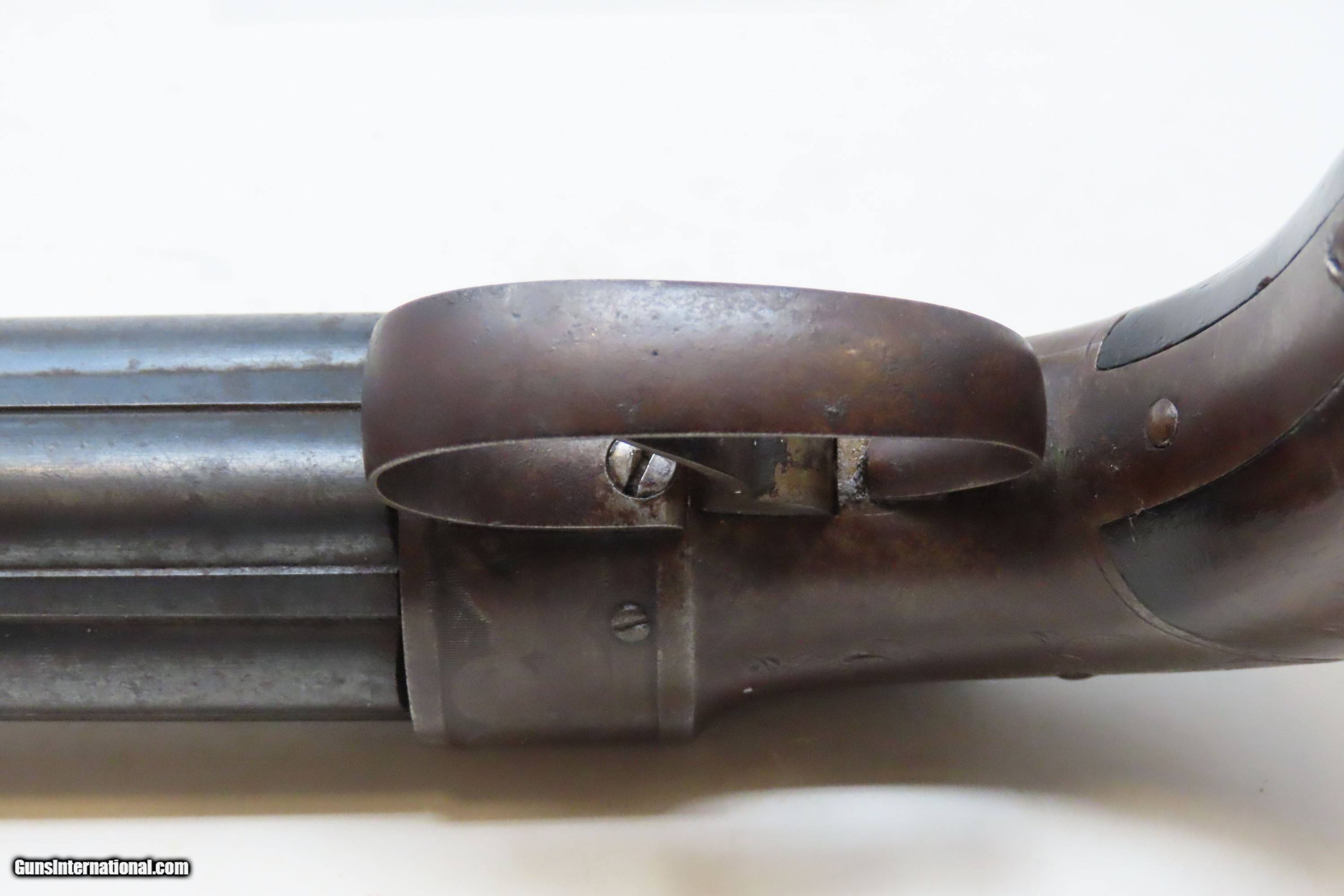 Description: 1840s mfr. BROADWAY NYC ALLEN & THURBER .36 Cal. PEPPERBOX Revolver Antique J.G. Bolen NEW YORK RETAILER Marked Here we present an antique Allen & Thurber Bar Hammer 6-shot Percussion “Dragoon” Pepperbox pistol made circa the 1840s in Massachusetts and sold by J.G. Bolen in his shop at 104 Broadway in New York City. John George Bolen (1809-1888) was the son of a hardware entrepreneur who also had a shop on Broadway. John was an engraver, inventor, and gun shop owner. His shop was located across the street from Trinity Church and he lived on State Street in Brooklyn. His advertisements for this particular type of gun by Ethan Allen are excellent: “LIFE AND PROPERTY PRESERVERS, FOR HOUSEKEEPERS, TRAVELLERS, CAPTAINS, AND OTHERS, PATENT SELF-COCKING & SELF-REVOLVING POCKET PISTOLS!! The Greatest Modern Improvement in Fire-Arms!!! This Pistol can be discharged at times with almost the rapidity of thought. The Pistol cocks; the barrel revolves and discharges, merely by pulling the trigger; not requiring to be cocked as the common Pistol, they can be fired the moment they are taken from the pocket with one hand only. They are no larger than an ordinary Pocket Pistol, and, weighting but 13 ounces, can be carried in the pocket without the least inconvenience. The locks and the whole Pistol are not so liable to get out of order as the common Pistol. Gentlemen are invited to call at the store of the Advertiser and examine the same, as their simplicity, perfect safety, and non-liability to get out of order, will certainly recommend them over all others. For Travellers, Housekeepers, Captains, and Planters, they are an Indispensable article, as persons, both male and female, can with this Pistol protect their lives and properties attacked by several persons.” Ethan Allen was already a prolific inventor and successful businessman in the 1830s when he came up with this design. This percussion, six-shot, double-action pocket revolver was a very popular pistol that was produced in Worcester, Massachusetts. It’s a 31-caliber pepperbox with a revolving screw off fluted barrel and has factory engravings in a floral motif executed on both sides of the frame. These pistols enjoyed even greater popularity than Sam Colt’s first pistol. The history that these pistols enjoyed over the years is astounding: the Seminole Wars, Gold Rush, Mexican War and American Civil War. Brigham Young himself carried one very similar to this example. These guns are true relics of American history. This early example of a double-action pistol must have been quite a selling point. As these were considered “point and shoot” short range defensive weapons or “belly guns”, the market did not seem to object to the limitation of not having sights. The overall condition is good. Robust action. Bores are in good shape. The frame is lightly engraved. Solid grips. Two nipples are missing. The finish has matured into a dark patina. Markings are legible. Own the original! This is a legitimate antique and not a reproduction. Barrel is 5-1/8 inches. Caliber: .36 Percussion Overall condition as seen in photos. Very Fast. Very Safe. FREE SHIPPING WORLDWIDE. Delivered directly to your door by express mail! Guaranteed AUTHENTIC & Includes CERTIFICATE OF AUTHENTICITY. ancestryguns $1800 #234052 SOLD Antique: Yes |