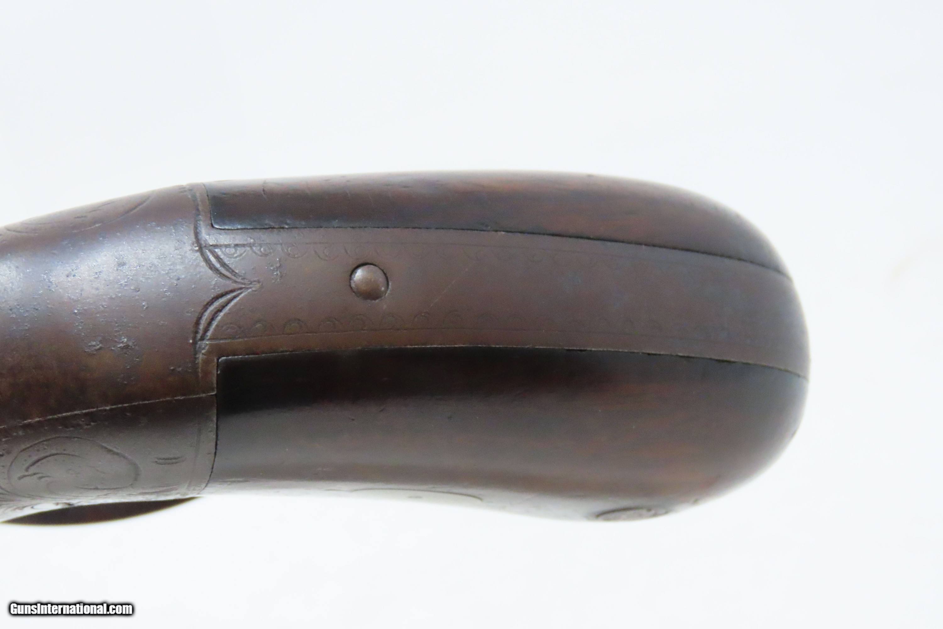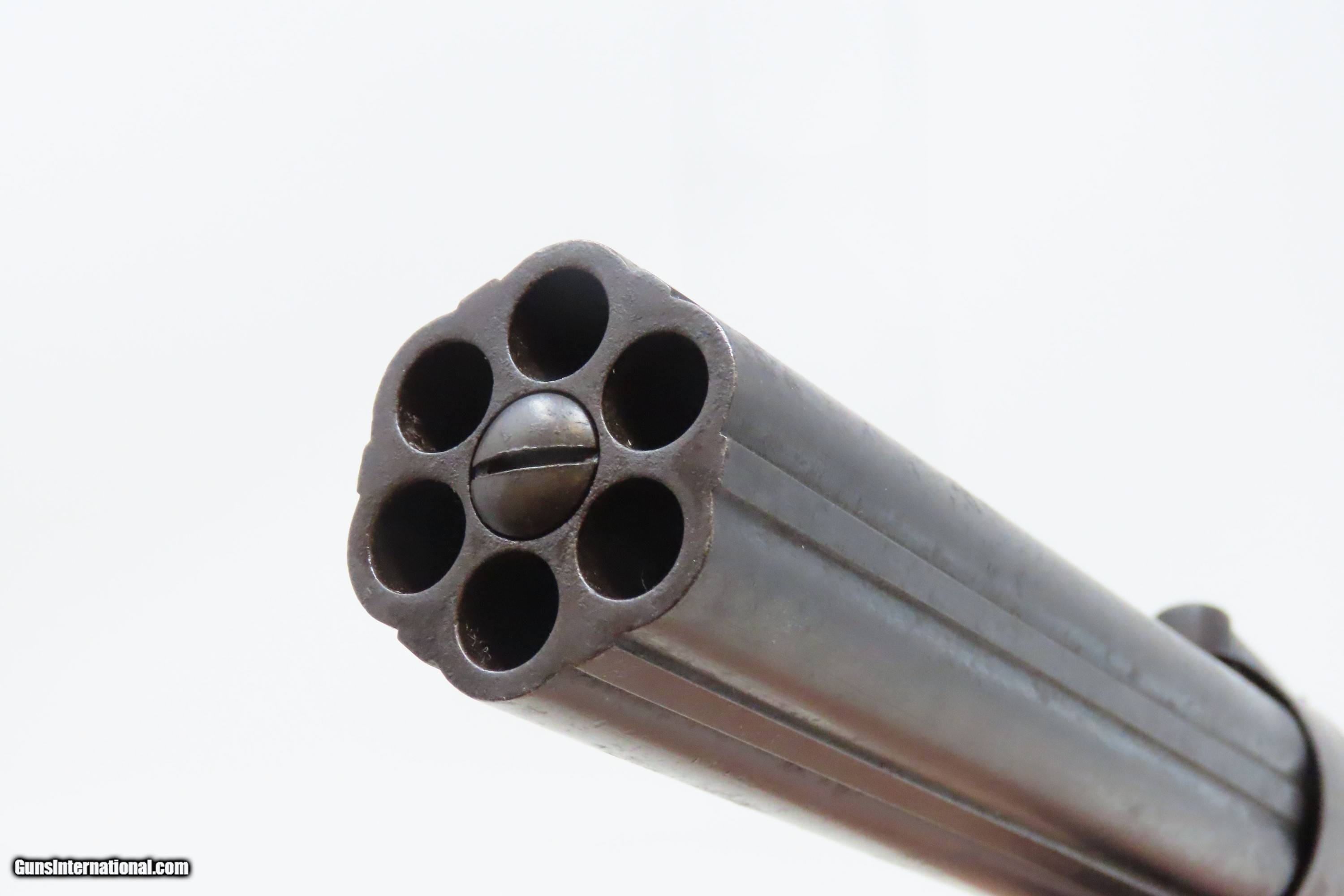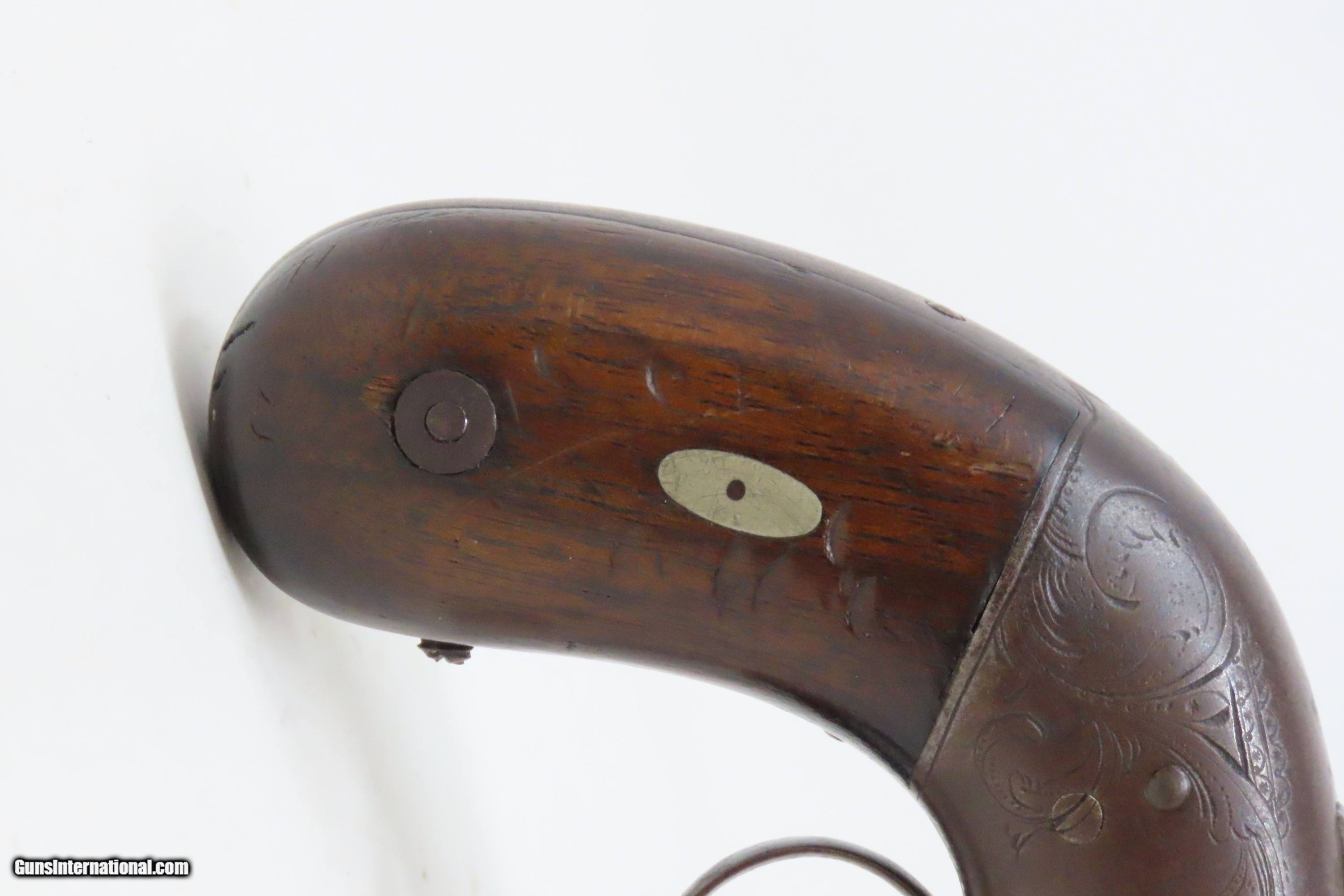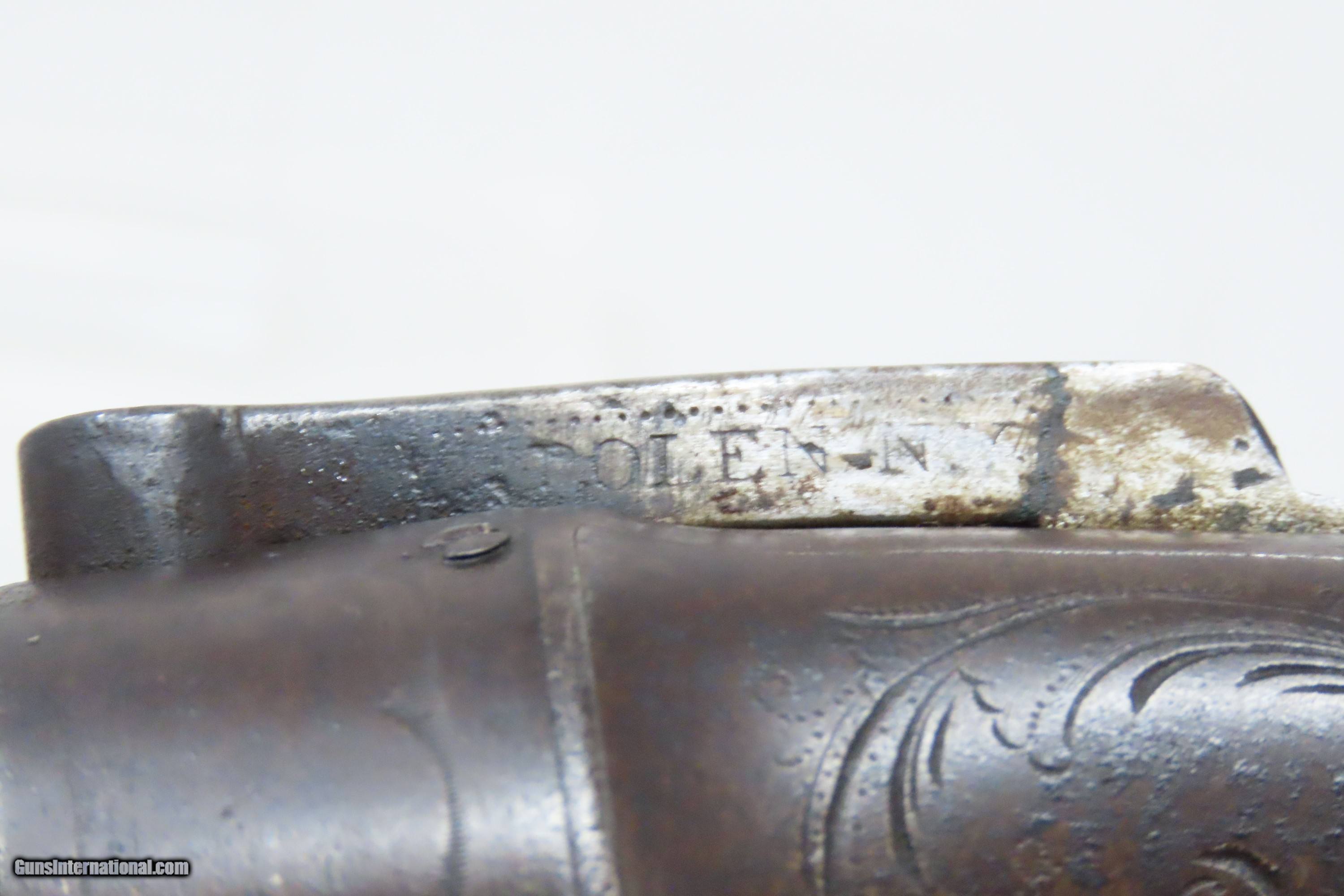 Description: 1840s mfr. BROADWAY NYC ALLEN & THURBER .36 Cal. PEPPERBOX Revolver Antique J.G. Bolen NEW YORK RETAILER Marked Here we present an antique Allen & Thurber Bar Hammer 6-shot Percussion “Dragoon” Pepperbox pistol made circa the 1840s in Massachusetts and sold by J.G. Bolen in his shop at 104 Broadway in New York City. John George Bolen (1809-1888) was the son of a hardware entrepreneur who also had a shop on Broadway. John was an engraver, inventor, and gun shop owner. His shop was located across the street from Trinity Church and he lived on State Street in Brooklyn. His advertisements for this particular type of gun by Ethan Allen are excellent: “LIFE AND PROPERTY PRESERVERS, FOR HOUSEKEEPERS, TRAVELLERS, CAPTAINS, AND OTHERS, PATENT SELF-COCKING & SELF-REVOLVING POCKET PISTOLS!! The Greatest Modern Improvement in Fire-Arms!!! This Pistol can be discharged at times with almost the rapidity of thought. The Pistol cocks; the barrel revolves and discharges, merely by pulling the trigger; not requiring to be cocked as the common Pistol, they can be fired the moment they are taken from the pocket with one hand only. They are no larger than an ordinary Pocket Pistol, and, weighting but 13 ounces, can be carried in the pocket without the least inconvenience. The locks and the whole Pistol are not so liable to get out of order as the common Pistol. Gentlemen are invited to call at the store of the Advertiser and examine the same, as their simplicity, perfect safety, and non-liability to get out of order, will certainly recommend them over all others. For Travellers, Housekeepers, Captains, and Planters, they are an Indispensable article, as persons, both male and female, can with this Pistol protect their lives and properties attacked by several persons.” Ethan Allen was already a prolific inventor and successful businessman in the 1830s when he came up with this design. This percussion, six-shot, double-action pocket revolver was a very popular pistol that was produced in Worcester, Massachusetts. It’s a 31-caliber pepperbox with a revolving screw off fluted barrel and has factory engravings in a floral motif executed on both sides of the frame. These pistols enjoyed even greater popularity than Sam Colt’s first pistol. The history that these pistols enjoyed over the years is astounding: the Seminole Wars, Gold Rush, Mexican War and American Civil War. Brigham Young himself carried one very similar to this example. These guns are true relics of American history. This early example of a double-action pistol must have been quite a selling point. As these were considered “point and shoot” short range defensive weapons or “belly guns”, the market did not seem to object to the limitation of not having sights. The overall condition is good. Robust action. Bores are in good shape. The frame is lightly engraved. Solid grips. Two nipples are missing. The finish has matured into a dark patina. Markings are legible. Own the original! This is a legitimate antique and not a reproduction. Barrel is 5-1/8 inches. Caliber: .36 Percussion Overall condition as seen in photos. Very Fast. Very Safe. FREE SHIPPING WORLDWIDE. Delivered directly to your door by express mail! Guaranteed AUTHENTIC & Includes CERTIFICATE OF AUTHENTICITY. ancestryguns $1800 #234052 SOLD Antique: Yes |