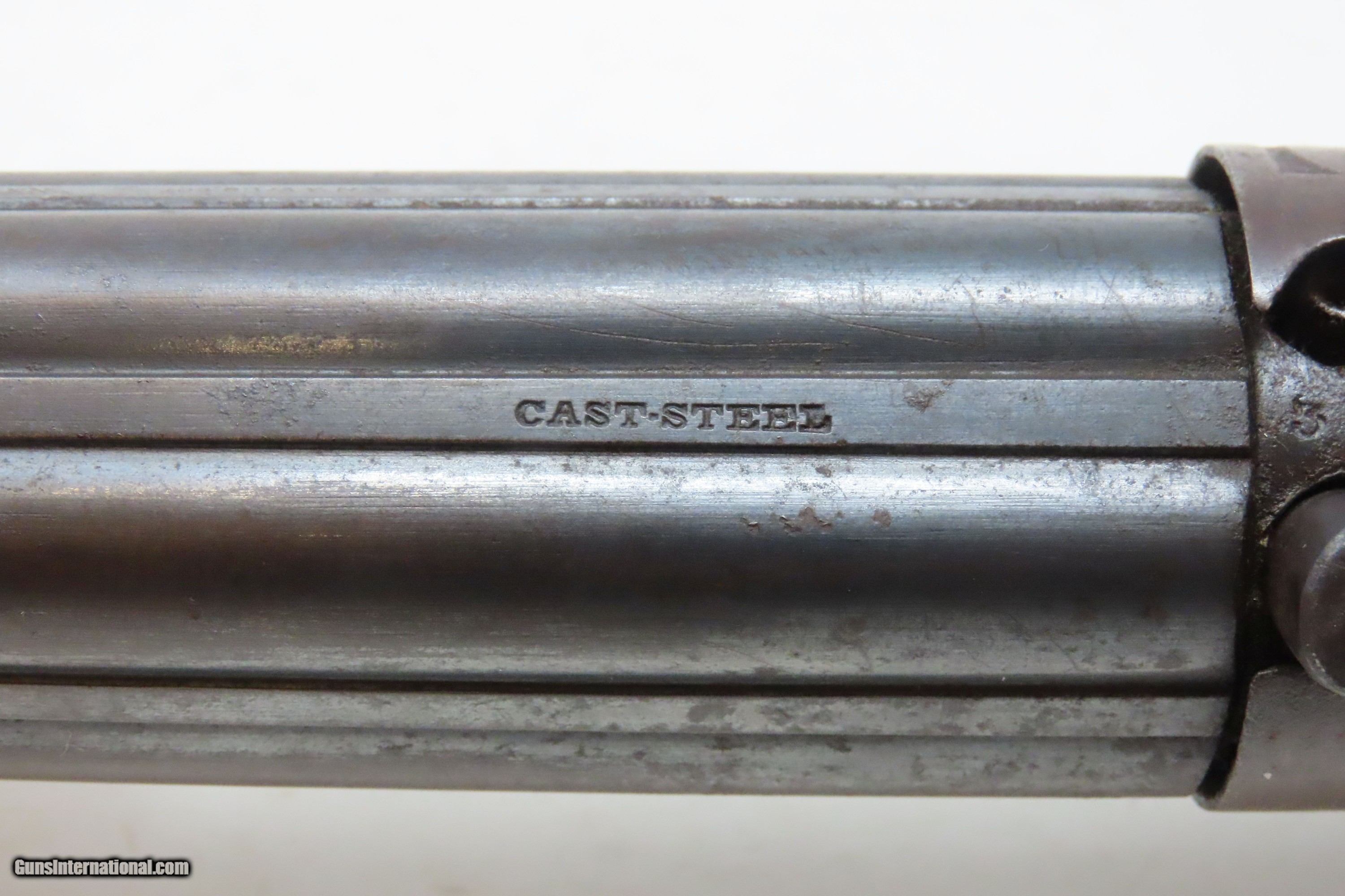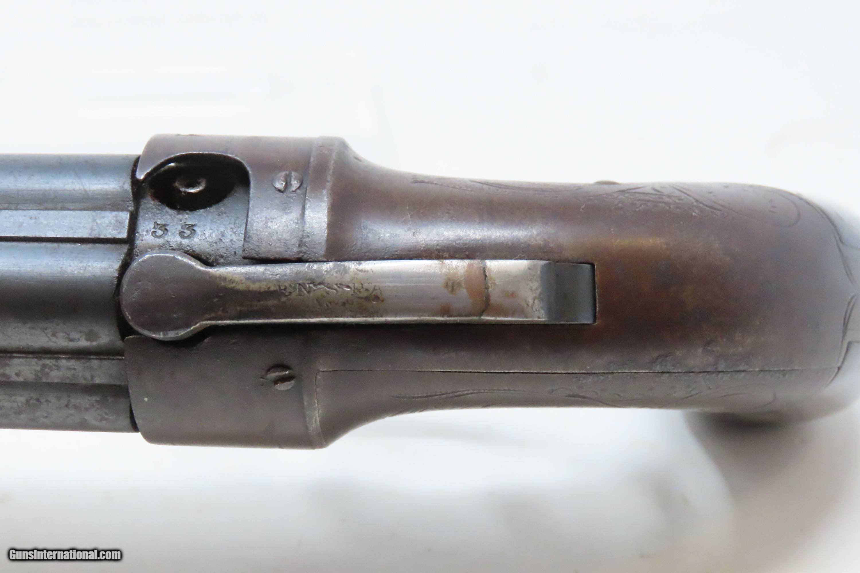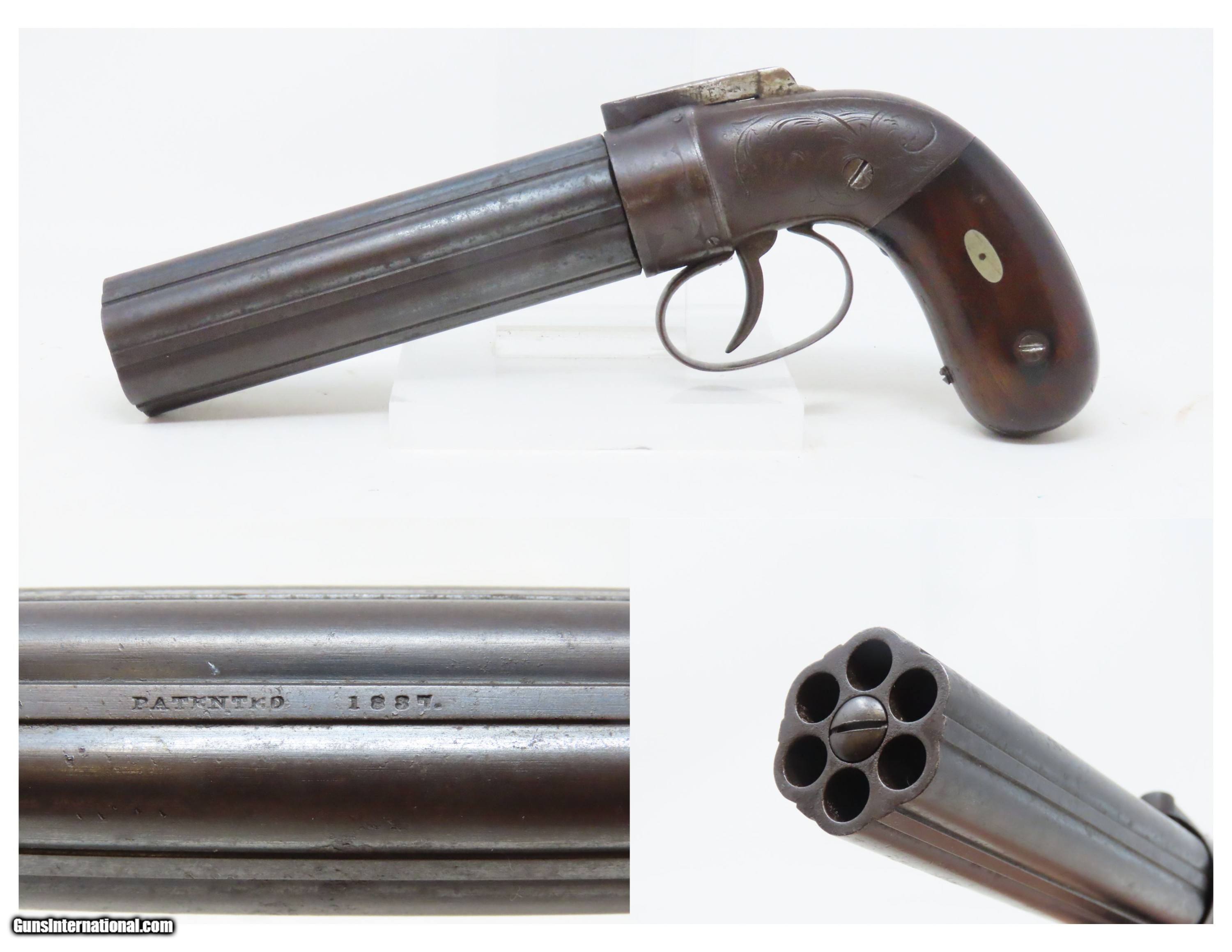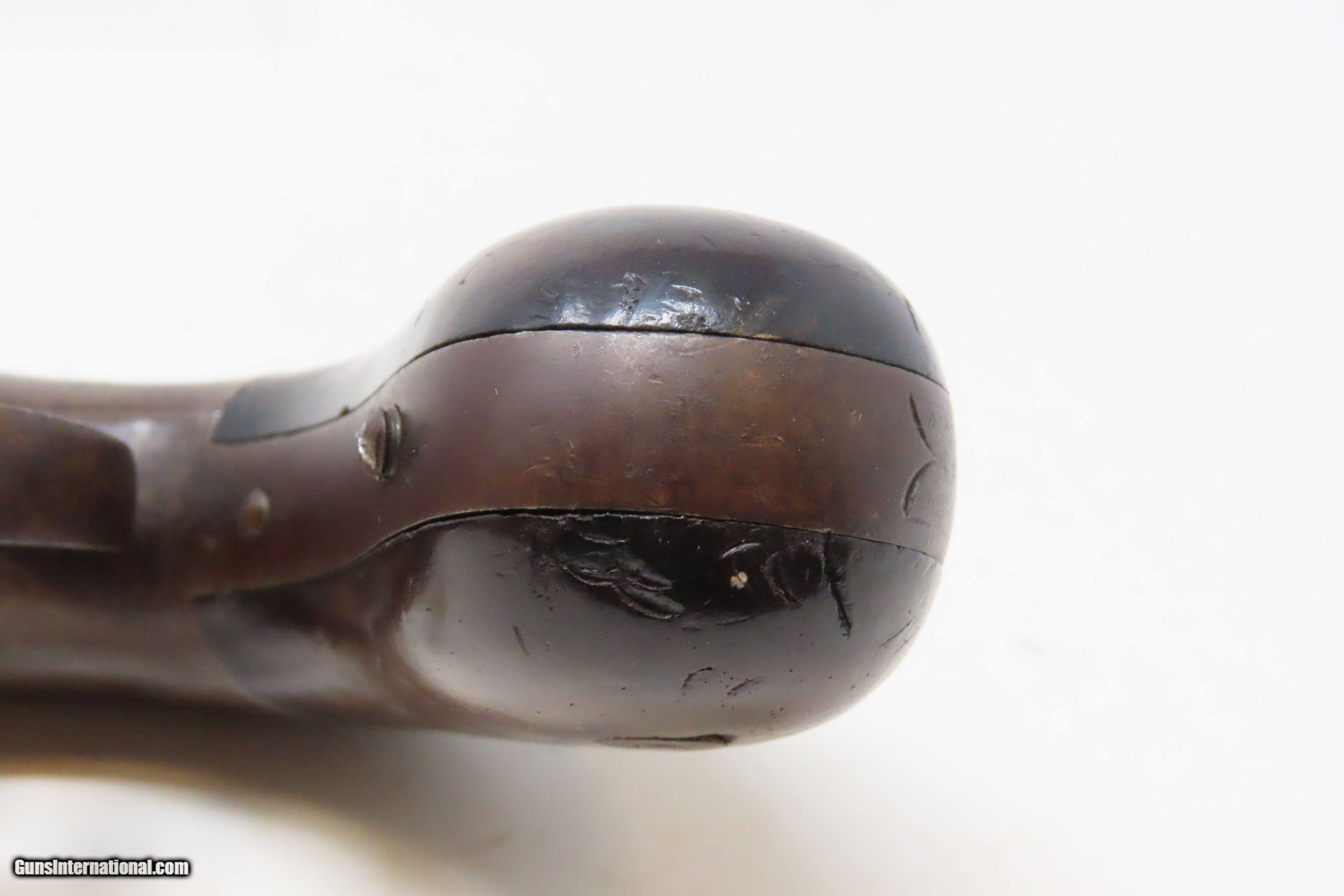 Description: 1840s mfr. BROADWAY NYC ALLEN & THURBER .36 Cal. PEPPERBOX Revolver Antique J.G. Bolen NEW YORK RETAILER Marked Here we present an antique Allen & Thurber Bar Hammer 6-shot Percussion “Dragoon” Pepperbox pistol made circa the 1840s in Massachusetts and sold by J.G. Bolen in his shop at 104 Broadway in New York City. John George Bolen (1809-1888) was the son of a hardware entrepreneur who also had a shop on Broadway. John was an engraver, inventor, and gun shop owner. His shop was located across the street from Trinity Church and he lived on State Street in Brooklyn. His advertisements for this particular type of gun by Ethan Allen are excellent: “LIFE AND PROPERTY PRESERVERS, FOR HOUSEKEEPERS, TRAVELLERS, CAPTAINS, AND OTHERS, PATENT SELF-COCKING & SELF-REVOLVING POCKET PISTOLS!! The Greatest Modern Improvement in Fire-Arms!!! This Pistol can be discharged at times with almost the rapidity of thought. The Pistol cocks; the barrel revolves and discharges, merely by pulling the trigger; not requiring to be cocked as the common Pistol, they can be fired the moment they are taken from the pocket with one hand only. They are no larger than an ordinary Pocket Pistol, and, weighting but 13 ounces, can be carried in the pocket without the least inconvenience. The locks and the whole Pistol are not so liable to get out of order as the common Pistol. Gentlemen are invited to call at the store of the Advertiser and examine the same, as their simplicity, perfect safety, and non-liability to get out of order, will certainly recommend them over all others. For Travellers, Housekeepers, Captains, and Planters, they are an Indispensable article, as persons, both male and female, can with this Pistol protect their lives and properties attacked by several persons.” Ethan Allen was already a prolific inventor and successful businessman in the 1830s when he came up with this design. This percussion, six-shot, double-action pocket revolver was a very popular pistol that was produced in Worcester, Massachusetts. It’s a 31-caliber pepperbox with a revolving screw off fluted barrel and has factory engravings in a floral motif executed on both sides of the frame. These pistols enjoyed even greater popularity than Sam Colt’s first pistol. The history that these pistols enjoyed over the years is astounding: the Seminole Wars, Gold Rush, Mexican War and American Civil War. Brigham Young himself carried one very similar to this example. These guns are true relics of American history. This early example of a double-action pistol must have been quite a selling point. As these were considered “point and shoot” short range defensive weapons or “belly guns”, the market did not seem to object to the limitation of not having sights. The overall condition is good. Robust action. Bores are in good shape. The frame is lightly engraved. Solid grips. Two nipples are missing. The finish has matured into a dark patina. Markings are legible. Own the original! This is a legitimate antique and not a reproduction. Barrel is 5-1/8 inches. Caliber: .36 Percussion Overall condition as seen in photos. Very Fast. Very Safe. FREE SHIPPING WORLDWIDE. Delivered directly to your door by express mail! Guaranteed AUTHENTIC & Includes CERTIFICATE OF AUTHENTICITY. ancestryguns $1800 #234052 SOLD Antique: Yes |