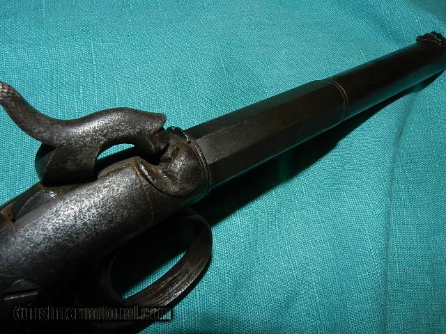 Description: Allen and Thurber long 6 3/4" barrel percussion .36 cal. pistol. Functions very well, and grips are good, showing very little wear. Has front and rear sight. Only marking on the gun is the number 85 under side of the barrel,also has : ALLEN & THURBER lightly stamped on the top of the barrel. metal is a smooth grey with age staining and not rusted. The rifled bore is good, and dark but not messed up.We don’t have asite .I prefer money orders or a check. Item ships when funds come in. If you can only pay with a card let me know. I hope you like my wide selection of unusual guns, knives and gun parts. Shipping price determined by zip code. I try to keep the prices affordable, which means I make less money than most dealers. You won’t get altitude sickness with my prices! I consistently have the best selection of older guns If you BUY IT NOW you must still contact us for details buy it now doesn't end the sale, it just sends an email telling us you want to buy this gun. A phone call won’t secure a sale! Not home many times, the first buyer by email buys the gun !Thissite doesnot close down a sale when you do a BUY IT NOW like Ebay!I can get six buy it nows in an hour, first buyer to email gets the guns, others are in second place! Best to send another email . Sometimes not home to get calls. Some guns are required shipment to a gun dealer near you for a transfer to you when it arrives. With the widest selection of older guns at great prices, We don’t have a store, and sell on the internet only. SOLD Antique: Yes |