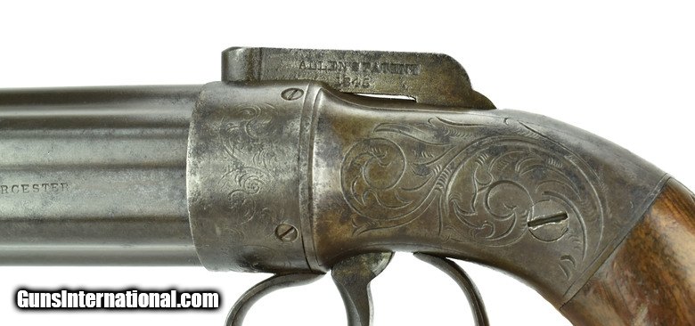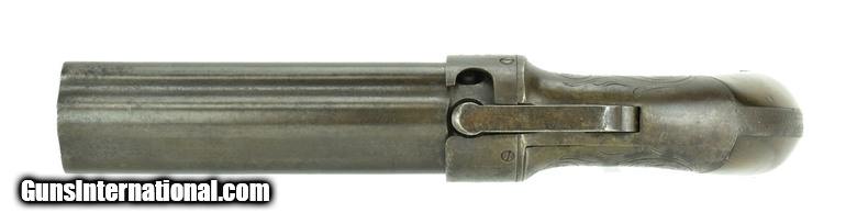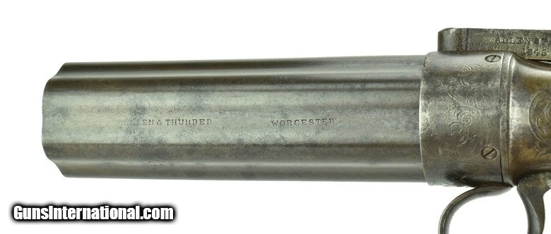 Description: Allen & Thurber 6-Shot .31 Caliber Pepperbox. Barrel length 5”. Action works perfectly. Frame is factory engraved as is the nipple shield. Grips are very good plus with 97-98% original factory varnish. No chips, no cracks. Barrels and frame have an even light brown patina. There is an isolated pit area on one of the barrel flutes but the overall appearance is very nice. Grips are excellent.