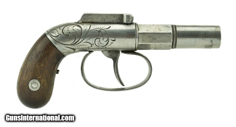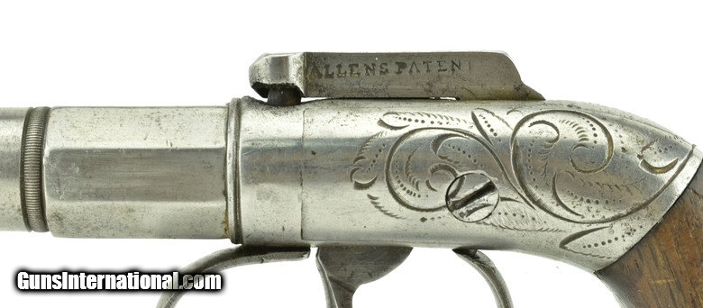 Allen & Thurber Bar Hammer .28 caliber pistol. 2” Barrel. Bar marked “Allens Patent”. Frame is factory leaf scroll engraved. Action works perfectly. Overall length 5”. Grips are very good with most of the varnish, This is a small size Allen that would also be of interest for a derringer collector. $295.00