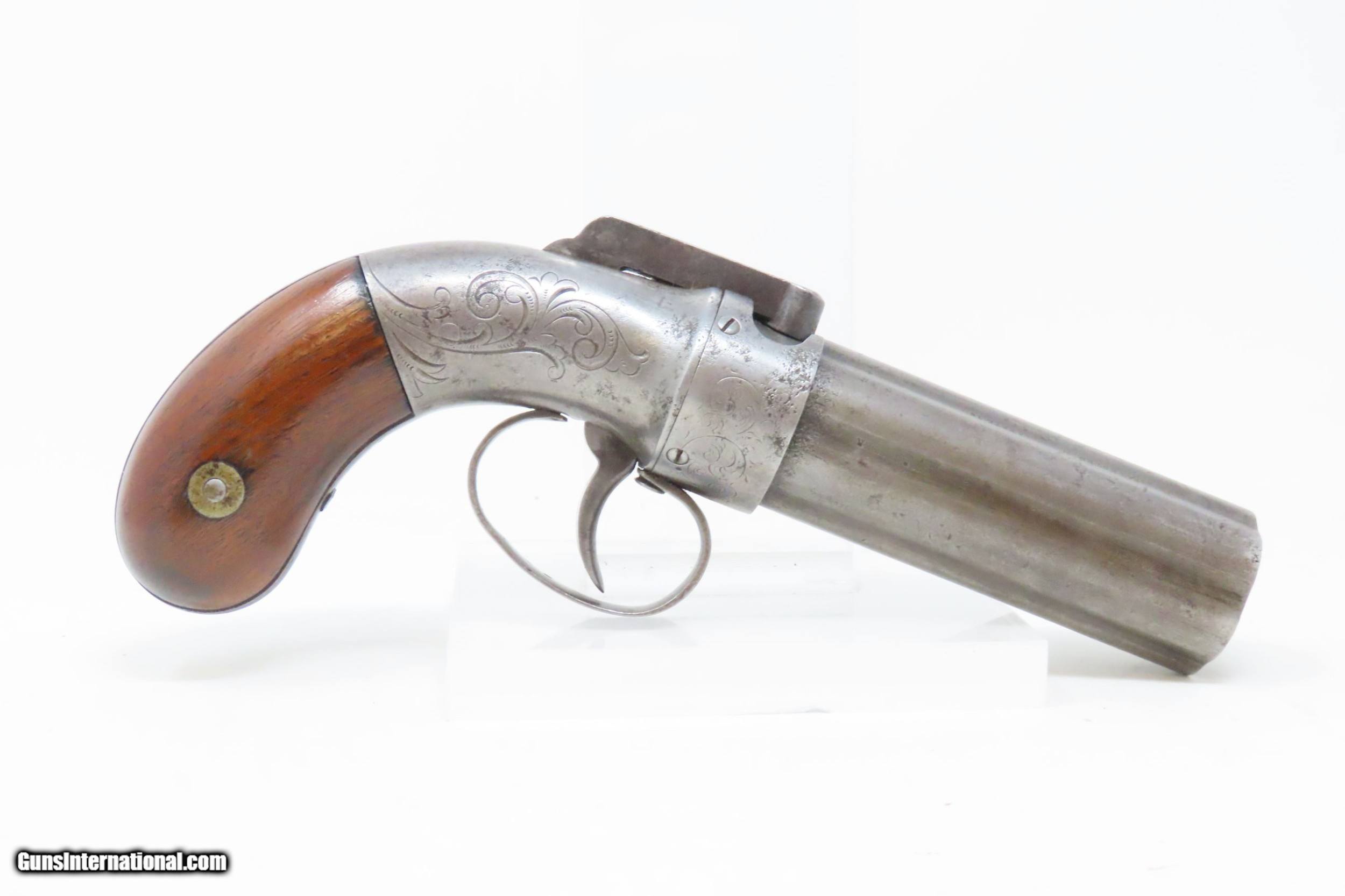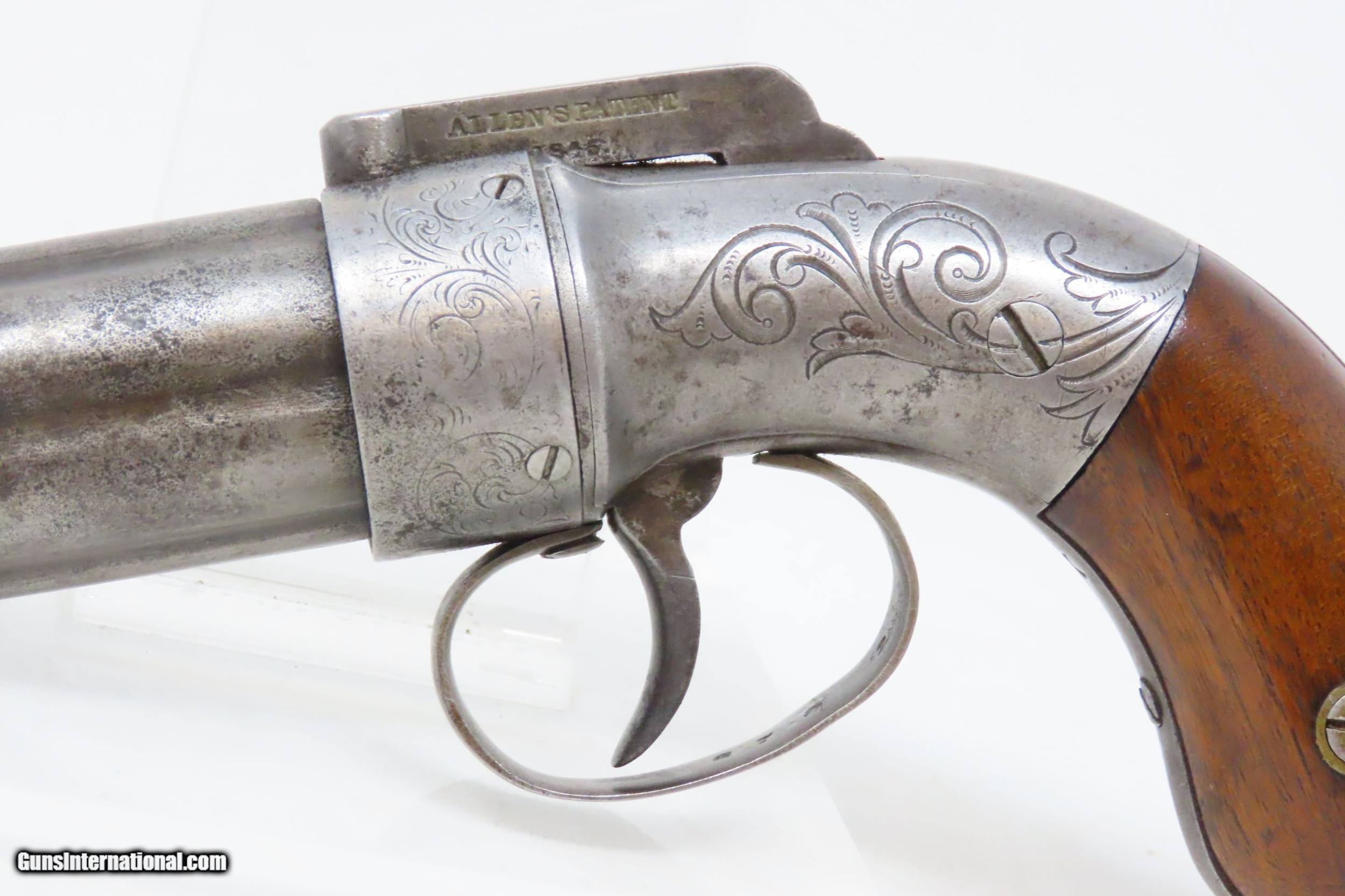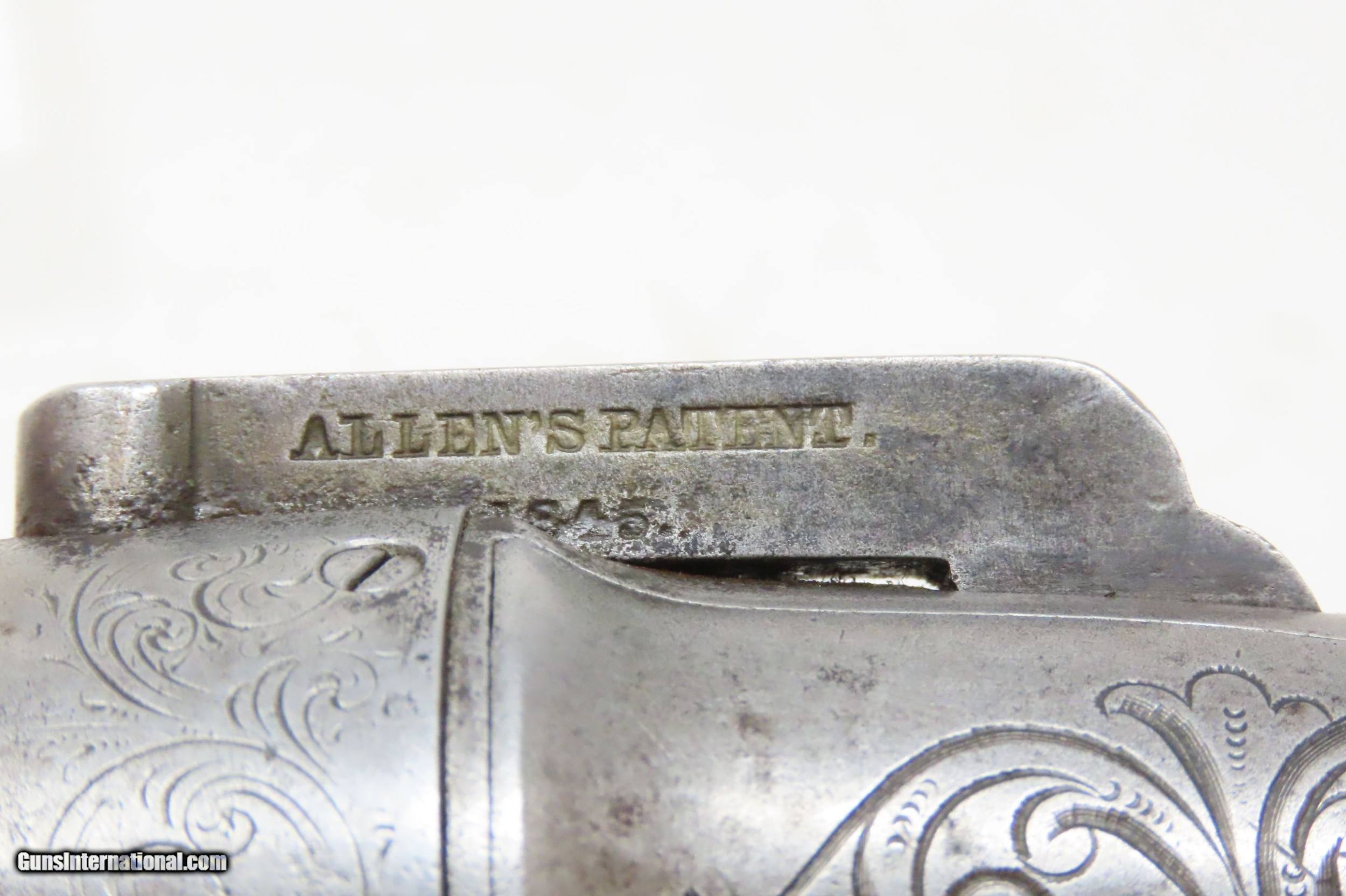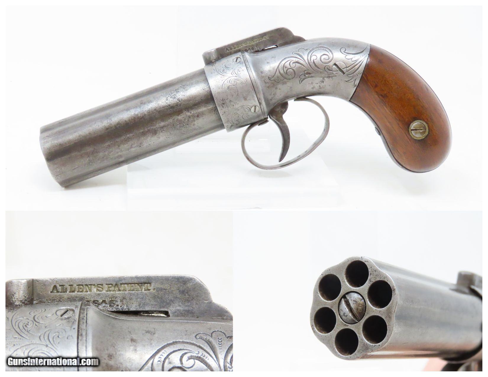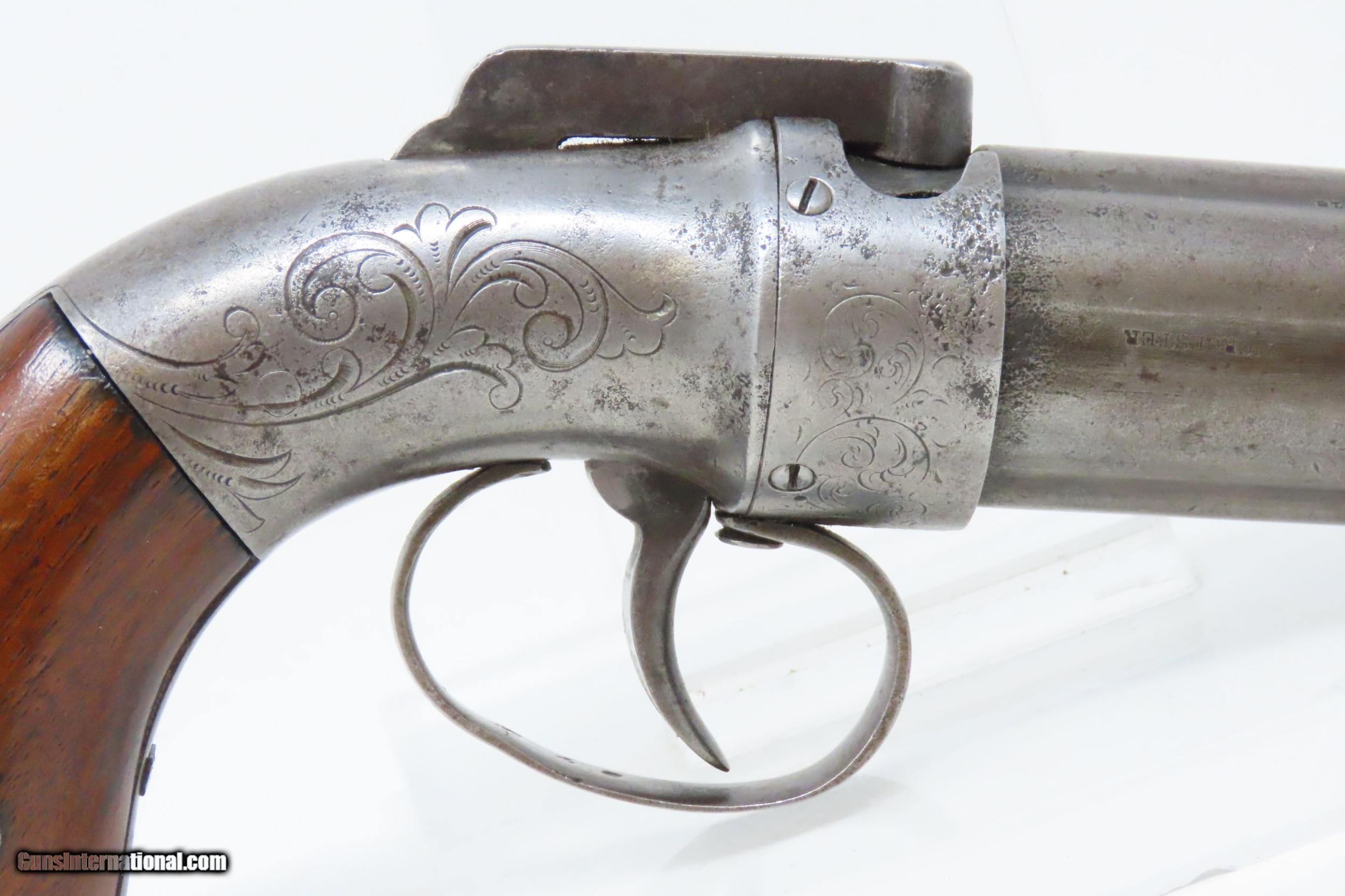 Description: ALLEN, THURBER & Co. Antique WORCHESTER .32 Bar Hammer PEPPERBOX Revolver First American Double Action Revolving Percussion Pistol Here we present an antique Allen Thurber & Co. Bar Hammer 6-shot Percussion Pepperbox pistol made circa 1854 to 1856 in Worcester, Massachusetts. Only six-barrel pepperbox pistols were produced during the Grafton and Norwich periods (1837–1847), and all had smooth barrel external contours until the later Worchester and Allen and Wheelock period, when fluted barrels became the norm. Though this is a six shot, it was during the Worchester period that the five-shot pepperbox was introduced. Percussion nipples were integrated to the barrels. Made with a bar hammer and standard trigger, models have been encountered with or without an integral nipple shield. While simplifying shooting (no manual cocking of the hammer), the bar hammer did preclude the inclusion of usable sights. However, this early example of a double-action pistol must have been quite a selling point. As these were considered “point and shoot” short range defensive weapons or “belly guns”, the market did not seem to object to the limitation of not having sights. Ethan Allen was already a prolific inventor and successful businessman in the 1830s when he came up with this design. This percussion, six-shot, double-action pocket revolver was a very popular pistol that was produced in Worcester, Massachusetts. It’s a 32-caliber pepperbox with a revolving screw off fluted barrel and has factory engravings in a floral motif executed on both sides of the frame. Made from 1854-1856, these pistols enjoyed even greater popularity than Sam Colt’s first pistol. The history that these pistols enjoyed over the years is astounding: the Seminole Wars, Gold Rush, Mexican War and American Civil War. These guns are true relics of American history. The overall condition is very good. Strong action. All bores remain clear and in good shape for their ages. Markings are legible. Both grips are in good shape with average handling. The inside of both grips are stamped “878”. Nicely engraved with traditional floral designs. Own the original! This is a legitimate antique and not a reproduction. Barrel is 3-3/8 inches. Caliber: .32 Percussion Overall condition as seen in photos. Very Fast. Very Safe. FREE SHIPPING WORLDWIDE. Delivered directly to your door by express mail! Guaranteed AUTHENTIC & Includes CERTIFICATE OF AUTHENTICITY. ancestryguns $1500 #220118 SOLD Antique: Yes |