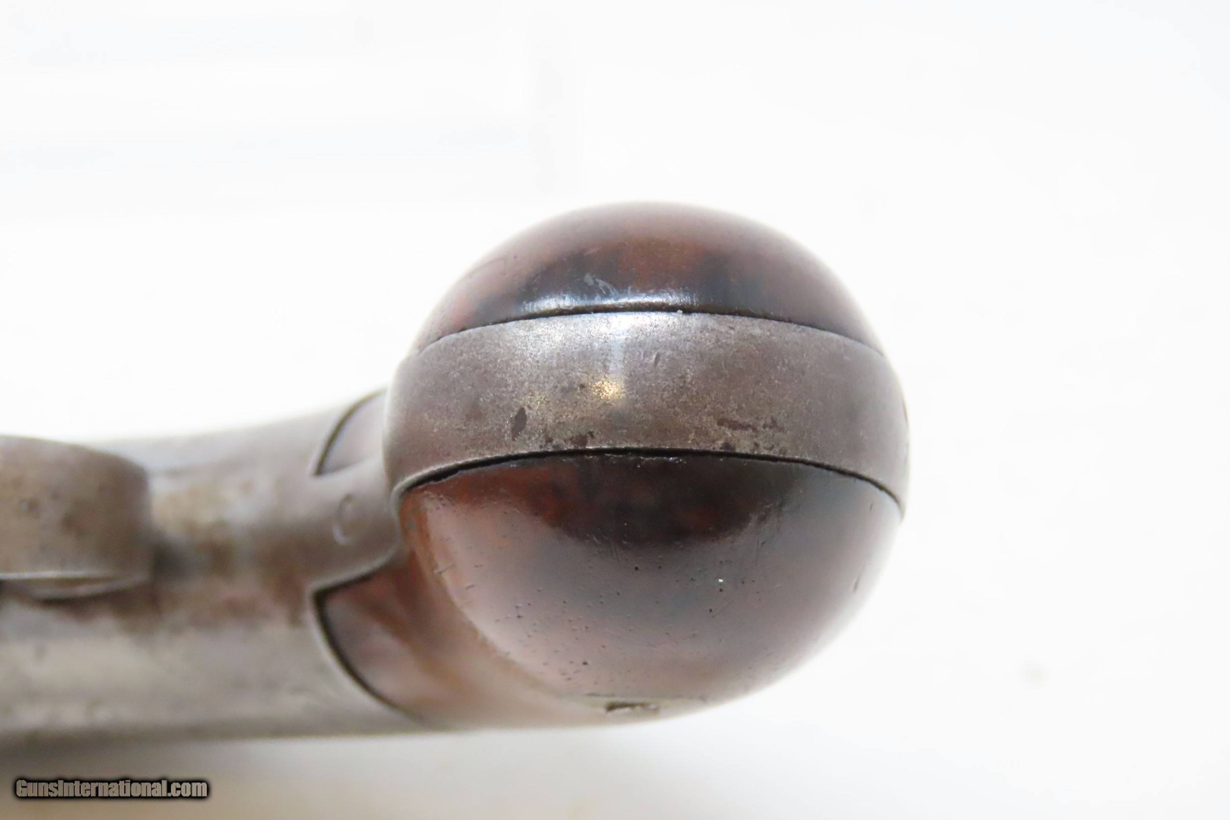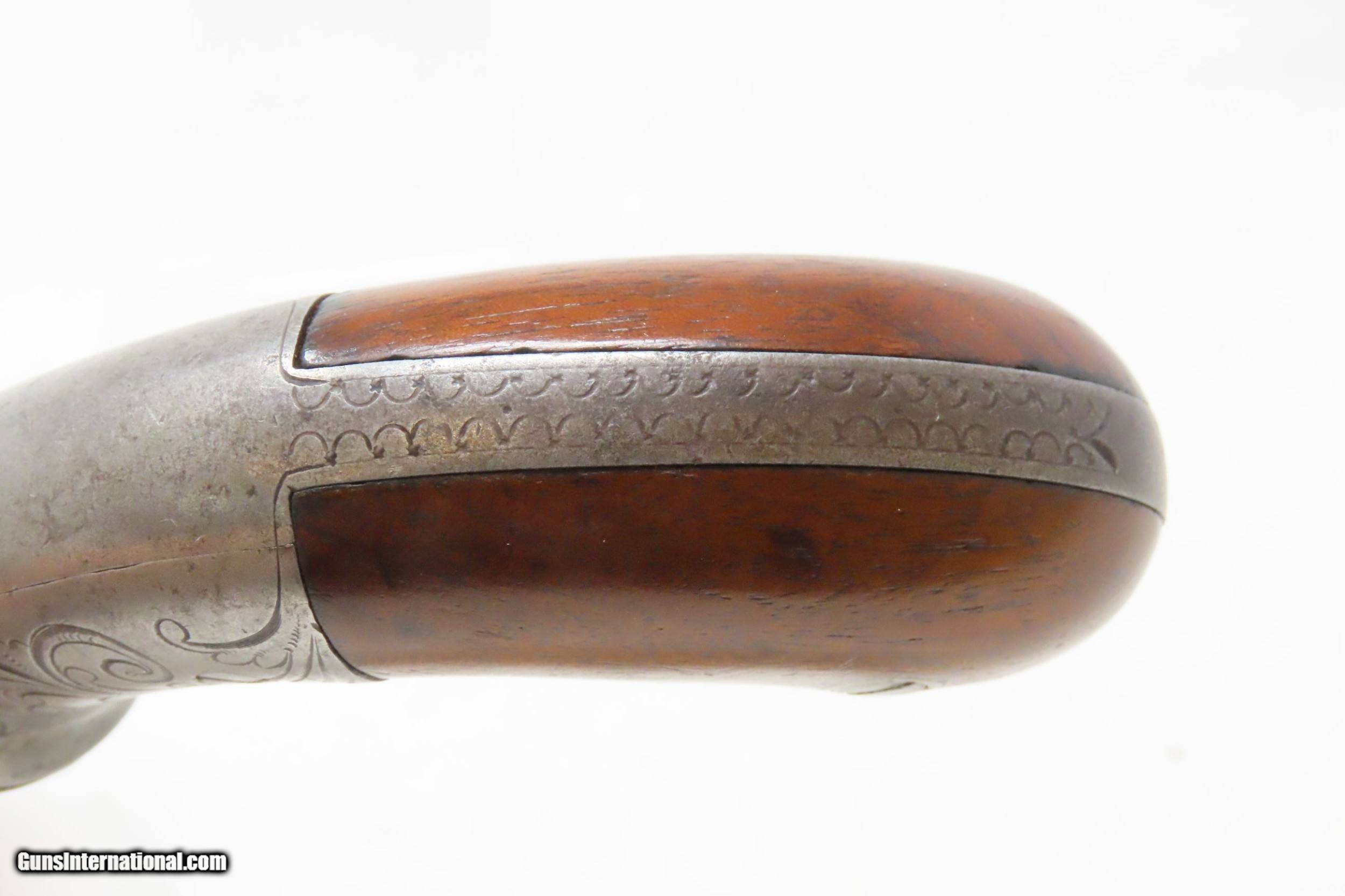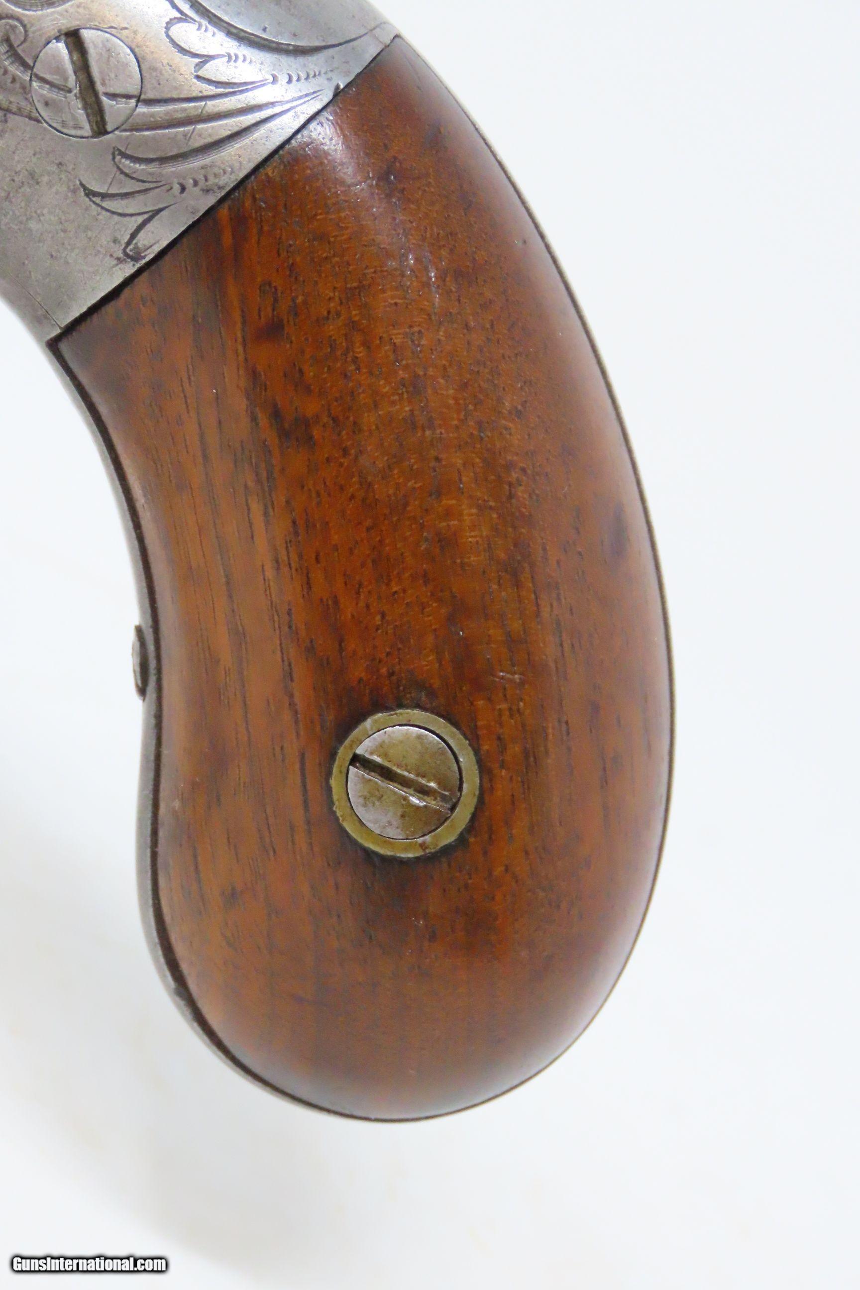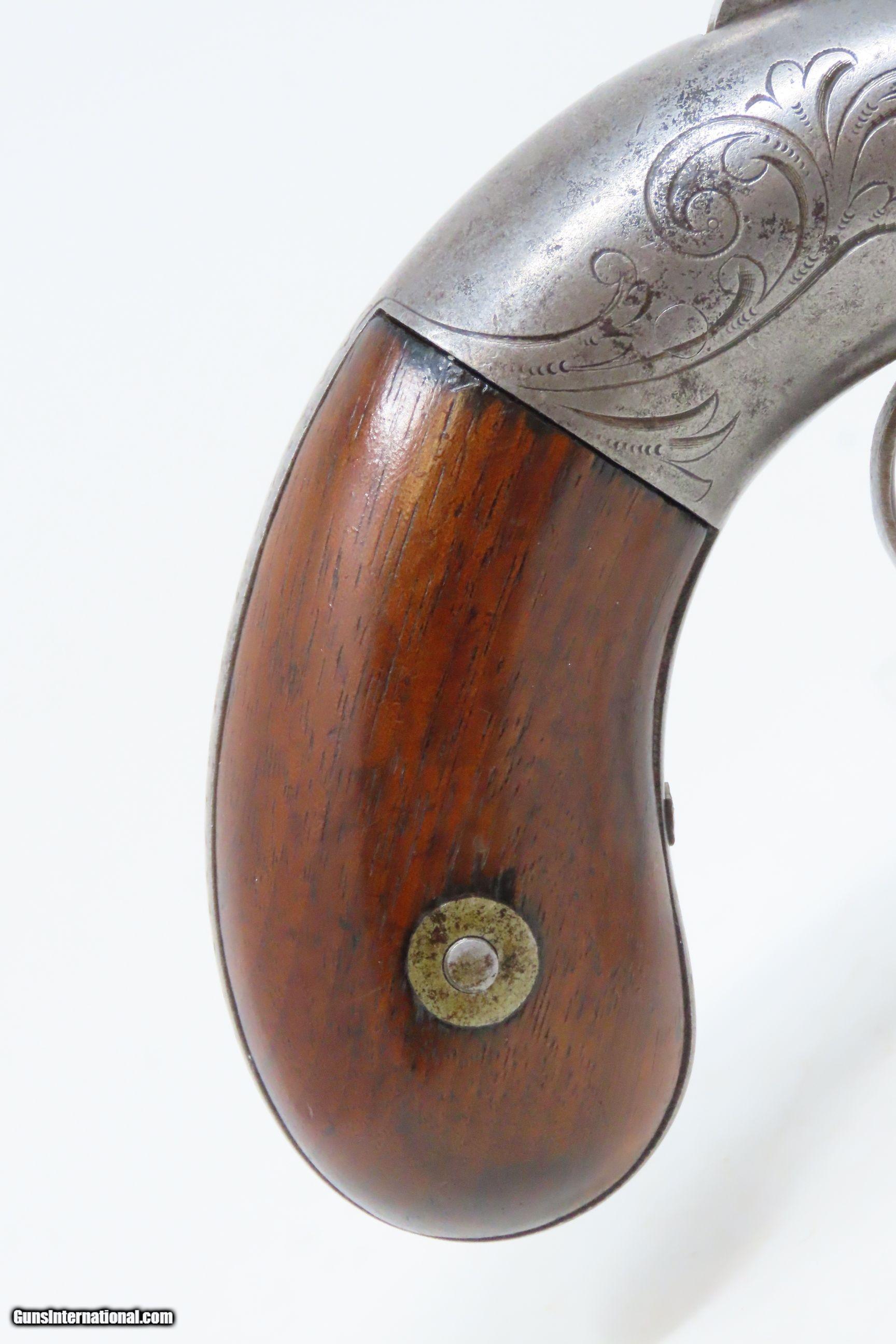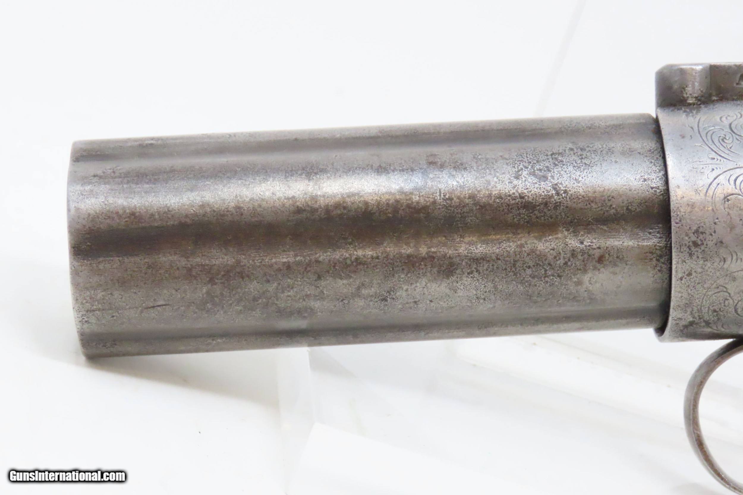 Description: ALLEN, THURBER & Co. Antique WORCHESTER .32 Bar Hammer PEPPERBOX Revolver First American Double Action Revolving Percussion Pistol Here we present an antique Allen Thurber & Co. Bar Hammer 6-shot Percussion Pepperbox pistol made circa 1854 to 1856 in Worcester, Massachusetts. Only six-barrel pepperbox pistols were produced during the Grafton and Norwich periods (1837–1847), and all had smooth barrel external contours until the later Worchester and Allen and Wheelock period, when fluted barrels became the norm. Though this is a six shot, it was during the Worchester period that the five-shot pepperbox was introduced. Percussion nipples were integrated to the barrels. Made with a bar hammer and standard trigger, models have been encountered with or without an integral nipple shield. While simplifying shooting (no manual cocking of the hammer), the bar hammer did preclude the inclusion of usable sights. However, this early example of a double-action pistol must have been quite a selling point. As these were considered “point and shoot” short range defensive weapons or “belly guns”, the market did not seem to object to the limitation of not having sights. Ethan Allen was already a prolific inventor and successful businessman in the 1830s when he came up with this design. This percussion, six-shot, double-action pocket revolver was a very popular pistol that was produced in Worcester, Massachusetts. It’s a 32-caliber pepperbox with a revolving screw off fluted barrel and has factory engravings in a floral motif executed on both sides of the frame. Made from 1854-1856, these pistols enjoyed even greater popularity than Sam Colt’s first pistol. The history that these pistols enjoyed over the years is astounding: the Seminole Wars, Gold Rush, Mexican War and American Civil War. These guns are true relics of American history. The overall condition is very good. Strong action. All bores remain clear and in good shape for their ages. Markings are legible. Both grips are in good shape with average handling. The inside of both grips are stamped “878”. Nicely engraved with traditional floral designs. Own the original! This is a legitimate antique and not a reproduction. Barrel is 3-3/8 inches. Caliber: .32 Percussion Overall condition as seen in photos. Very Fast. Very Safe. FREE SHIPPING WORLDWIDE. Delivered directly to your door by express mail! Guaranteed AUTHENTIC & Includes CERTIFICATE OF AUTHENTICITY. ancestryguns $1500 #220118 SOLD Antique: Yes |
