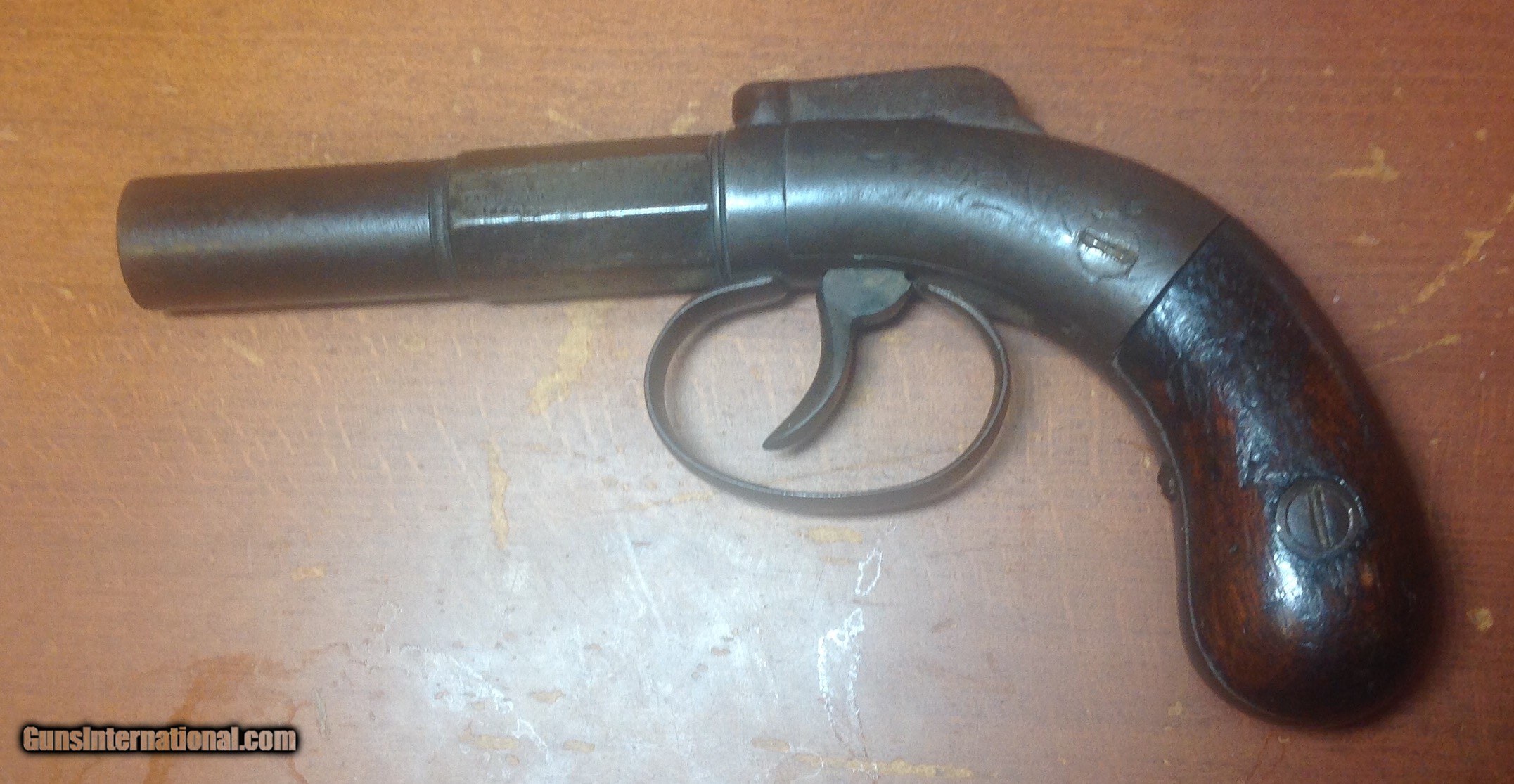 Description: This bar hammer pistol is in perfect working condition, the serial number 484 marked under barrel. Marked with patented date 1845 on left side of barrel and on top of the barrel hAllen & Thurber and lightly marked Worcester. The frame is Engraved handle about all original lacquer and no chips or cracks. It is double action with 3 inch barrel witch would have to be unscrewed to load. It is 36cal. With good rifeling. It is shown in Flayderman's page 53 5A-005 the value was $500.00 to $950.00 these were made up to1860 so no doubt a number of these were used in the Civil War. The bar hammer pistols are very desirable because after they mostly were side hammer cap lock. Any questions, offers or trades please give me a Tex or a call and we can talk. SOLD Antique: Yes |