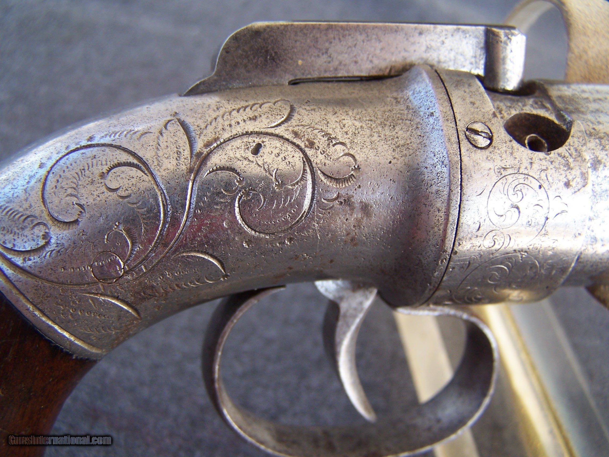Description: A good Allen & Thurber Medium sized 6 shot, fluted barrel, Worcester marked pepperbox with the 1845 patent date. Serial number 5 on all parts. These guns were batch numbered, so that doesn't mean a great deal, but does show it's an all matching gun. Main spring adj.screw has been replaced with an allen headed screw. Should be a straight head. Other than that, It's just a good example that works right. Nipples are fine, the timing is good, and the grips are good. Please contact me with any questions. Antique, can be shipped direct to you. Price includes shipping in CONUS. SOLD Antique: Yes |