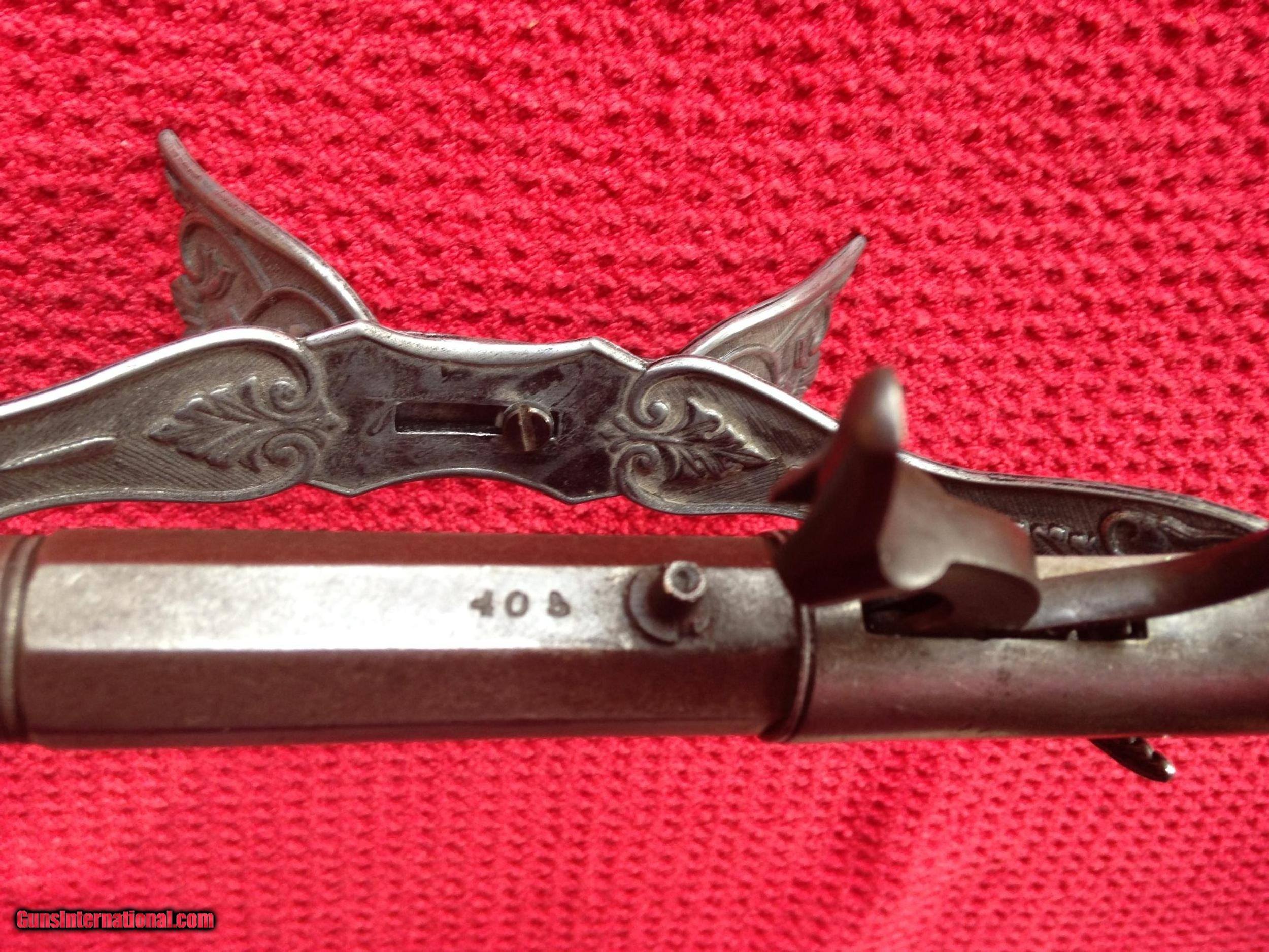 Description: **NEW PRICE** This underhammer single-shot pistol is seldom encountered and considerably more scarce than the earlier Grafton First Model. Grafton-made Second Models are known but are now almost totally uncirculated. Production was suspended throughout the Norwich period, then briefly resumed at Worcester. There are few survivors in any condition.. This example, # "405", is in very good overall condition and is typically unadorned without engraving or grip spangles. The 5 3/4" barrel is well-marked "Allen & Thurber" "Worcester" "Cast Steel", and has a brass front bead sight. All metal surfaces are smooth and unpitted with minimal nicks and scratches. The hammer and trigger show very good finish with traces elsewhere in protected areas. The frame, barrel, trigger and sideplate marked # "405". Grips are well-fitting with good varnish, several dents and bruises, and a hairline crack on the right side below the screw. Reference data and photos are more limited on this model than on most Allen models, but collectors of this important gunmaker will find this example 100% complete and original. + Shipping SOLD Antique: Yes |