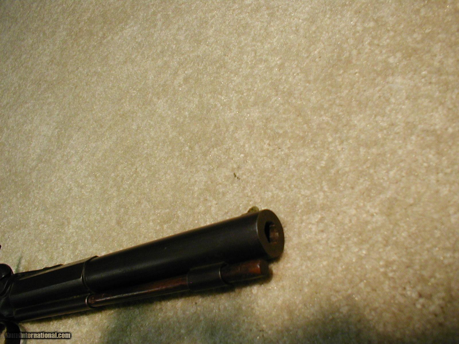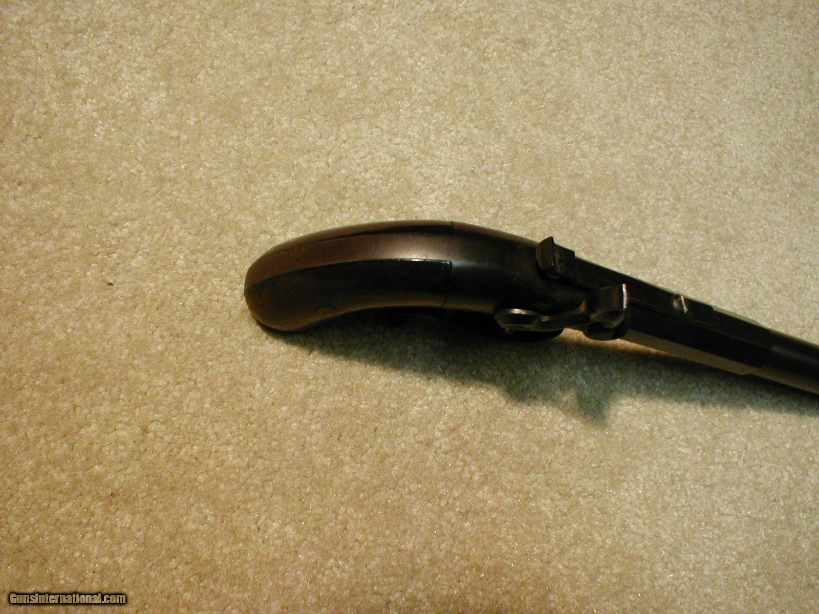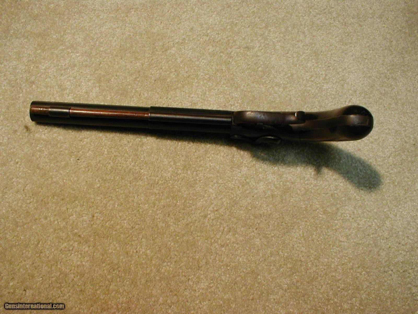 Description: SELDOM SEEN DISTINCTIVE ALLEN & THURBER SIDE HAMMER PERCUSSION TARGET PISTOL, ONLY A FEW HUNDRED ESTIMATED MADE LATE 1840s TO 1850s, 8" half octagon barrel about .36 caliber with correct thimbles and ram rod, correct trigger guard with finger spur, original small blade front sight in dovetail and original long target open rear sight with wheel adjustment for elevation- this sight which appears to be made from spring steel is bent slightly up, but is all there and could no doubt be bent back down, unmarked overall (typical of early Allen firearms), deep uncleaned brown patina, fine+ deeply rifled bore, exc. wood grips, fine action with light target trigger pull, a scarce and uniquely American target pistol from one of the earliest American makers of firearms (an interesting note: a replica of this pistol was used in the Tom Selleck movie, Quigley Down Under- in the end of the movie the sailor taking names as Matthew Quigley boarded the ship had one under a table) SOLD Antique: Yes Manufacturer: Allen & Thurber Model: Sidehammer perc. target pistol Caliber Info: .36 Condition: fine Barrels: 8 |