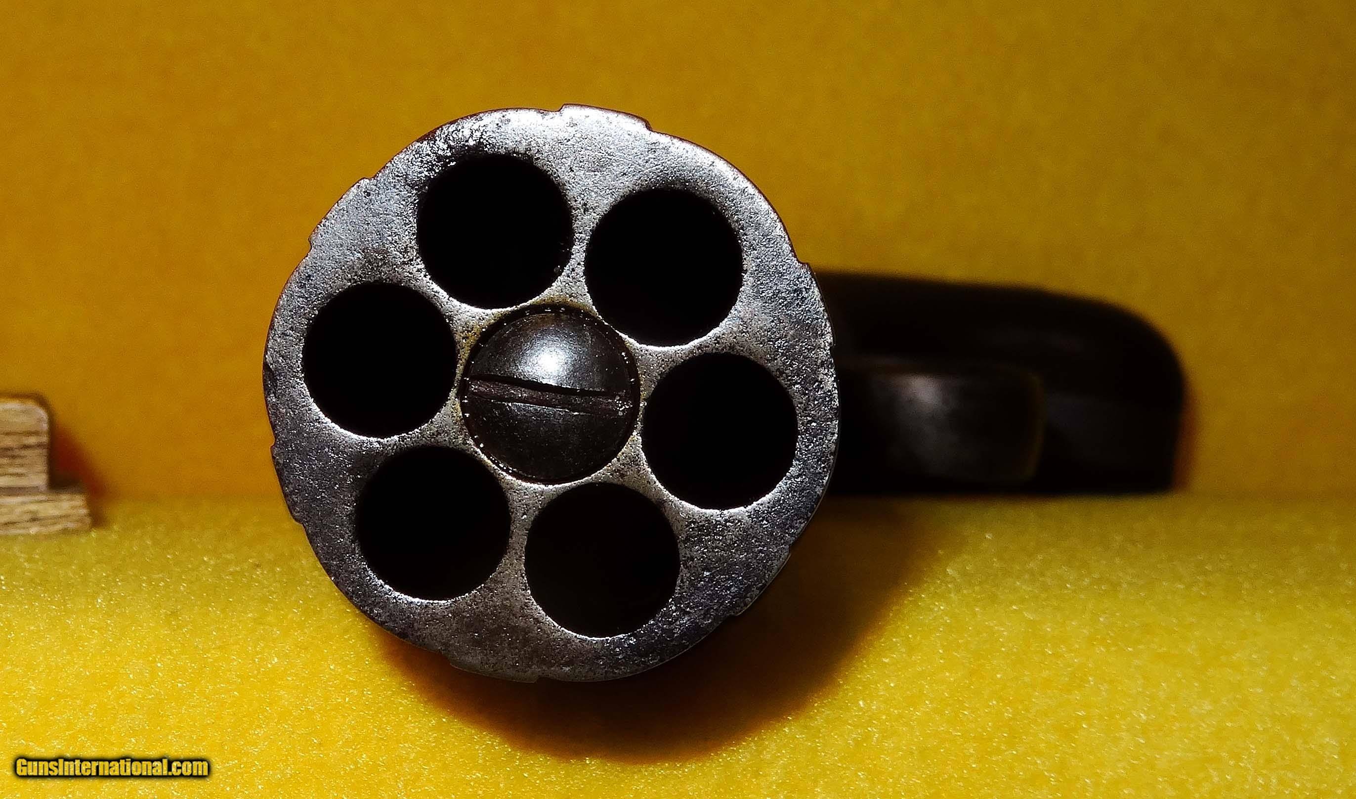 Description: ALLEN & THURBER WORCESTER MASS. SIX BARREL PEPPER BOX IN .32 CALIBER WITH 4 1/2" BARREL. COLOR BLUE. CONDITION 60% . SERIAL NUMBER NONE. ALLEN & THURBER MODEL PEPPER BOX, PRODUCED WITH OUT SIGHTS, WITH “ALLEN & THURBER WORCESTER” AND “PATENTED 1837 CAST STEEL” ON TWO OF THE SOLID BARREL RIBS, FINE FLORAL VINE PATTERN IS ENGRAVED OD THE NIPPLE SHIELD, WITH SCROLLWORK ON THE SIDES OF THE FRAME AND SCALLOPED BORDERS ON THE BACK STRAP. THE SIDE OF THE HAMMER IS MARKED “ALLEN’S PATENT”, WITH MATCHING NUMBERS ON THE BARREL, HAMMER, TRIGGER GUARD, THE FRAME UNDER THE GRIPS, HAMMER SPRING BOTH OF THE SMOOTH BAG SHAPED GRIPS, GRIPS ARE VERY GOOD TO EXCELLENT, 50% ORIGINAL FINISH INTERMINGLED WITH BROWN PATINA, MECHANICALLY EXCELLENT, ALL ORIGINAL, 60% OVERALL CONDITION, OUR STOCK # N3. SOLD |