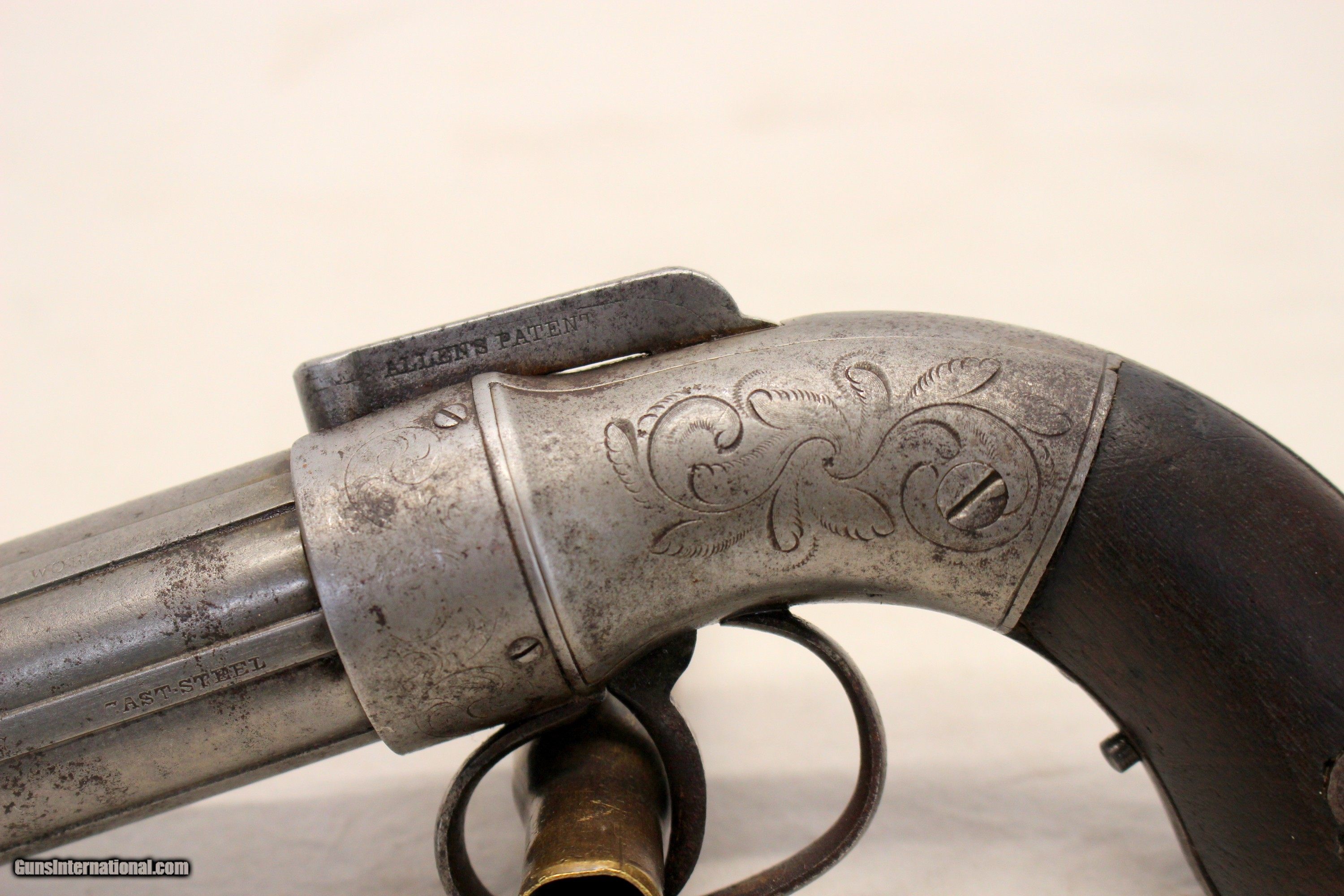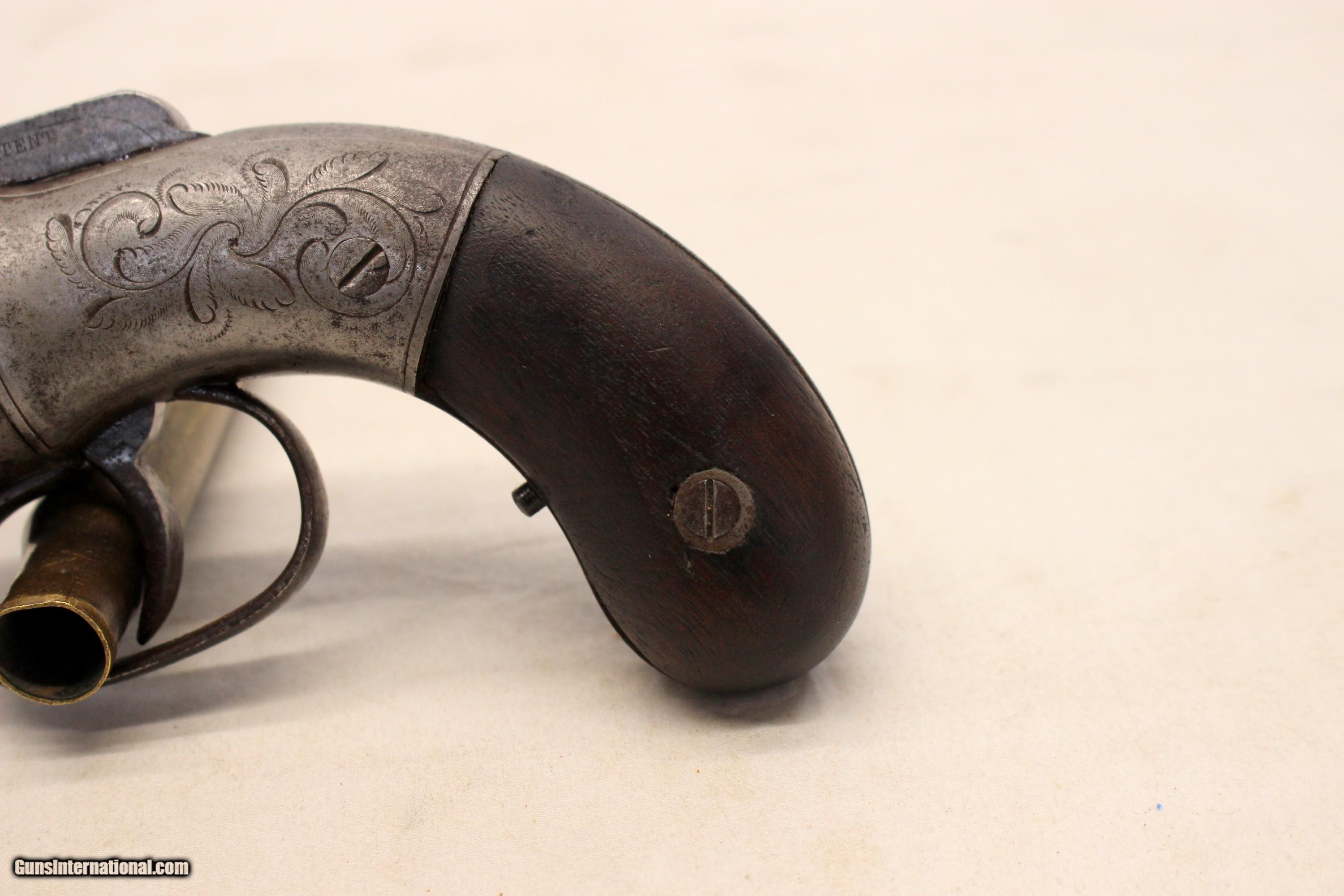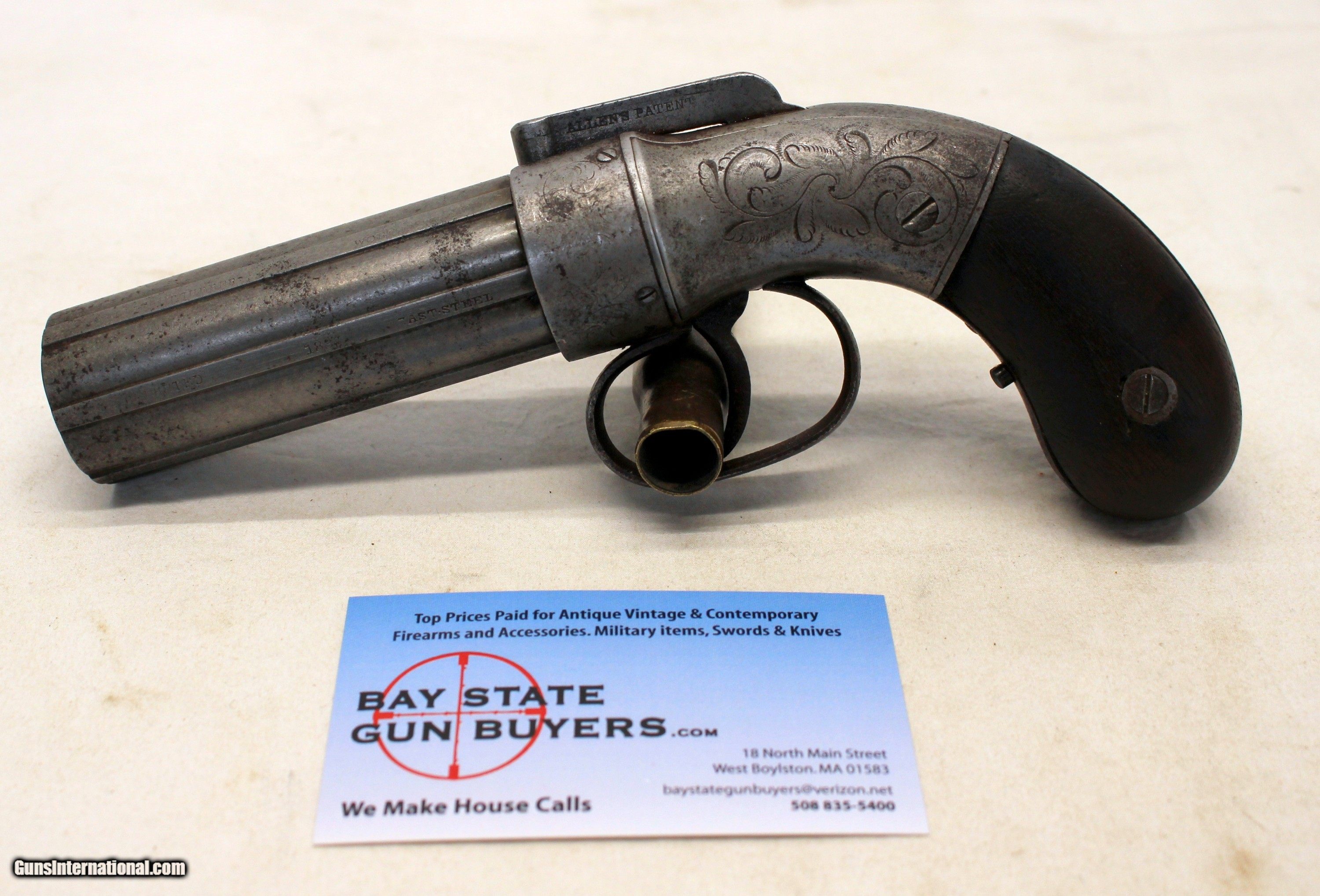 Description: We are offering for sale an antique Allen & Thurber PEPPERBOX six shot revolver chambered in .32 caliber. This is an early example with "1837" patent date. The gun remains in very good, fully functioning condition! 3 1/2" barrels remain very good with light scattered age, oxidation wear; No heavy wear or damage, This pistol has the Allens Patent bar hammer on the top which snaps with every pull of the trigger. The cylinder rotates correctly as well. The "receiver" shows original scroll etching. Original wood grip panels are very good without damage. CLEAN AND COLLECTIBLE ANTIQUE PISTOL Shipping is $24.95 via USPS Priority *** WE ONLY ACCEPT MASTERCARD AND VISA AS PAYMENT OPTIONS (we charge a non-negotiable 3% cc fee) *** Please know the legality of any weapon in your state before . If a gun can’t be transferred to you we will charge a 15% re-stocking fee. Also, we are a PART TIME business, Only in office Wednesday through Saturday 10am-4pm. If you make an offer on Sunday-friday we may not get back to you for 24+ hours, please send us an email with any questions, and we will do our best to get back in a timely manner. Thank You. We are not a shop open to the public, no private viewings. We stand behind our descriptions, and gladly take returns, however we know based on the descriptions given, you will not be disappointed. No Face To Face Transfers! Please note: Clicking "buy" does not guarantee that this gun is yours, However clicking “Buy” will reserve this gun for you, if it hasn’t been sold in store. We will try to do our best to remove the posts as efficiently as possible, but sometimes delays may ensue. “Buy” is your safest bet to reserve a gun. Also please add 6.25% MA state sales tax (if from MA) and 3% credit card shop courtesy fee. After Clicking “buy” we will need the following from you, via email before we ship. 1: A copy of your preferred FFL’s license via email () 2: Your preferred method of payment (If Credit card: 16 digit, MM/YY exp date, 3 digit code Plus billing address) 3: Your Shipping information/ Your preferred FFL’s Shipping information. You have 5 business days to arrange payments and ffl information to us. Any purchase not completed within this time frame will be cancelled, and the ad will be put back active online. Please before calling with concerns read these conditions and meet them accordingly. SOLD Antique: Yes |