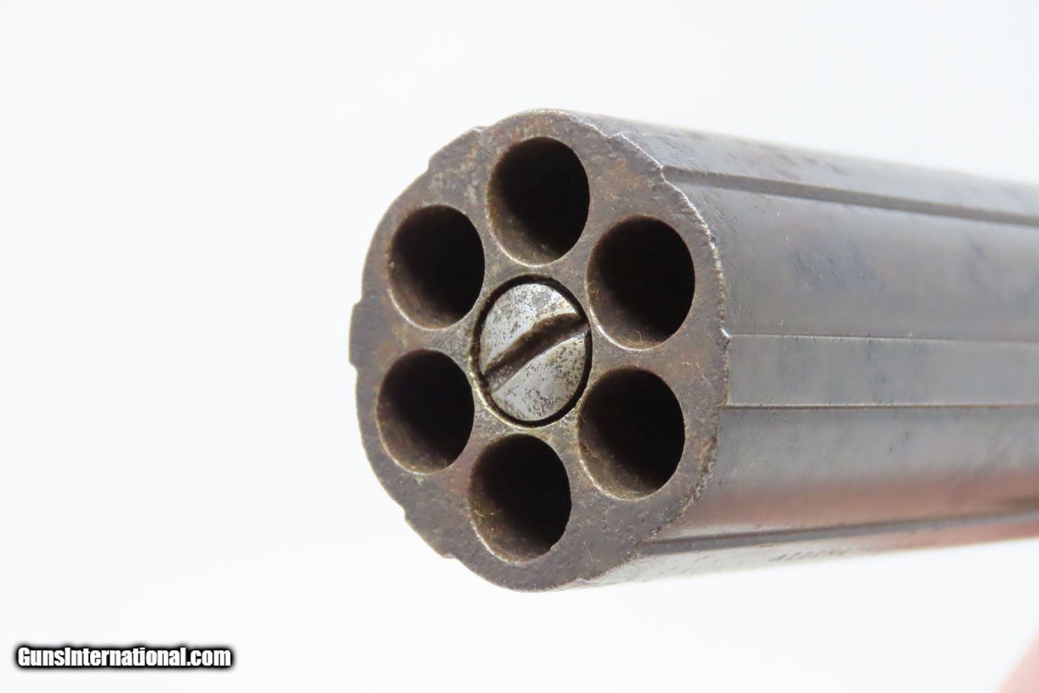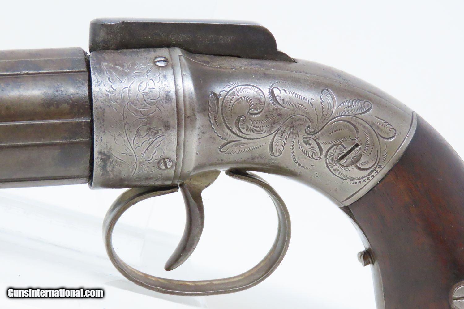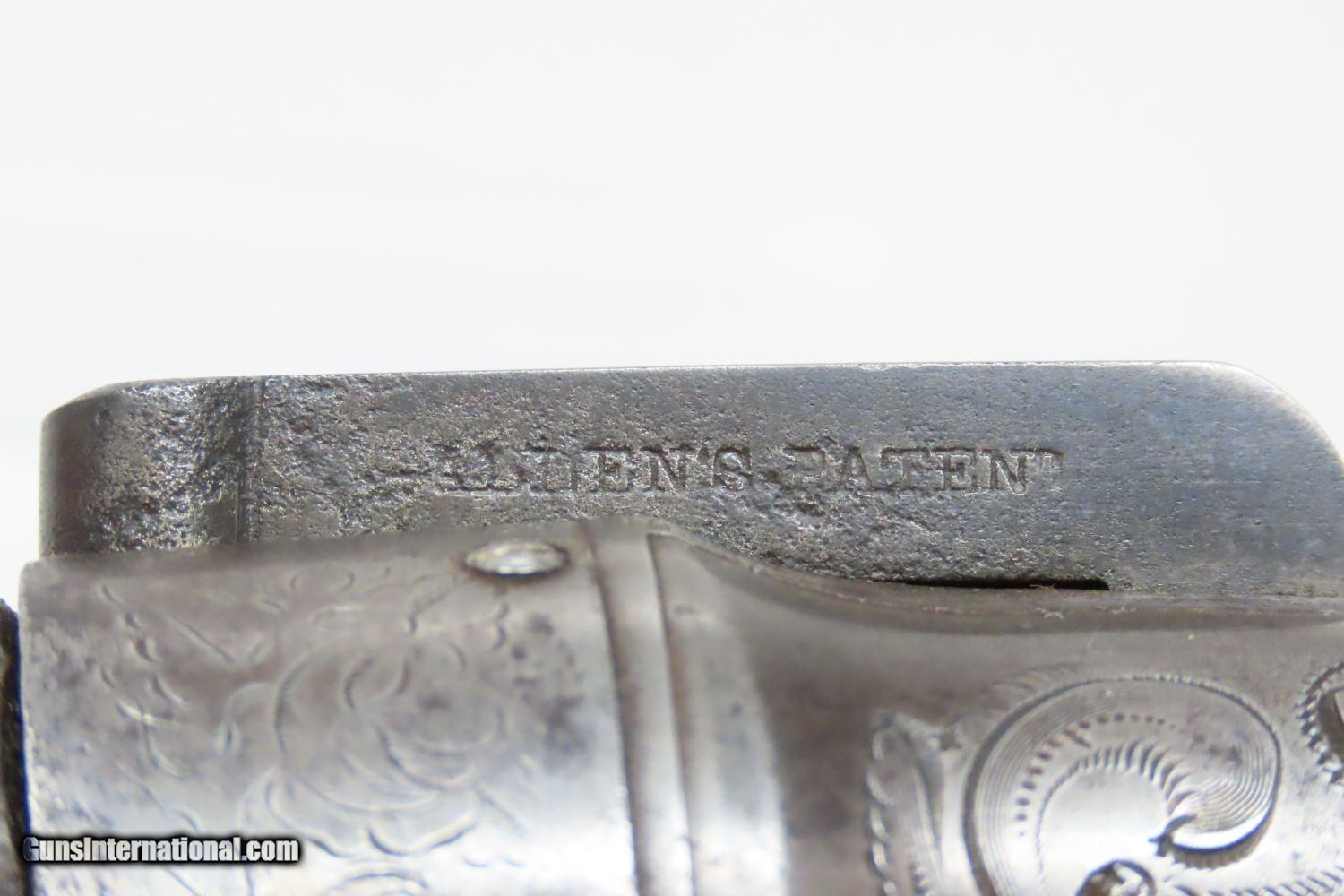 Description: ANTIQUE Allen & Thurber WORCHESTER PERIOD Bar Hammer PEPPERBOX Revolver ENGRAVED First American Double Action Revolving Pistol Here we present an antique Allen & Thurber Bar Hammer 6-shot Pepperbox pistol. Only six-barrel pepperbox pistols were produced during the Grafton and Norwich periods (1837–1847), and all had smooth barrel external contours until the later Worchester and Allen and Wheelock period, when fluted barrels became the norm. Though this is a six shot, it was during the Worchester period that the five-shot pepperbox was introduced. Percussion nipples were integrated to the barrels. Made with a bar hammer and standard trigger, models have been encountered with or without an integral nipple shield. While simplifying shooting (no manual cocking of the hammer), the bar hammer did preclude the inclusion of usable sights. However, this early example of a double-action pistol must have been quite a selling point. As these were considered “point and shoot” short range defensive weapons or “belly guns”, the market did not seem to object to the limitation of not having sights. Ethan Allen was already a prolific inventor and successful businessman in the 1830s when he came up with this design. This percussion, six-shot, double-action pocket revolver was a very popular pistol that was produced in Worcester, Massachusetts. It’s a 32-caliber pepperbox with a revolving screw off fluted barrel and has factory engravings in a floral motif executed on both sides of the frame. Made from 1847-1854, these pistols enjoyed even greater popularity than Sam Colt’s first pistol. The history that these pistols enjoyed over the years is astounding: the Seminole Wars, Gold Rush, Mexican War and American Civil War. These guns are true relics of American history. The overall condition is very good+. This example has a strong action all the way around. The bores are in good shape. Both grips are good, although each are missing chips to the rear of the trigger guard. The frame has preserved sharp engravings! Own the original! This is a legitimate antique and not a reproduction. Barrel is 4-1/4 inches. Caliber: .32 Percussion Overall condition as seen in photos. Very Fast. Very Safe. FREE SHIPPING WORLDWIDE. Delivered directly to your door by express mail! Guaranteed AUTHENTIC & Includes CERTIFICATE OF AUTHENTICITY. ancestryguns $1695 #201245 SOLD Antique: Yes |