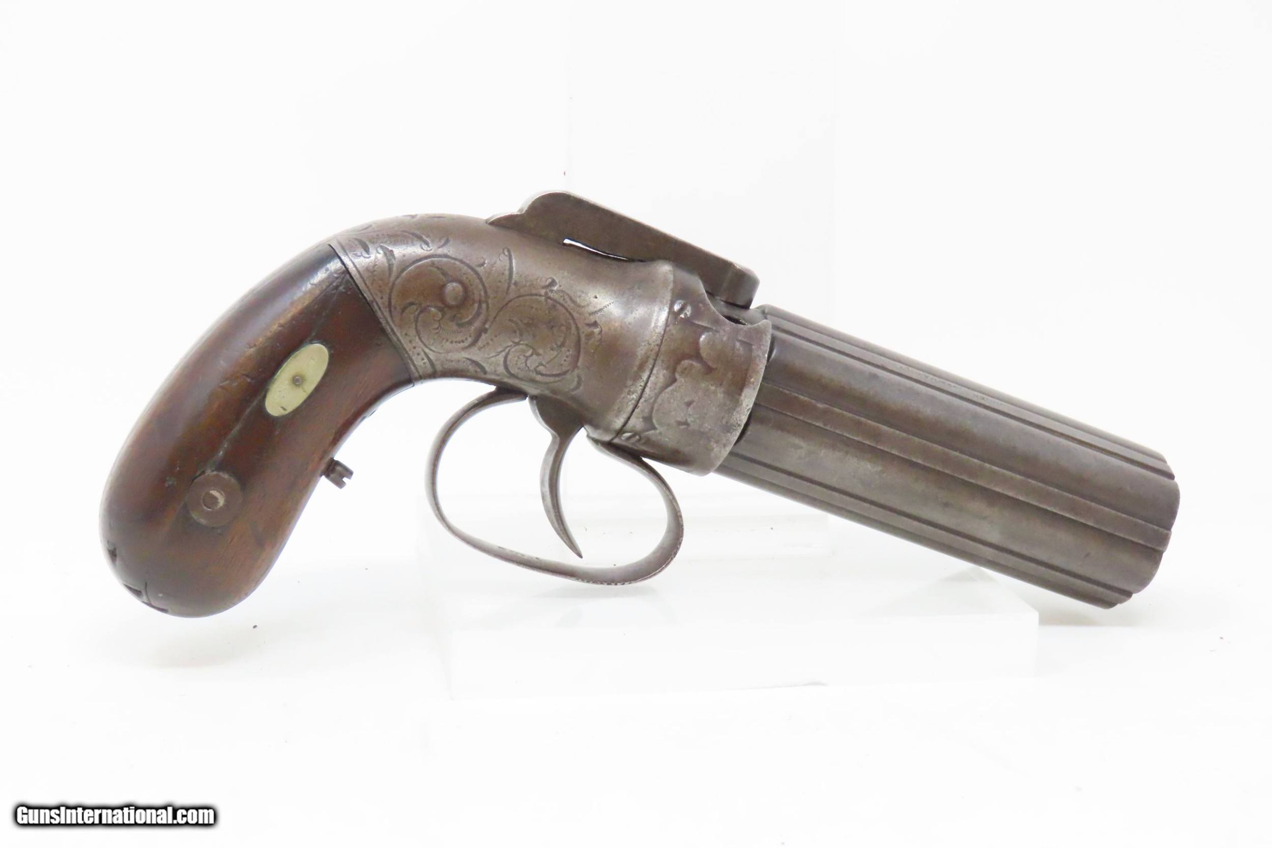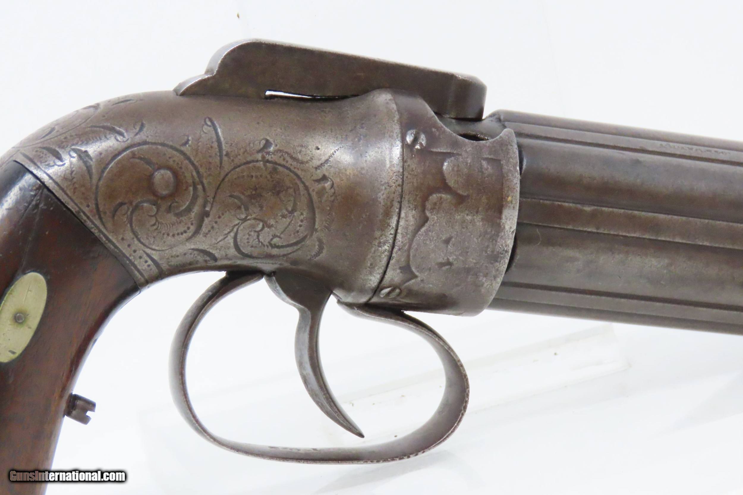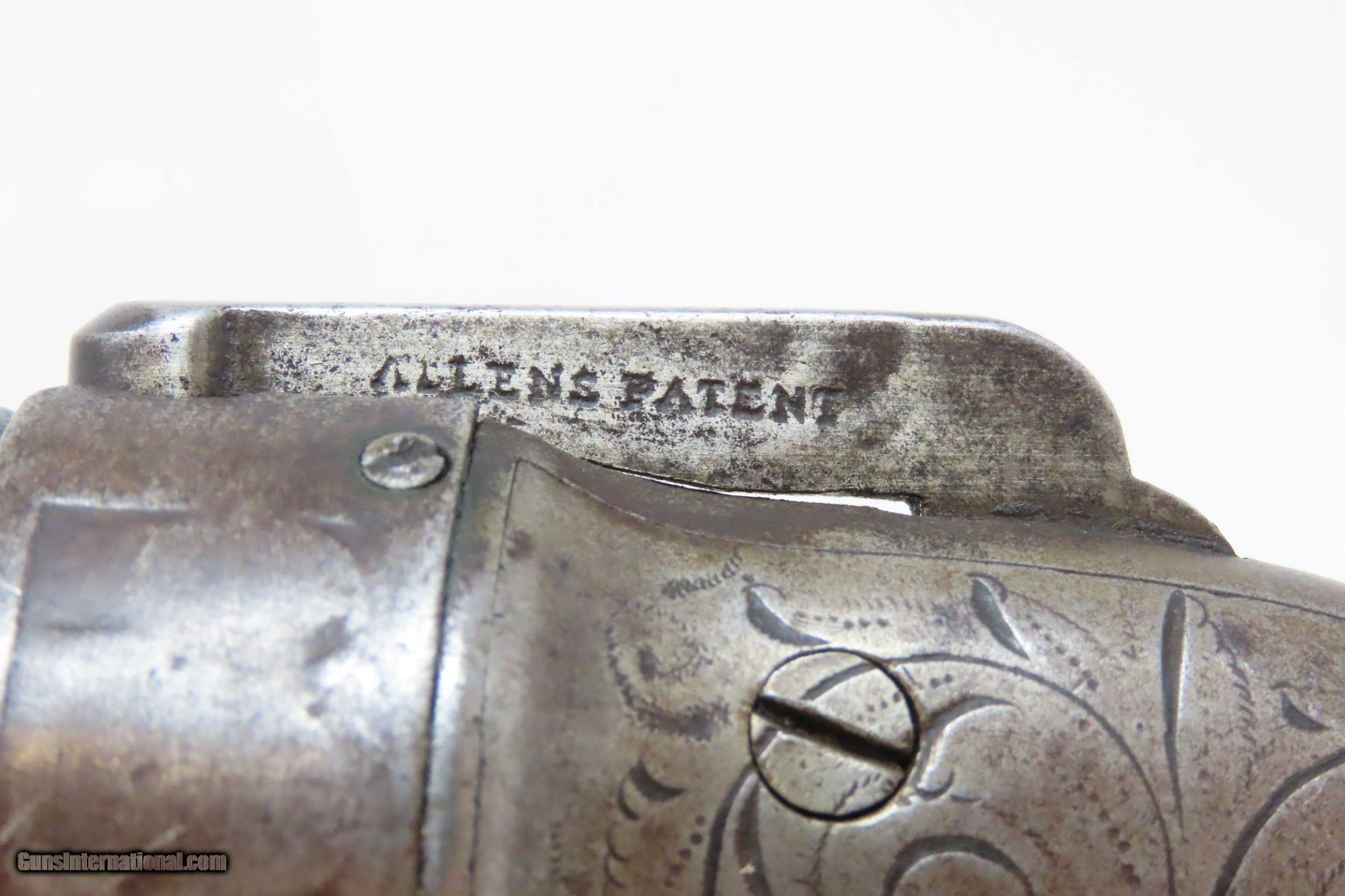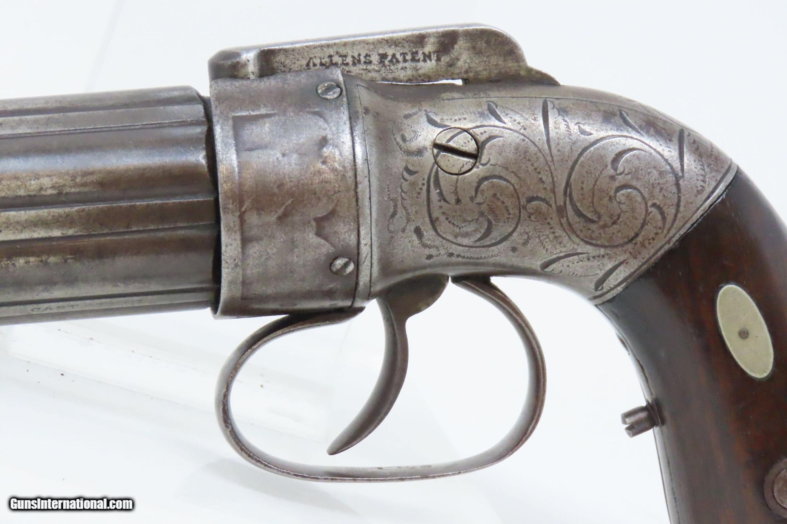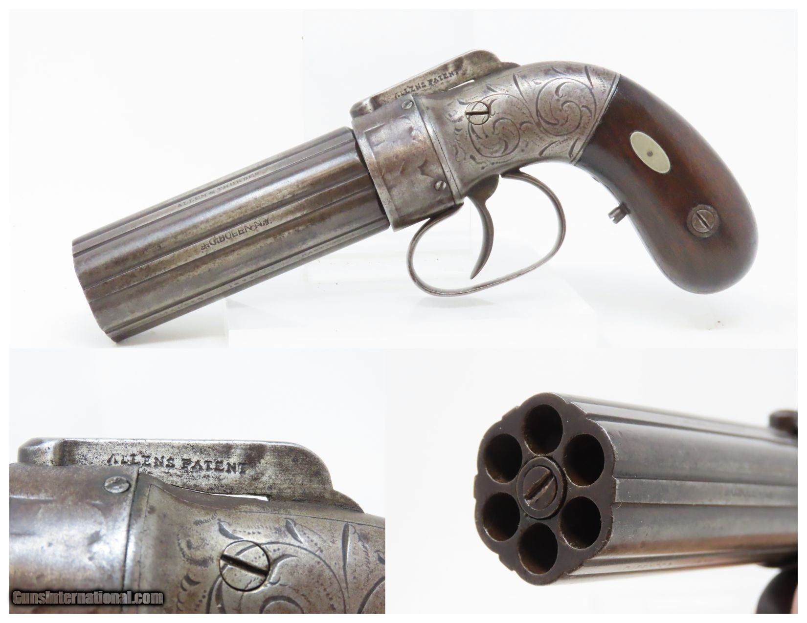 Description: c1840s mfr. BROADWAY NYC ALLEN & THURBER .32 Cal PEPPERBOX Revolver Antique J.G. Bolen NEW YORK RETAILER Marked Here we present an antique Allen & Thurber Bar Hammer 6-shot Percussion Pepperbox pistol made circa the 1840s in Massachusetts and sold by J.G. Bolen in his shop at 104 Broadway in New York City. John George Bolen (1809-1888) was the son of a hardware entrepreneur who also had a shop on Broadway. John was an engraver, inventor, and gun shop owner. His shop was located across the street from Trinity Church and he lived on State Street in Brooklyn. His advertisements for this particular type of gun by Ethan Allen are excellent: “LIFE AND PROPERTY PRESERVERS, FOR HOUSEKEEPERS, TRAVELLERS, CAPTAINS, AND OTHERS, PATENT SELF-COCKING & SELF-REVOLVING POCKET PISTOLS!! The Greatest Modern Improvement in Fire-Arms!!! This Pistol can be discharged at times with almost the rapidity of thought. The Pistol cocks; the barrel revolves and discharges, merely by pulling the trigger; not requiring to be cocked as the common Pistol, they can be fired the moment they are taken from the pocket with one hand only. They are no larger than an ordinary Pocket Pistol, and, weighting but 13 ounces, can be carried in the pocket without the least inconvenience. The locks and the whole Pistol are not so liable to get out of order as the common Pistol. Gentlemen are invited to call at the store of the Advertiser and examine the same, as their simplicity, perfect safety, and non-liability to get out of order, will certainly recommend them over all others. For Travellers, Housekeepers, Captains, and Planters, they are an Indispensable article, as persons, both male and female, can with this Pistol protect their lives and properties attached by several persons.” Ethan Allen was already a prolific inventor and successful businessman in the 1830s when he came up with this design. This percussion, six-shot, double-action pocket revolver was a very popular pistol that was produced in Worcester, Massachusetts. It’s a 31-caliber pepperbox with a revolving screw off fluted barrel and has factory engravings in a floral motif executed on both sides of the frame. Made from 1847-1854, these pistols enjoyed even greater popularity than Sam Colt’s first pistol. The history that these pistols enjoyed over the years is astounding: the Seminole Wars, Gold Rush, Mexican War and American Civil War. Brigham Young himself carried one very similar to this example. These guns are true relics of American history. This early example of a double-action pistol must have been quite a selling point. As these were considered “point and shoot” short range defensive weapons or “belly guns”, the market did not seem to object to the limitation of not having sights. The overall condition is very good. The action is excellent. The bores are smooth and dim. The grips show use. The right grip shows a stable vertical crack. Gray patina throughout. A rare example of the Ethan Allen revolver with this retailer’s marking! Own the original! This is a legitimate antique and not a reproduction. Barrel is 3-3/8 inches. Caliber: .32 Percussion Overall condition as seen in photos. Very Fast. Very Safe. FREE SHIPPING WORLDWIDE. Delivered directly to your door by express mail! Guaranteed AUTHENTIC & Includes CERTIFICATE OF AUTHENTICITY. ancestryguns $2395 #220262 SOLD Antique: Yes |