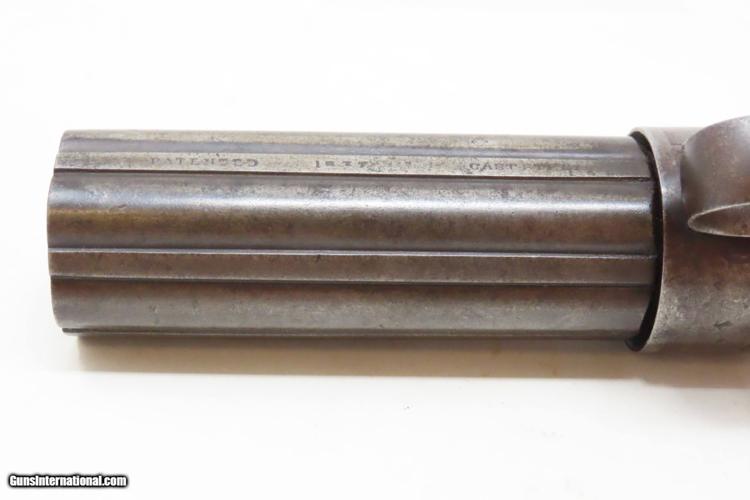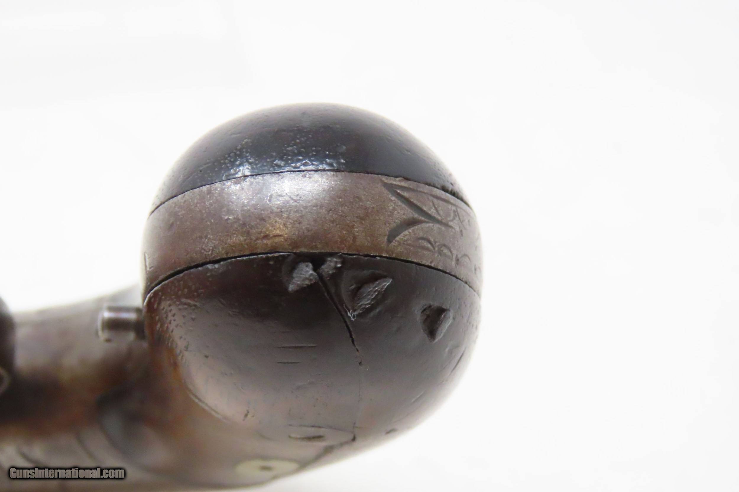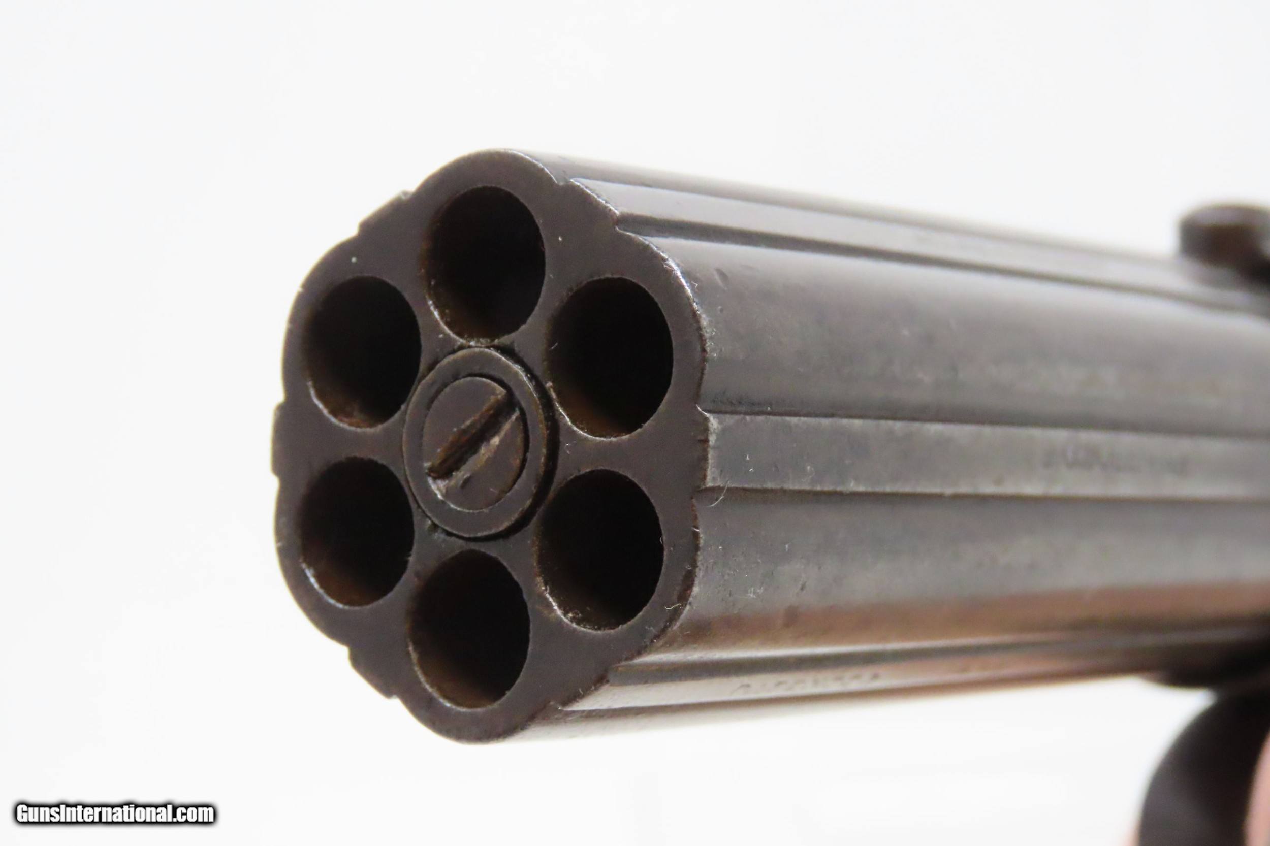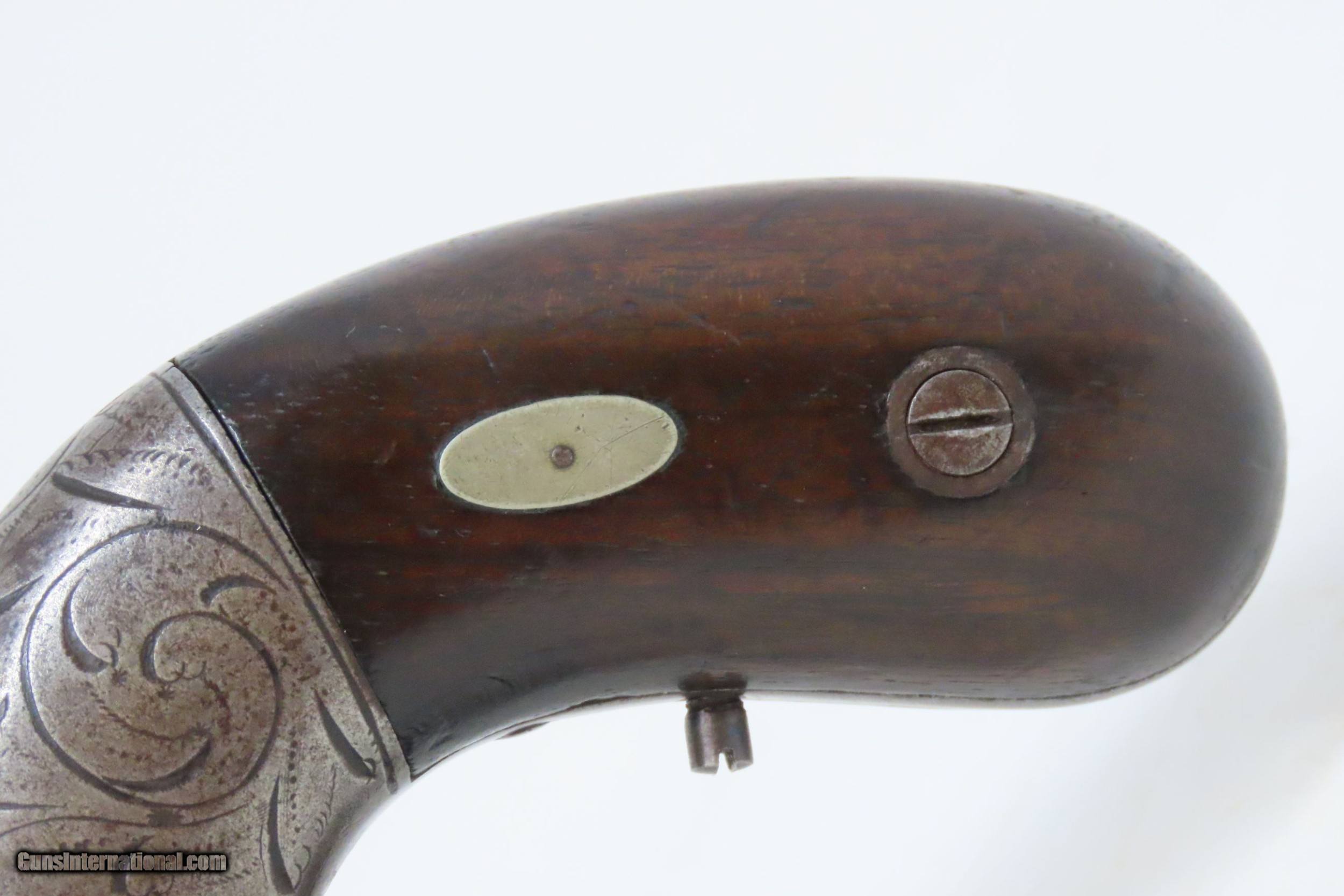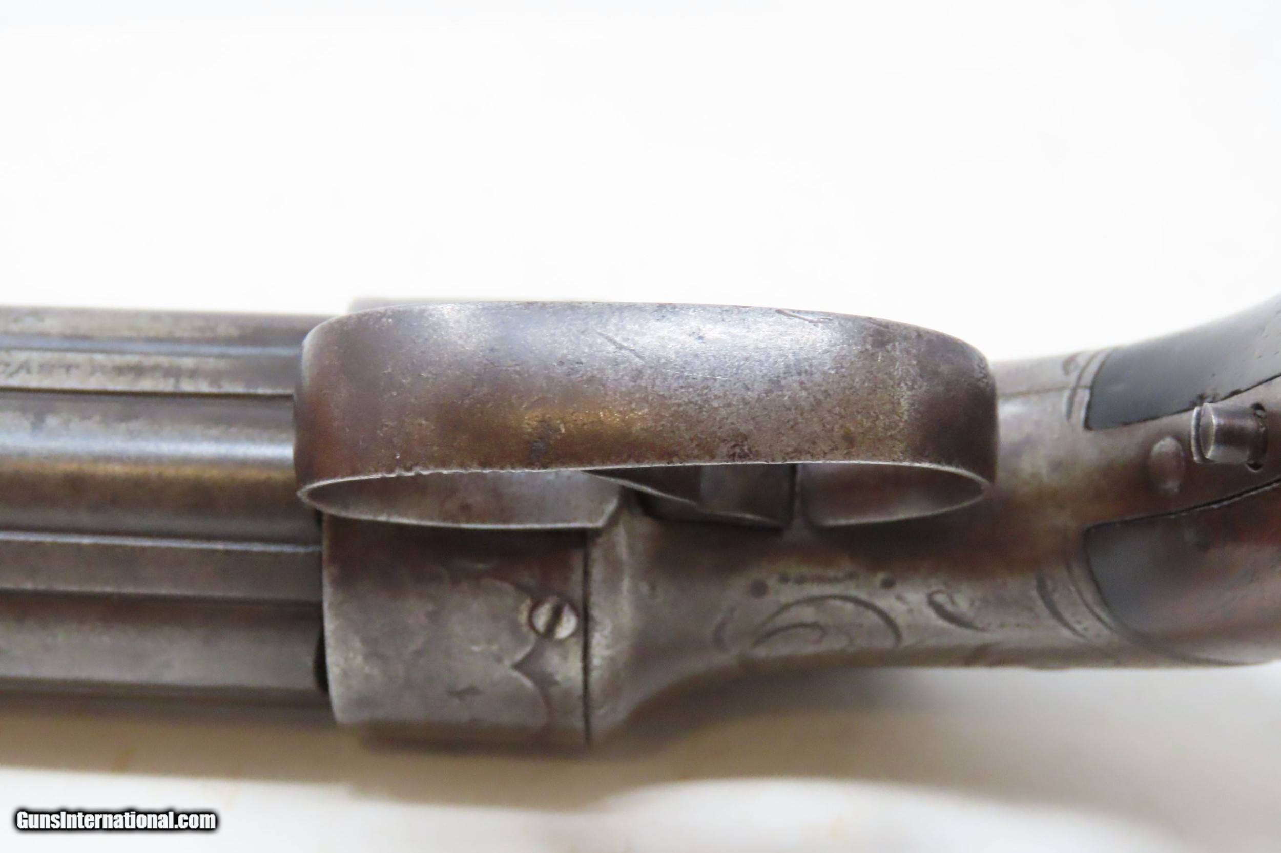 Description: c1840s mfr. BROADWAY NYC ALLEN & THURBER .32 Cal PEPPERBOX Revolver Antique J.G. Bolen NEW YORK RETAILER Marked Here we present an antique Allen & Thurber Bar Hammer 6-shot Percussion Pepperbox pistol made circa the 1840s in Massachusetts and sold by J.G. Bolen in his shop at 104 Broadway in New York City. John George Bolen (1809-1888) was the son of a hardware entrepreneur who also had a shop on Broadway. John was an engraver, inventor, and gun shop owner. His shop was located across the street from Trinity Church and he lived on State Street in Brooklyn. His advertisements for this particular type of gun by Ethan Allen are excellent: “LIFE AND PROPERTY PRESERVERS, FOR HOUSEKEEPERS, TRAVELLERS, CAPTAINS, AND OTHERS, PATENT SELF-COCKING & SELF-REVOLVING POCKET PISTOLS!! The Greatest Modern Improvement in Fire-Arms!!! This Pistol can be discharged at times with almost the rapidity of thought. The Pistol cocks; the barrel revolves and discharges, merely by pulling the trigger; not requiring to be cocked as the common Pistol, they can be fired the moment they are taken from the pocket with one hand only. They are no larger than an ordinary Pocket Pistol, and, weighting but 13 ounces, can be carried in the pocket without the least inconvenience. The locks and the whole Pistol are not so liable to get out of order as the common Pistol. Gentlemen are invited to call at the store of the Advertiser and examine the same, as their simplicity, perfect safety, and non-liability to get out of order, will certainly recommend them over all others. For Travellers, Housekeepers, Captains, and Planters, they are an Indispensable article, as persons, both male and female, can with this Pistol protect their lives and properties attached by several persons.” Ethan Allen was already a prolific inventor and successful businessman in the 1830s when he came up with this design. This percussion, six-shot, double-action pocket revolver was a very popular pistol that was produced in Worcester, Massachusetts. It’s a 31-caliber pepperbox with a revolving screw off fluted barrel and has factory engravings in a floral motif executed on both sides of the frame. Made from 1847-1854, these pistols enjoyed even greater popularity than Sam Colt’s first pistol. The history that these pistols enjoyed over the years is astounding: the Seminole Wars, Gold Rush, Mexican War and American Civil War. Brigham Young himself carried one very similar to this example. These guns are true relics of American history. This early example of a double-action pistol must have been quite a selling point. As these were considered “point and shoot” short range defensive weapons or “belly guns”, the market did not seem to object to the limitation of not having sights. The overall condition is very good. The action is excellent. The bores are smooth and dim. The grips show use. The right grip shows a stable vertical crack. Gray patina throughout. A rare example of the Ethan Allen revolver with this retailer’s marking! Own the original! This is a legitimate antique and not a reproduction. Barrel is 3-3/8 inches. Caliber: .32 Percussion Overall condition as seen in photos. Very Fast. Very Safe. FREE SHIPPING WORLDWIDE. Delivered directly to your door by express mail! Guaranteed AUTHENTIC & Includes CERTIFICATE OF AUTHENTICITY. ancestryguns $2395 #220262 SOLD Antique: Yes |