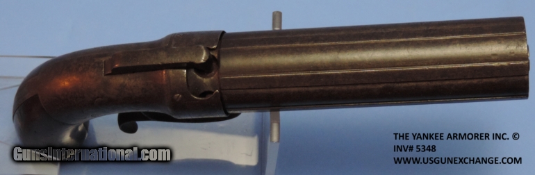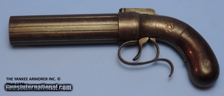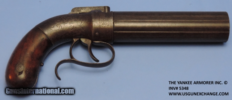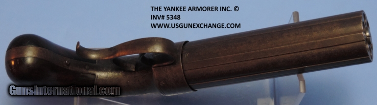 Description: Inv. 5348 Ethan Allen Dragoon Pepperbox, Caliber .31 Six Shot. This is the scarce early one with the ribbed barrel and spur on the trigger guard. It is the King Kong of American pepperboxes. The gun has toned to smooth even patina with some very small areas of pinpricks. Really quite good for a gun that is over a160 years old. There is no real pitting anywhere. All the engraving is easily visible. The walnut grips still retain about 90% of the original lacquer. There is one small chip below the right screw escutcheon. However no splits or cracks. The double action only feature works perfectly and locks up nicely. All the nipples are perfect showing little use. Certainly a difficult gun to find in any condition, much less fully functional and with the finger grip still intact.....$1195. To purchase this firearm or if you want to request more information contact us at: Email ckgunsymail Phone 201-512-0002 Cell 201-575-6838 FAX 201-215-4759 We accept most major credit cards. Prices shown are Discounted 3% for Cash or Check. The buyer must be familiar with all the laws governing the purchase and the ownership of firearms in their own city and state. The Yankee Armorer, Inc is not responsible for any failure to comply with or observe these laws. The Yankee Armorer, Inc will only ship after full payment and receipt of all required documents. Shipping: Add $35.00 for handguns, $45.00 for long guns. New Jersey buyers are subject to a 7% sales tax. The Yankee Armorer, Inc offers a 3 day inspection period with full refund upon return of intact firearm and in the original condition. The Yankee Armorer, Inc offers a no interest lay away program - 25% down; 25% in 30 days; 25% in 60 days; and full payment in 90 days. Any violation of this policy is subject to restocking and forfeiture of all payments. Any variation from this policy must be agreed to in advance. Unshipped Cancelled sales are subject to a 20% restocking fee. Be advised that all firearms sold by The Yankee Armorer, Inc. or the Gun Exchange, LLC (SELLER) are sold as collector’s items. They have not been fired or tested for safety and must be examined by a license gunsmith prior to use. By purchasing any item from the (SELLER), you are agreeing to hold the (SELLER) free from any damages or lawsuits of any nature. Any item left for transfer or storage will be charged to $25.00 per month, per item from the day of its receipt. Any variation from this policy must be agreed to in advance. Store hours 10:00 am to 5:00 pm Tuesday -Saturday. It's always best to call for appointment. Store 201-512-0002, cell 201-575-6838. SOLD Antique: Yes |