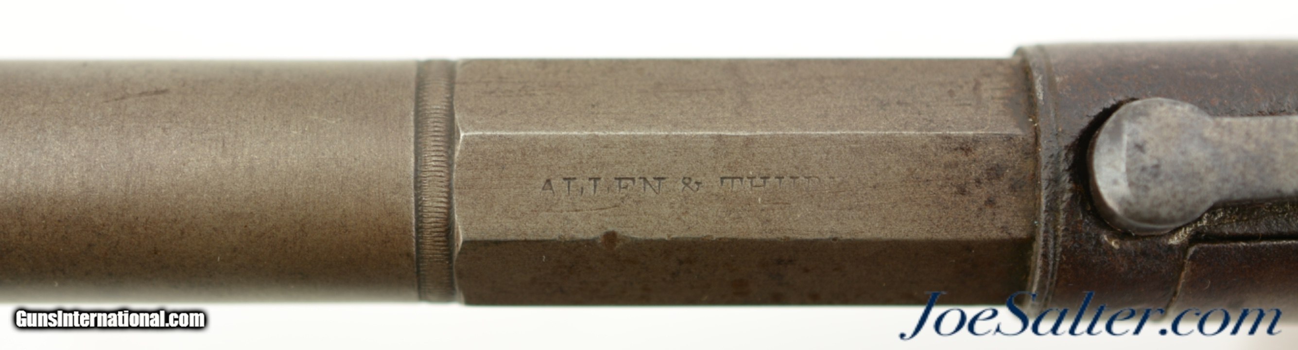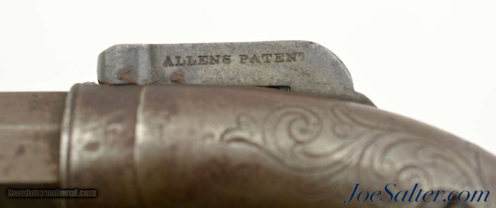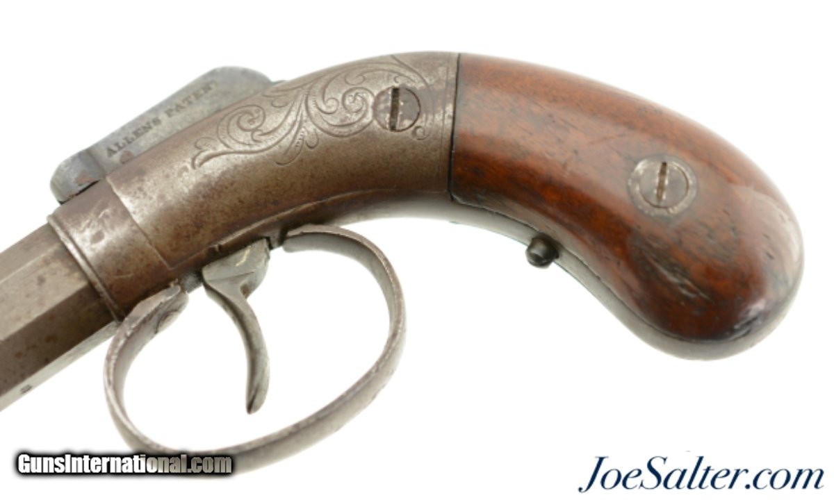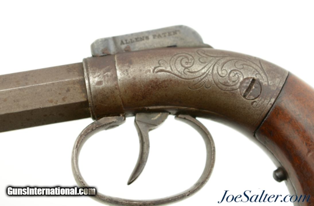 Description: Serial / Batch #163, .36 Caliber Black Powder Percussion, 4.25 inch part round, part octagon barrel with a fine bore with very good rifling and slight scattered roughness. This is an Allen & Thurber marked Bar Hammer No. 9 self cocking percussion pistol marked on the hammer "ALLENS PATENT" and is circa late 1840's. It could be loaded either by the muzzle or unscrewing the barrel and loading from the breech with the aid of a combination wrench / bullet mold. In fine antique condition the metal surfaces have a pleasing aged gray / brown patina with some scattered use marks. The original bag shaped grips rate about excellent, are correctly numbered to the gun and are free of any cracks showing some old minor contusions and retains much of the original finish. The double action mechanism functions properly. A fine example of an Allen & Thurber Bar Hammer. Antique. SOLD Antique: Yes |