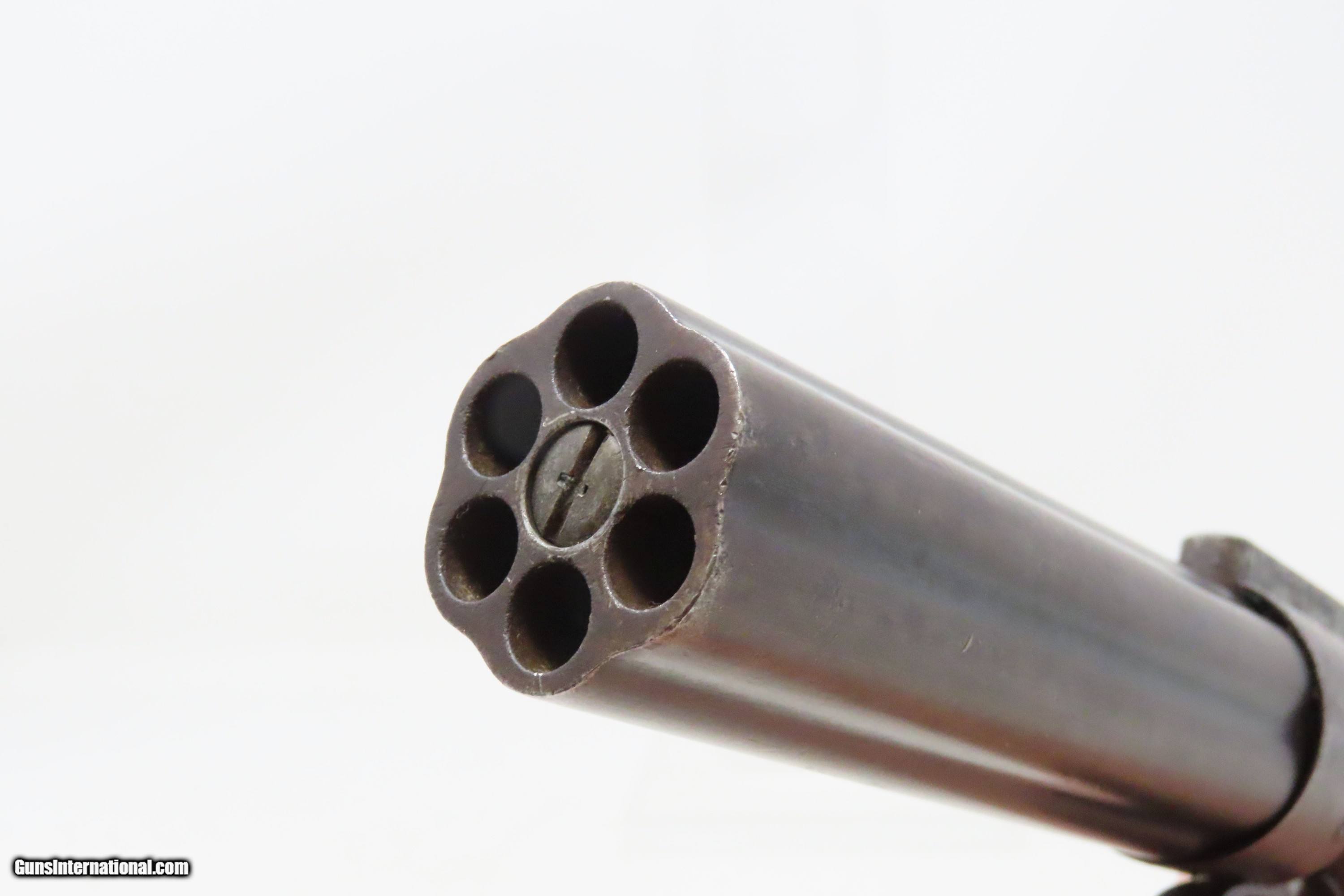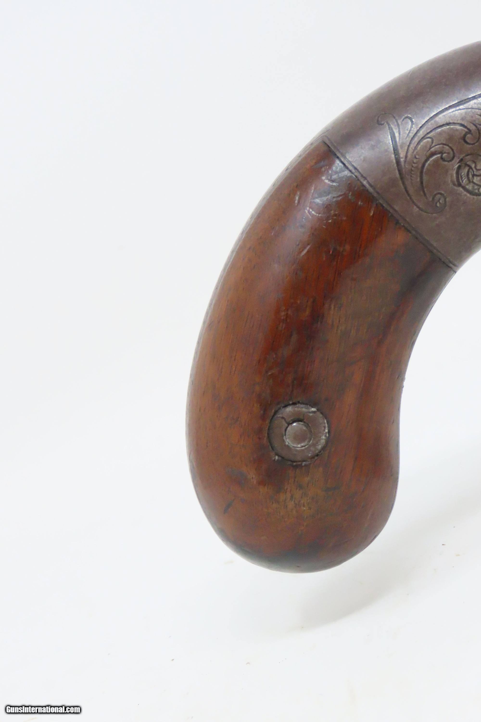 Description: GOLD RUSH Era ALLEN & THURBER Antique WORCHESTER Period PEPPERBOX Revolver ENGRAVED First DA Revolving Percussion Pistol Here we present an antique Allen & Thurber Bar Hammer 6-shot Percussion Pepperbox pistol made circa 1847 to 1856 in Worcester, Massachusetts. Only six-barrel pepperbox pistols were produced during the Grafton and Norwich periods (1837–1847), and all had smooth barrel external contours until the later Worchester and Allen and Wheelock period, when fluted barrels became the norm. Though this is a six shot, it was during the Worchester period that the five-shot pepperbox was introduced. Percussion nipples were integrated to the barrels. Made with a bar hammer and standard trigger, models have been encountered with or without an integral nipple shield. While simplifying shooting (no manual cocking of the hammer), the bar hammer did preclude the inclusion of usable sights. However, this early example of a double-action pistol must have been quite a selling point. As these were considered “point and shoot” short range defensive weapons or “belly guns”, the market did not seem to object to the limitation of not having sights. Ethan Allen was already a prolific inventor and successful businessman in the 1830s when he came up with this design. This percussion, six-shot, double-action pocket revolver was a very popular pistol that was produced in Worcester, Massachusetts. It’s a 31-caliber pepperbox with a revolving screw off fluted barrel and has factory engravings in a floral motif executed on both sides of the frame. Made from 1847-1856, these pistols enjoyed even greater popularity than Sam Colt’s first pistol. The history that these pistols enjoyed over the years is astounding: the Seminole Wars, Gold Rush, Mexican War and American Civil War. These guns are true relics of American history. The overall condition is good. Engraved frame. The action is strong. All bores are in good shape. Solid grips with light handling wear. Legible markings. Original dark brown patina. Own the original! This is a legitimate antique and not a reproduction. Barrel is 4-1/4 inches. Caliber: .31 Percussion Overall condition as seen in photos. Very Fast. Very Safe. FREE SHIPPING WORLDWIDE. Delivered directly to your door by express mail! Guaranteed AUTHENTIC & Includes CERTIFICATE OF AUTHENTICITY. ancestryguns $1200 #233842 SOLD Antique: Yes |