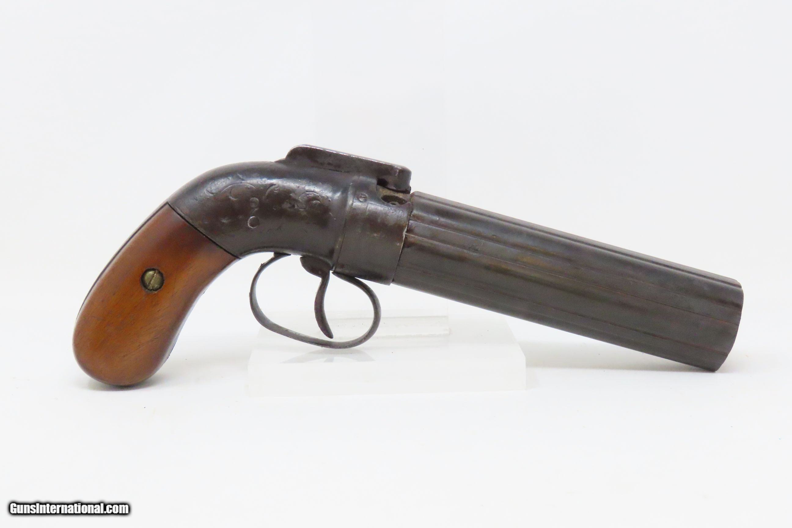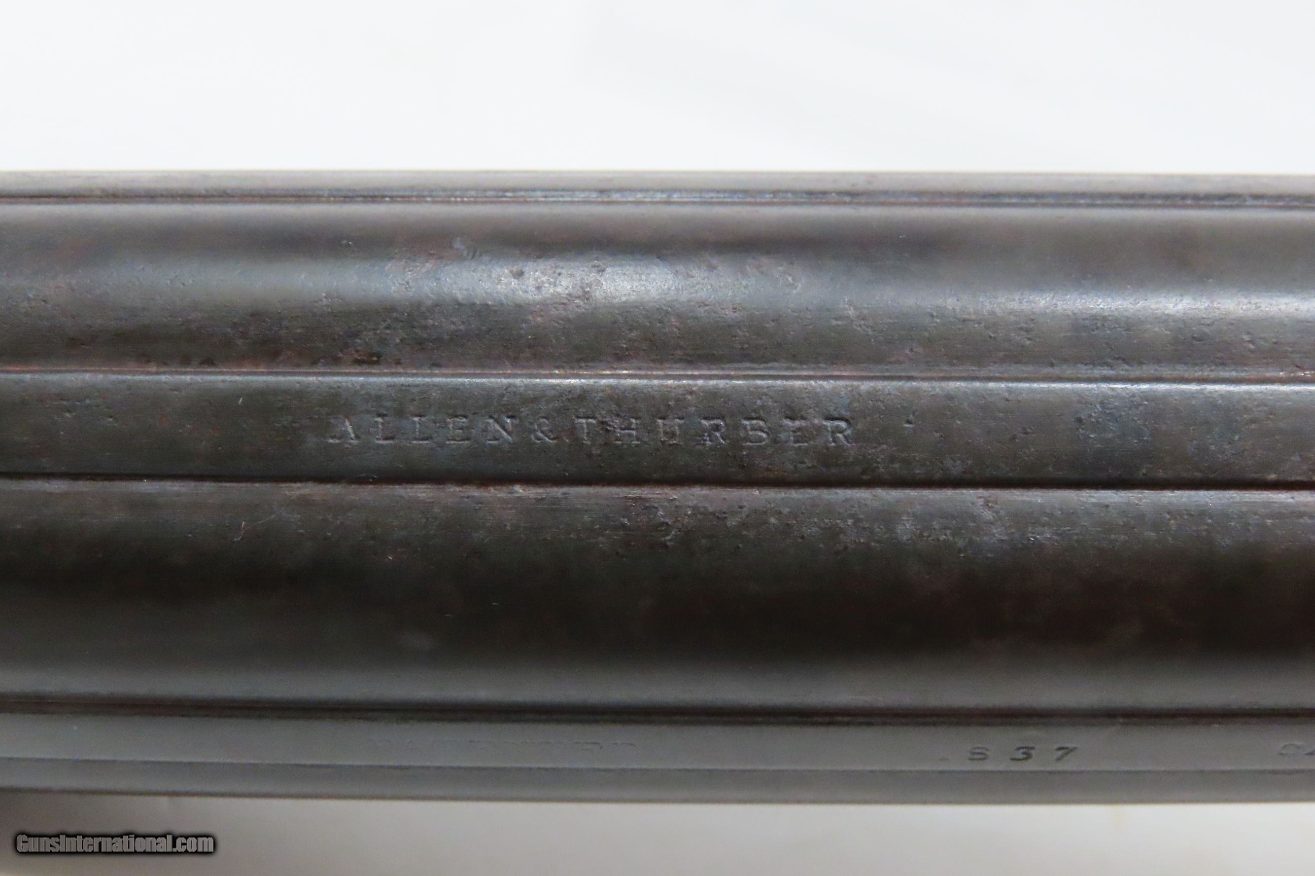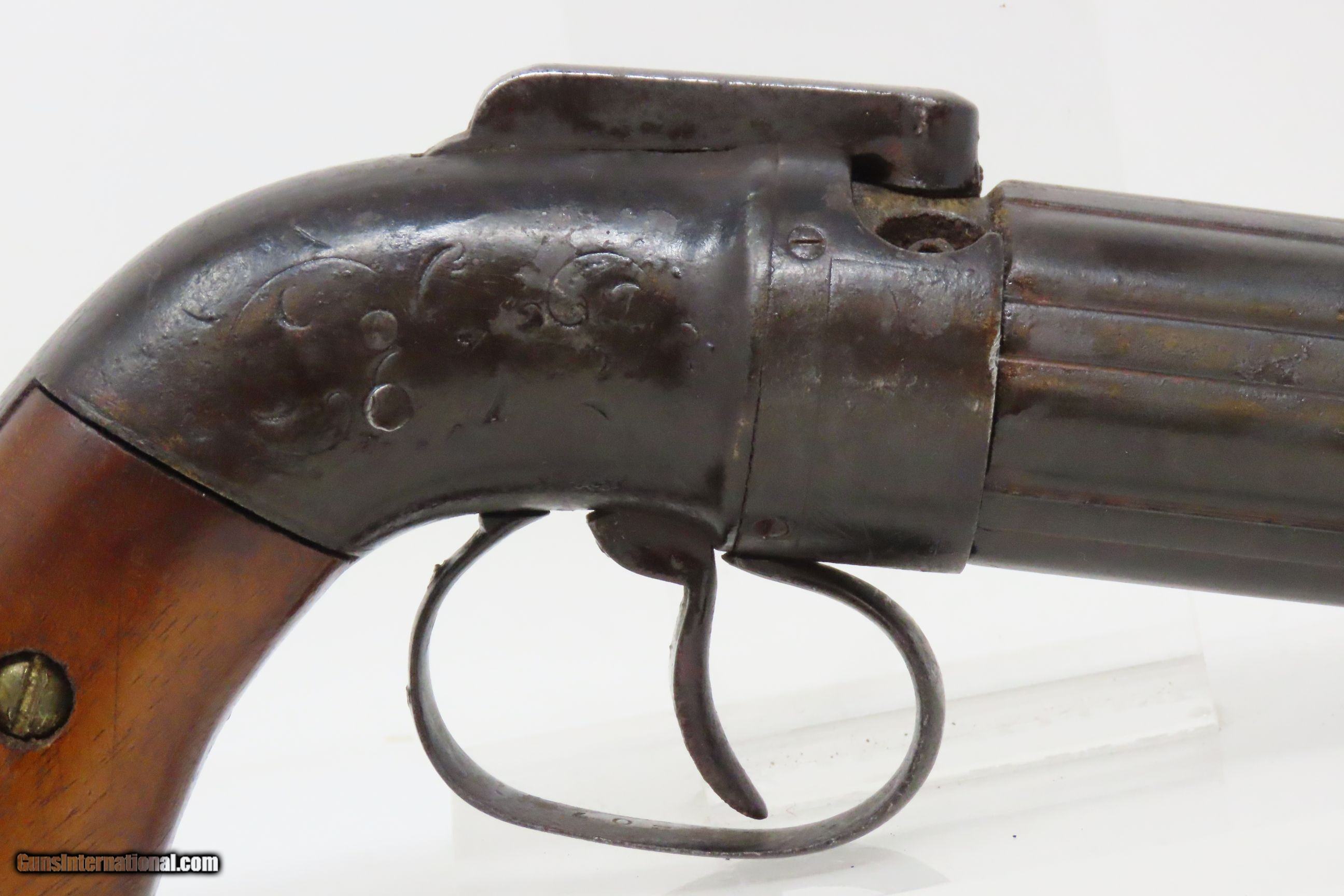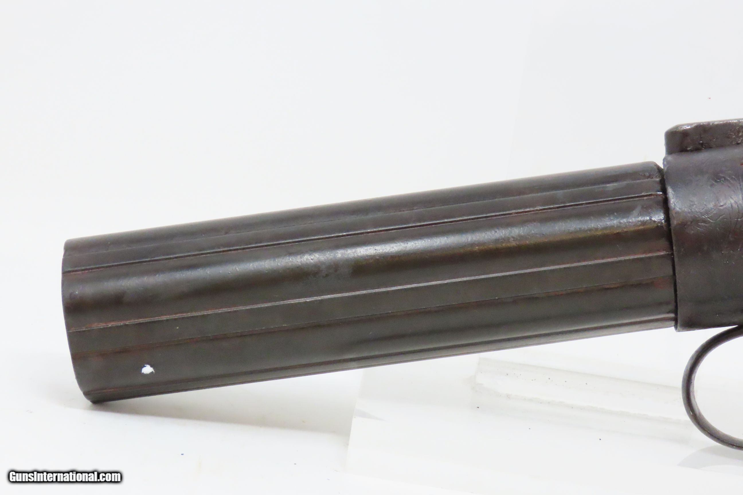Description: GOLD RUSH Era ALLEN & THURBER Antique WORCHESTER Period Revolver PEPPERBOX ENGRAVED First DA Revolving Percussion Pistol Here we present an antique Allen & Thurber Bar Hammer 6-shot Percussion Pepperbox pistol made circa 1847 to 1856 in Worcester, Massachusetts. Only six-barrel pepperbox pistols were produced during the Grafton and Norwich periods (1837–1847), and all had smooth barrel external contours until the later Worchester and Allen and Wheelock period, when fluted barrels became the norm. Though this is a six shot, it was during the Worchester period that the five-shot pepperbox was introduced. Percussion nipples were integrated to the barrels. Made with a bar hammer and standard trigger, models have been encountered with or without an integral nipple shield. While simplifying shooting (no manual cocking of the hammer), the bar hammer did preclude the inclusion of usable sights. However, this early example of a double-action pistol must have been quite a selling point. As these were considered “point and shoot” short range defensive weapons or “belly guns”, the market did not seem to object to the limitation of not having sights. Ethan Allen was already a prolific inventor and successful businessman in the 1830s when he came up with this design. This percussion, six-shot, double-action pocket revolver was a very popular pistol that was produced in Worcester, Massachusetts. It’s a 36-caliber pepperbox with a revolving screw off fluted barrel and has factory engravings in a floral motif executed on both sides of the frame. Made from 1847-1856, these pistols enjoyed even greater popularity than Sam Colt’s first pistol. The history that these pistols enjoyed over the years is astounding: the Seminole Wars, Gold Rush, Mexican War and American Civil War. These guns are true relics of American history. The overall condition is good. The action functions, but the cylinder intermittently indexes. The bores are in good shape for their ages. Lightly engraved frame. Both grips are in good shape. This example has been refinished. “1837” dated barrels. Visible markings are legible. Own the original! This is a legitimate antique and not a reproduction. Barrel is 5-1/8 inches. Caliber: .36 Percussion Overall condition as seen in photos. Very Fast. Very Safe. FREE SHIPPING WORLDWIDE. Delivered directly to your door by express mail! Guaranteed AUTHENTIC & Includes CERTIFICATE OF AUTHENTICITY. ancestryguns $1200 #230989 SOLD Antique: Yes |