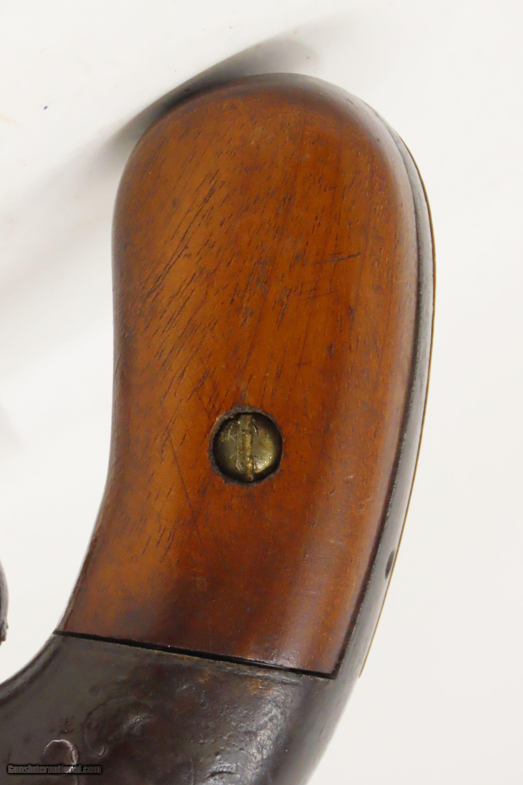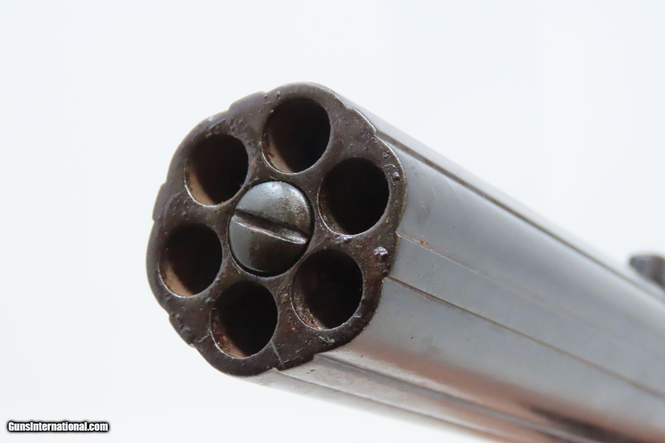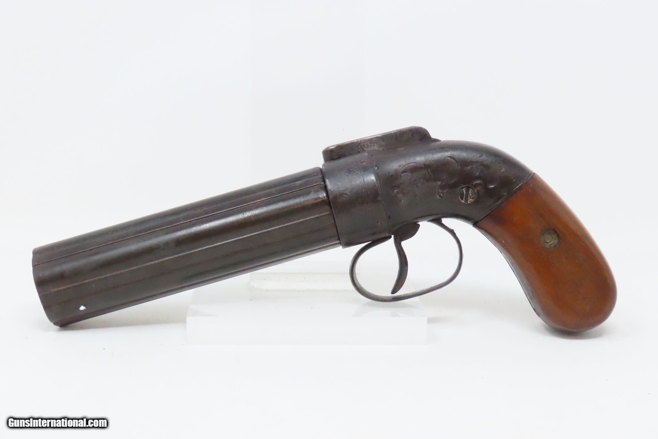 Description: GOLD RUSH Era ALLEN & THURBER Antique WORCHESTER Period Revolver PEPPERBOX ENGRAVED First DA Revolving Percussion Pistol Here we present an antique Allen & Thurber Bar Hammer 6-shot Percussion Pepperbox pistol made circa 1847 to 1856 in Worcester, Massachusetts. Only six-barrel pepperbox pistols were produced during the Grafton and Norwich periods (1837–1847), and all had smooth barrel external contours until the later Worchester and Allen and Wheelock period, when fluted barrels became the norm. Though this is a six shot, it was during the Worchester period that the five-shot pepperbox was introduced. Percussion nipples were integrated to the barrels. Made with a bar hammer and standard trigger, models have been encountered with or without an integral nipple shield. While simplifying shooting (no manual cocking of the hammer), the bar hammer did preclude the inclusion of usable sights. However, this early example of a double-action pistol must have been quite a selling point. As these were considered “point and shoot” short range defensive weapons or “belly guns”, the market did not seem to object to the limitation of not having sights. Ethan Allen was already a prolific inventor and successful businessman in the 1830s when he came up with this design. This percussion, six-shot, double-action pocket revolver was a very popular pistol that was produced in Worcester, Massachusetts. It’s a 36-caliber pepperbox with a revolving screw off fluted barrel and has factory engravings in a floral motif executed on both sides of the frame. Made from 1847-1856, these pistols enjoyed even greater popularity than Sam Colt’s first pistol. The history that these pistols enjoyed over the years is astounding: the Seminole Wars, Gold Rush, Mexican War and American Civil War. These guns are true relics of American history. The overall condition is good. The action functions, but the cylinder intermittently indexes. The bores are in good shape for their ages. Lightly engraved frame. Both grips are in good shape. This example has been refinished. “1837” dated barrels. Visible markings are legible. Own the original! This is a legitimate antique and not a reproduction. Barrel is 5-1/8 inches. Caliber: .36 Percussion Overall condition as seen in photos. Very Fast. Very Safe. FREE SHIPPING WORLDWIDE. Delivered directly to your door by express mail! Guaranteed AUTHENTIC & Includes CERTIFICATE OF AUTHENTICITY. ancestryguns $1200 #230989 SOLD Antique: Yes |